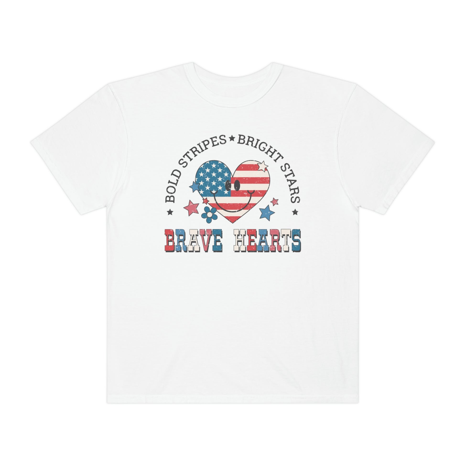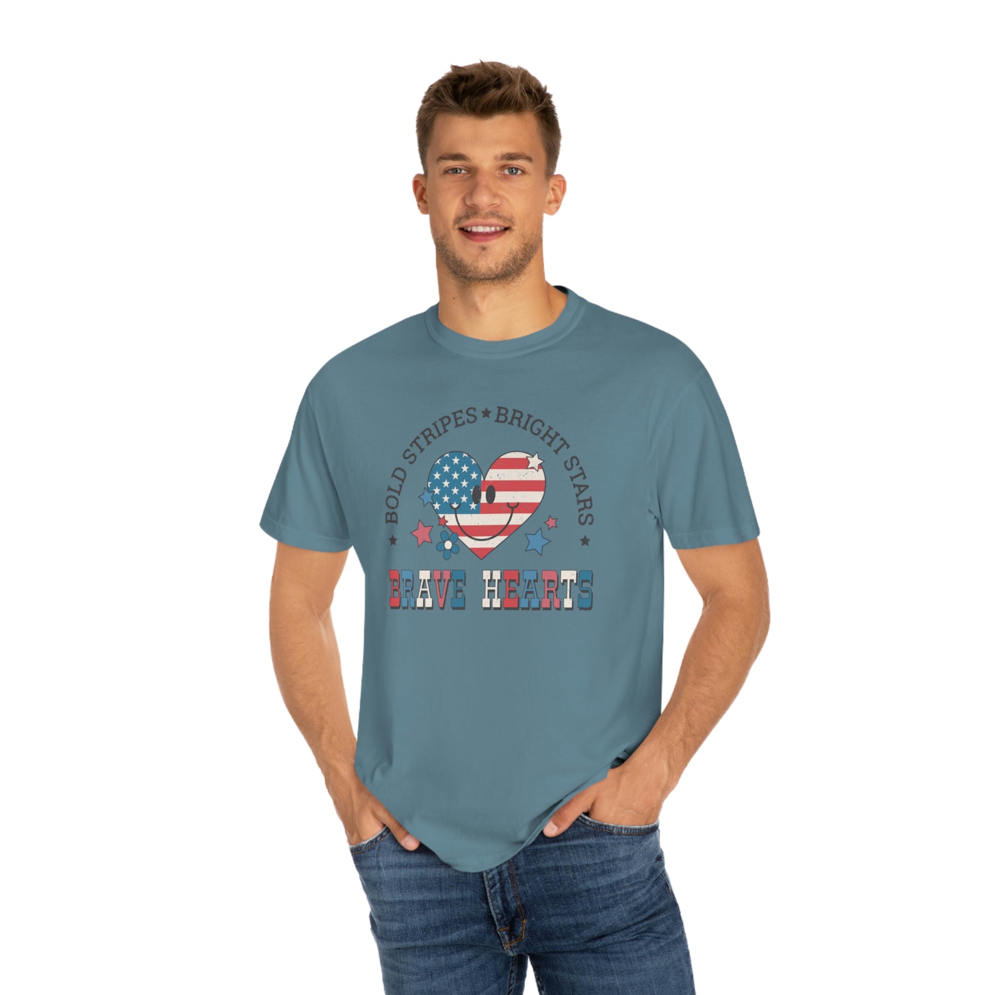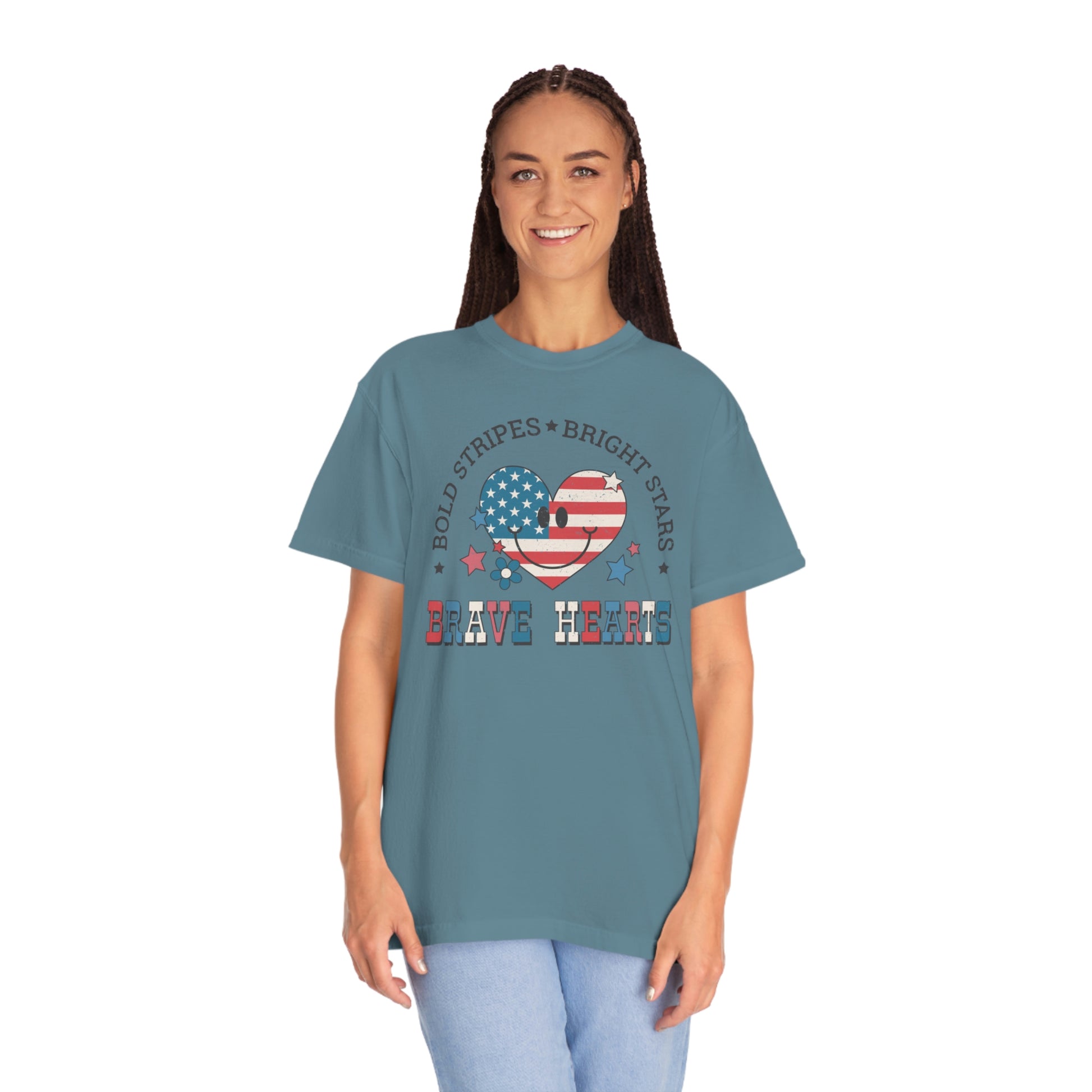 Our limited edition 4th of July Brave Hearts Comfort Colors shirt is perfect for any Patriots lover! Featuring a vibrant design of a heart with a bald eagle and the American Flag, this t-shirt is made of soft, preshrunk cotton that is sure to keep you comfortable all day long. A great addition to your holiday wardrobe and a reminder of your love and admiration for the United States of America! Let your patriotism fly and show off this one of kind design with pride. Makes a great gift for Memorial  Day, Independance Day, Labor Day or any festive Summer BBQ.