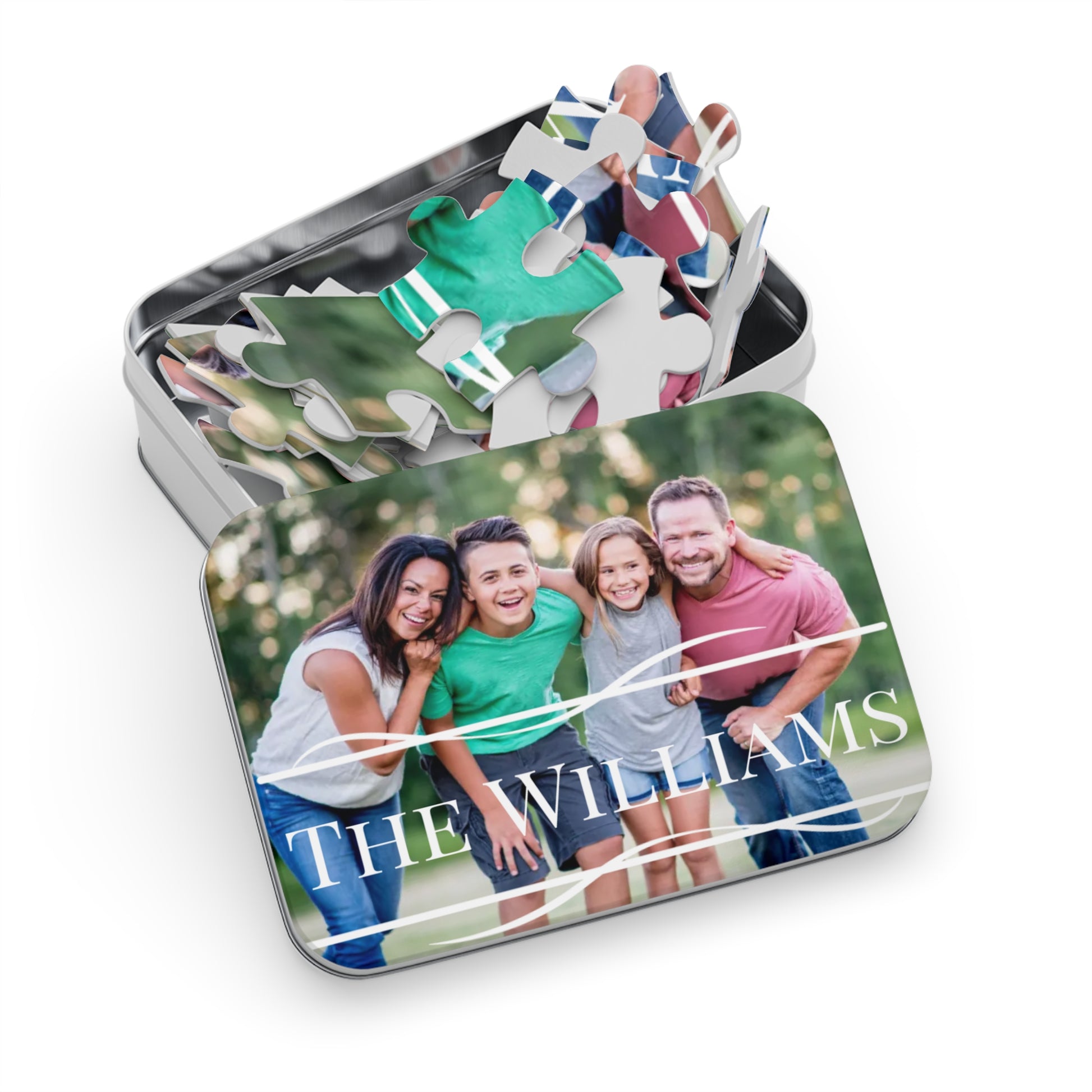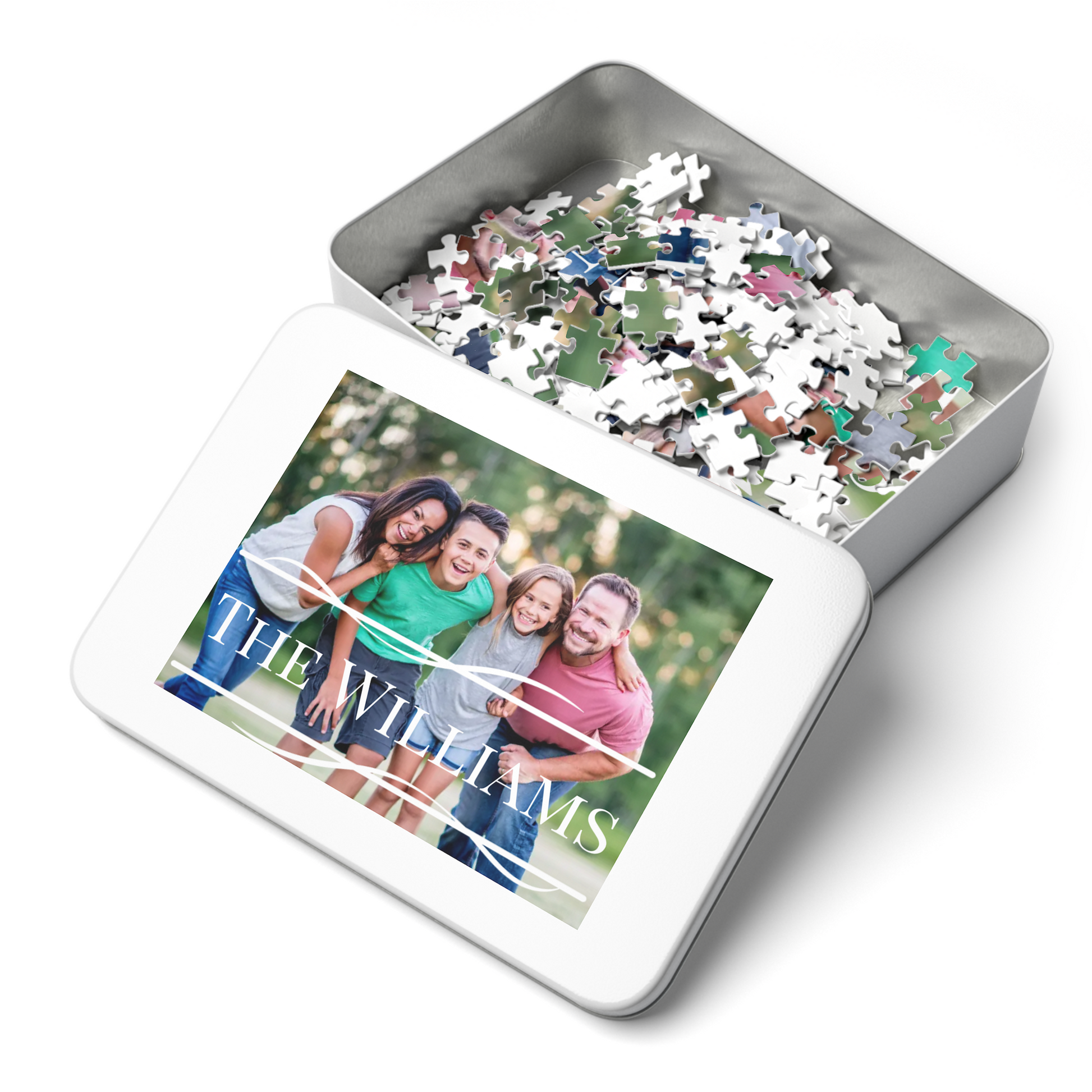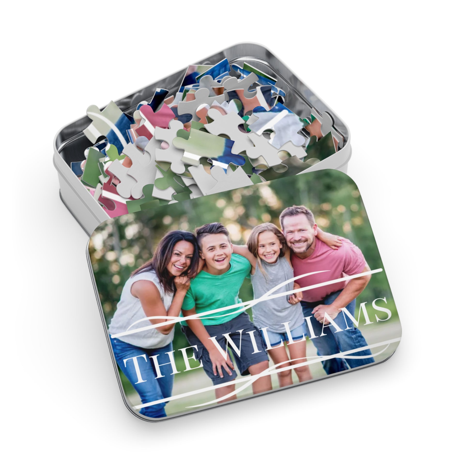 Cherish your family photos in a fun new way with our Custom Family Photo and Name Jigsaw Puzzle with Tin. A personalized jigsaw puzzle will deliver wholesome downtime for friends and family. Made with high-quality chipboard pieces, our puzzles come in 30, 110, 252, 500, 1000, and 2,000 piece variations. Makes the perfect, personalized gift for holidays, birthdays, anniversaries, Mother's or Father's Day.
