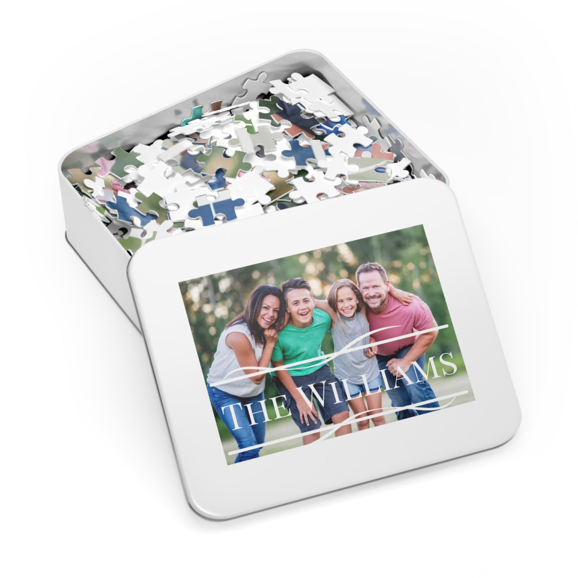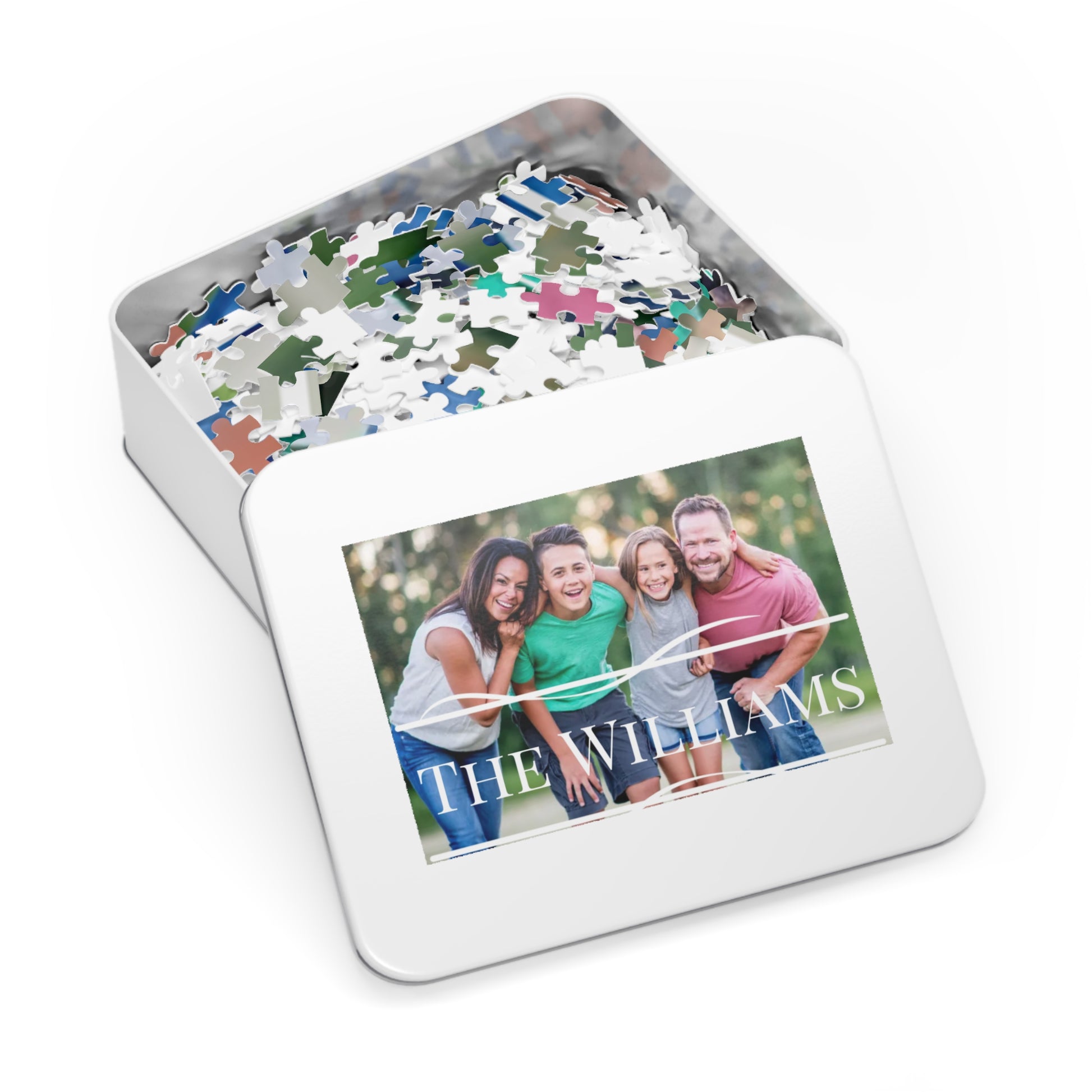 Custom Family Photo and Name Jigsaw Puzzle with Tin