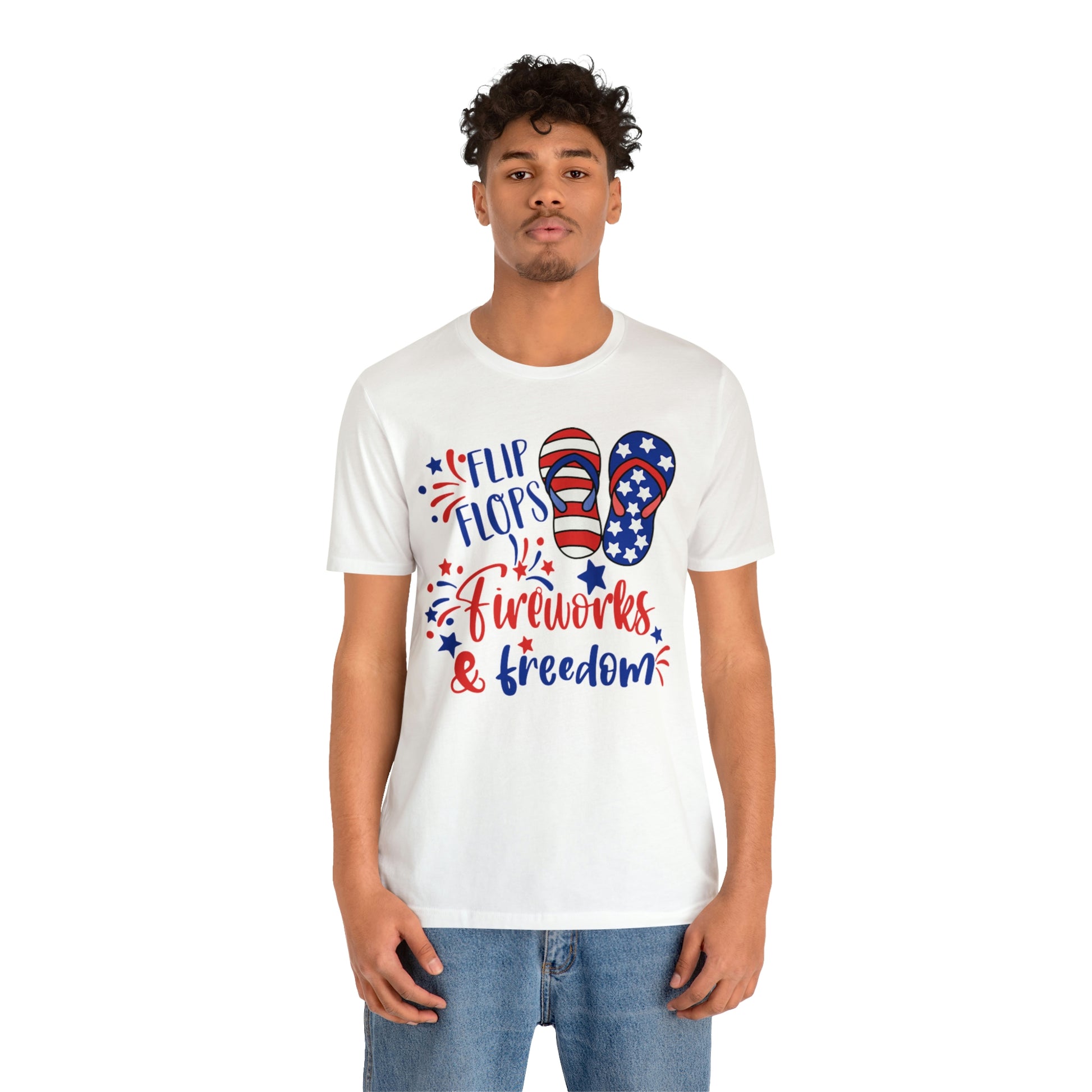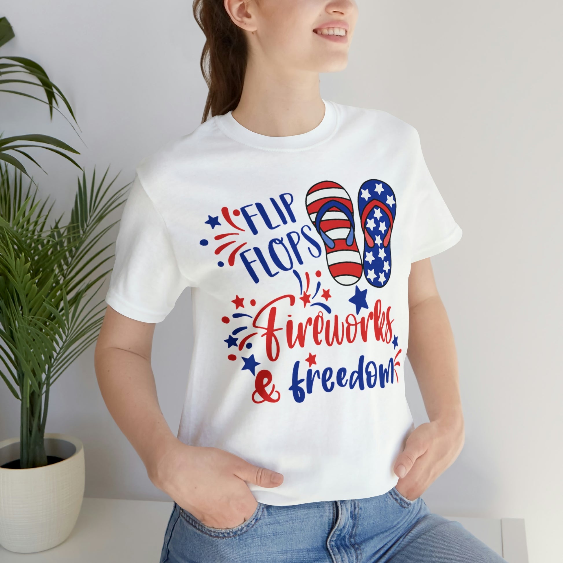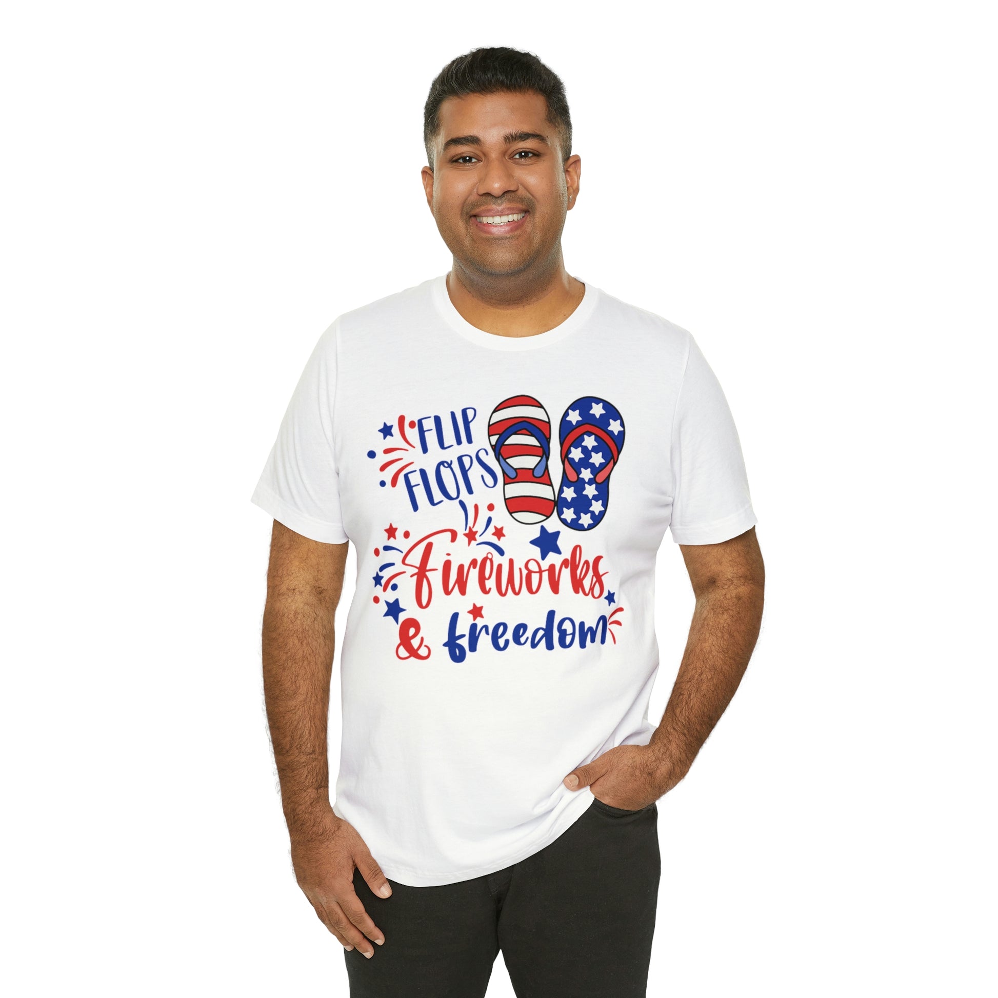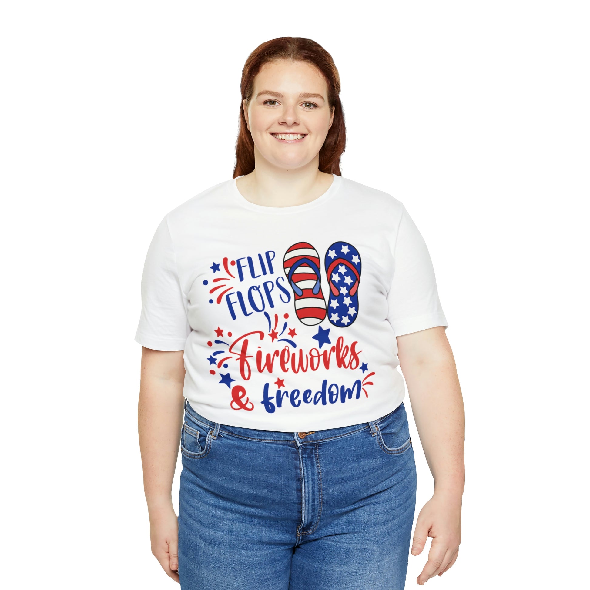 This Flip Flops Fireworks and Freedom shirt is the perfect summer look! It features a crisp white background, with bold blue lettering and colorful fireworks, to celebrate all that freedom stands for. This comfortable t-shirt looks great with shorts, sandals and sunnies, and dress it up with accessories for the nighttime. Fireworks, flip flops and freedom is a great way to show your independence and embrace the summer heat.