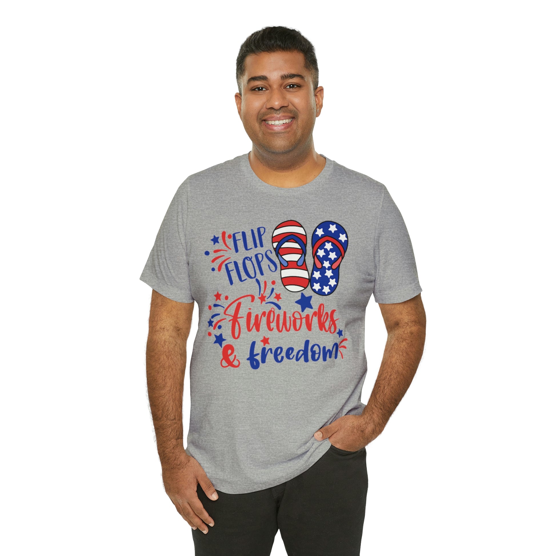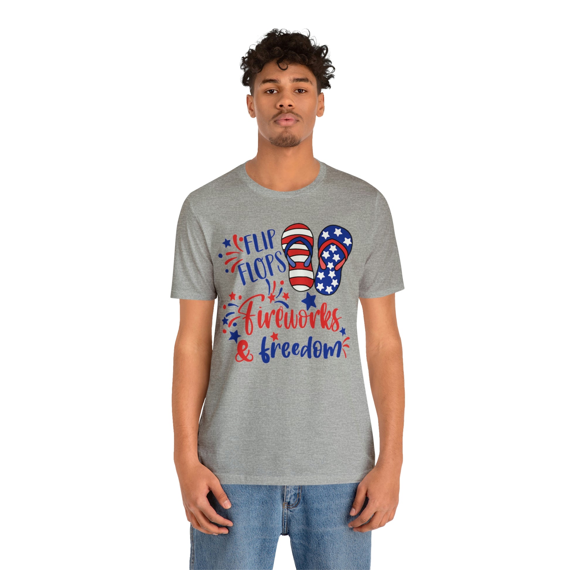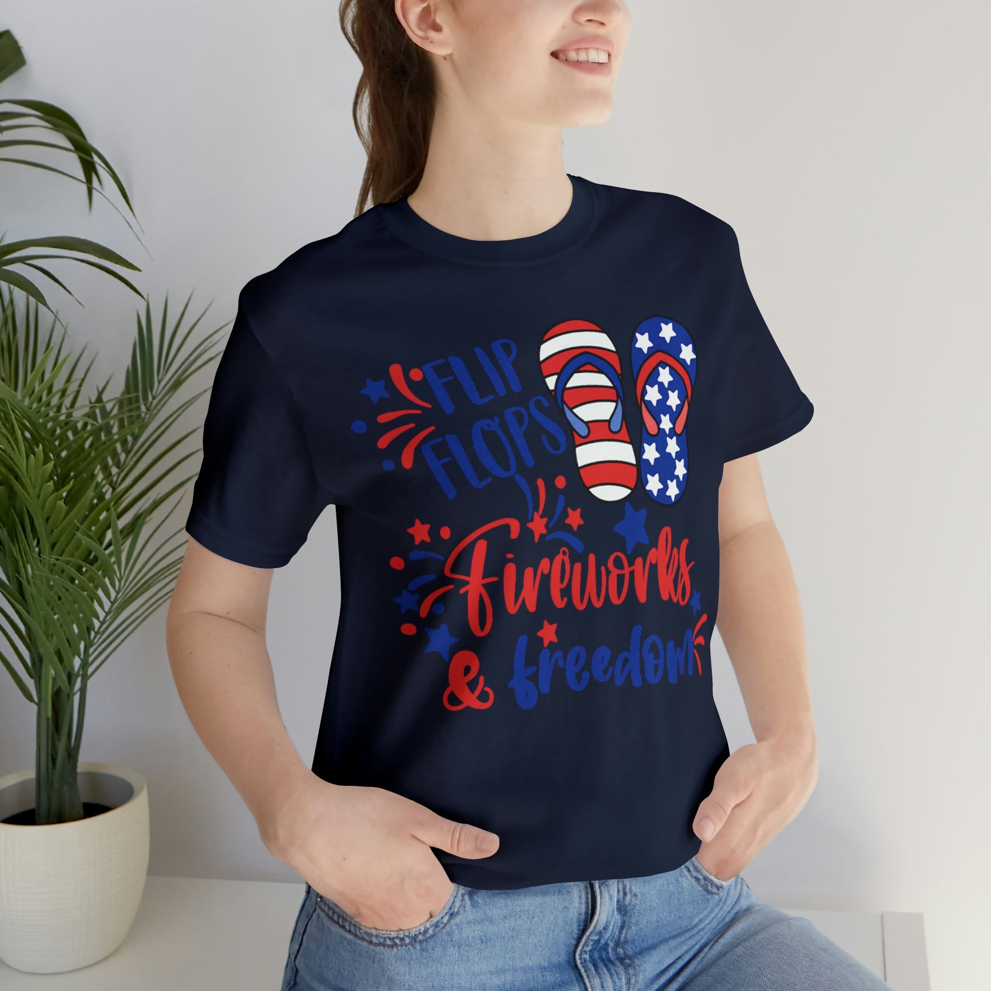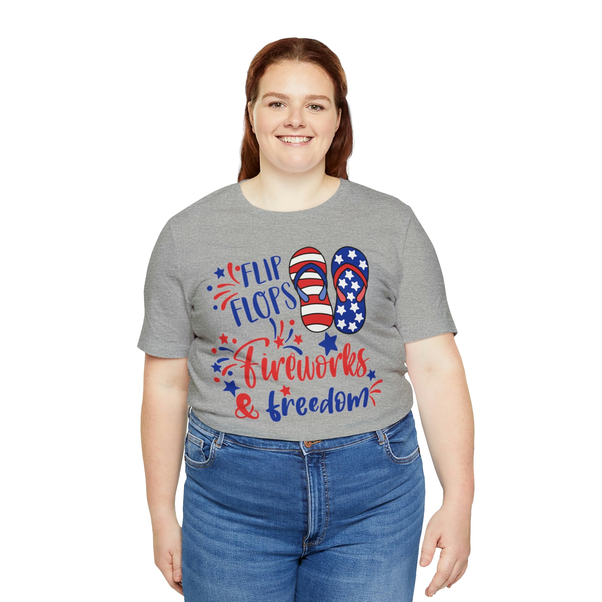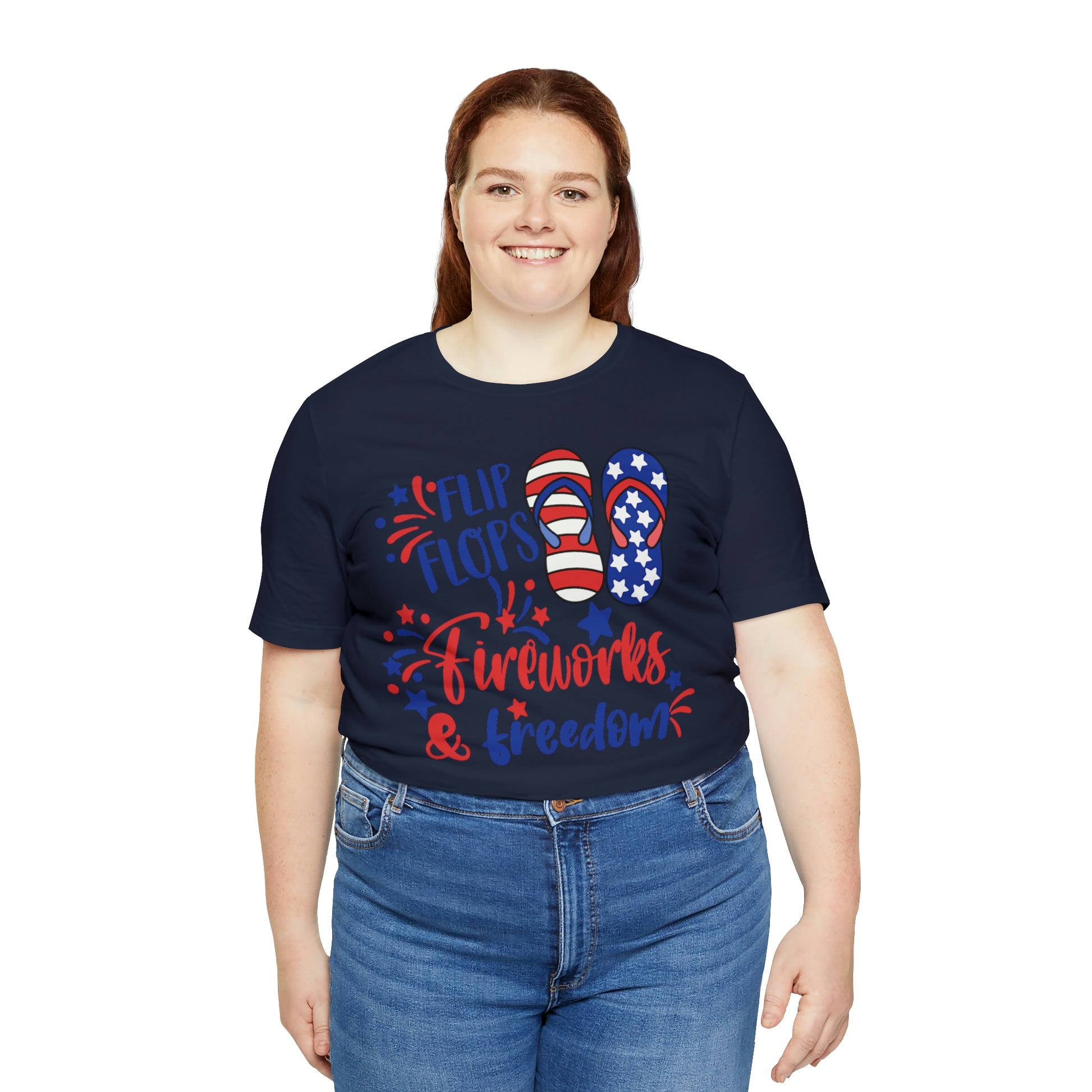 This Flip Flops Fireworks and Freedom shirt is the perfect summer look! It features a crisp white background, with bold blue lettering and colorful fireworks, to celebrate all that freedom stands for. This comfortable t-shirt looks great with shorts, sandals and sunnies, and dress it up with accessories for the nighttime. Fireworks, flip flops and freedom is a great way to show your independence and embrace the summer heat.