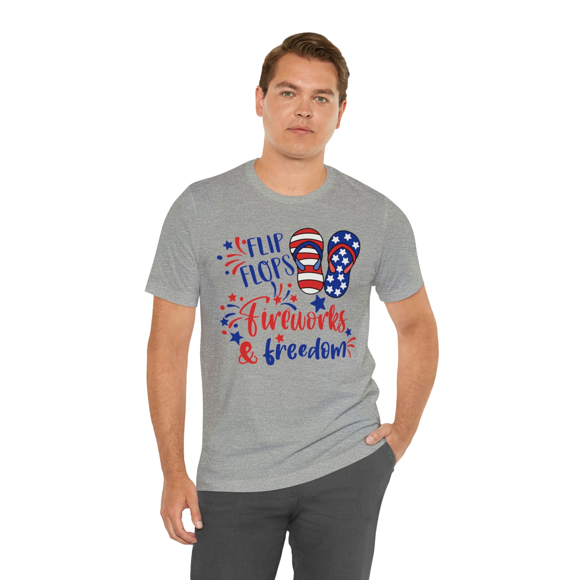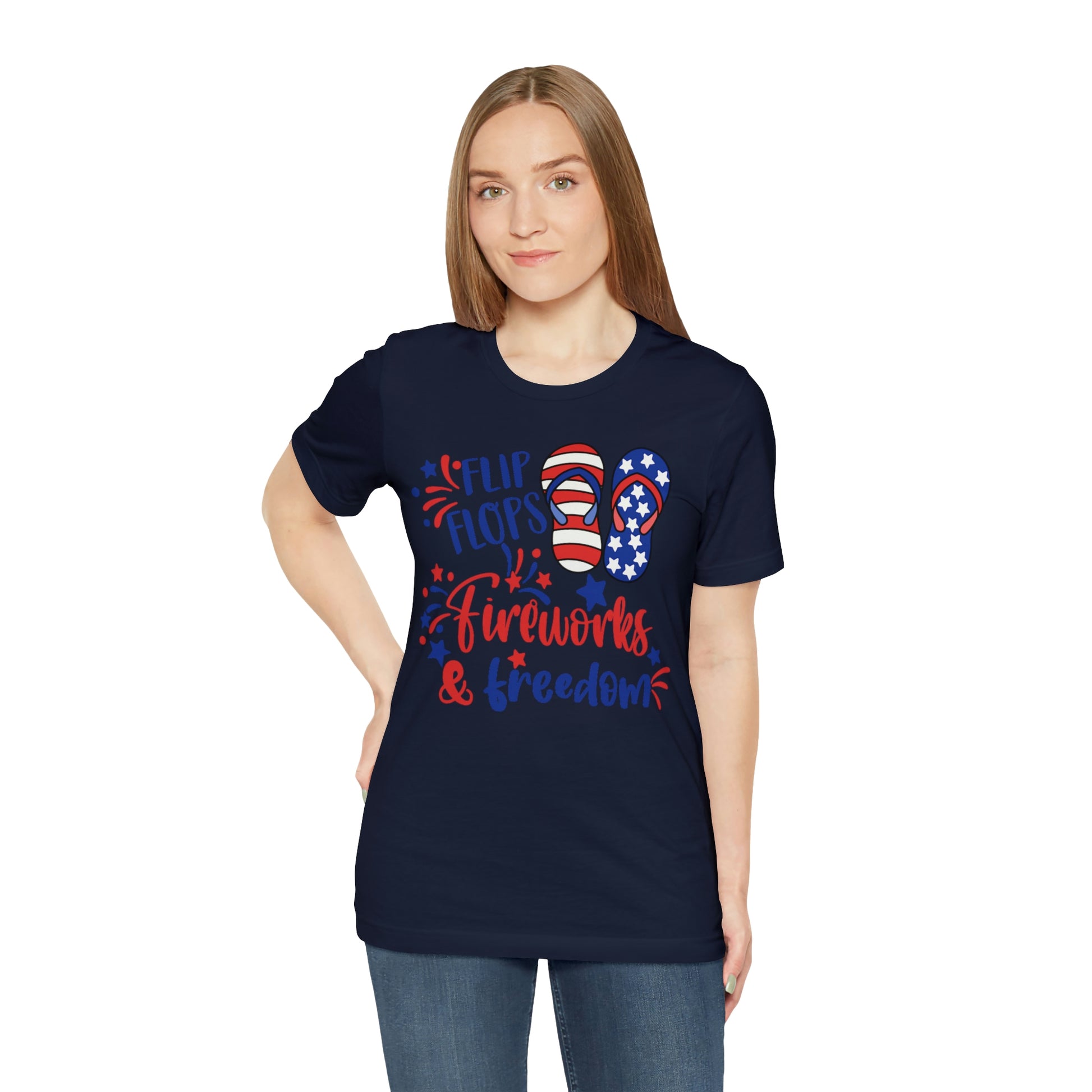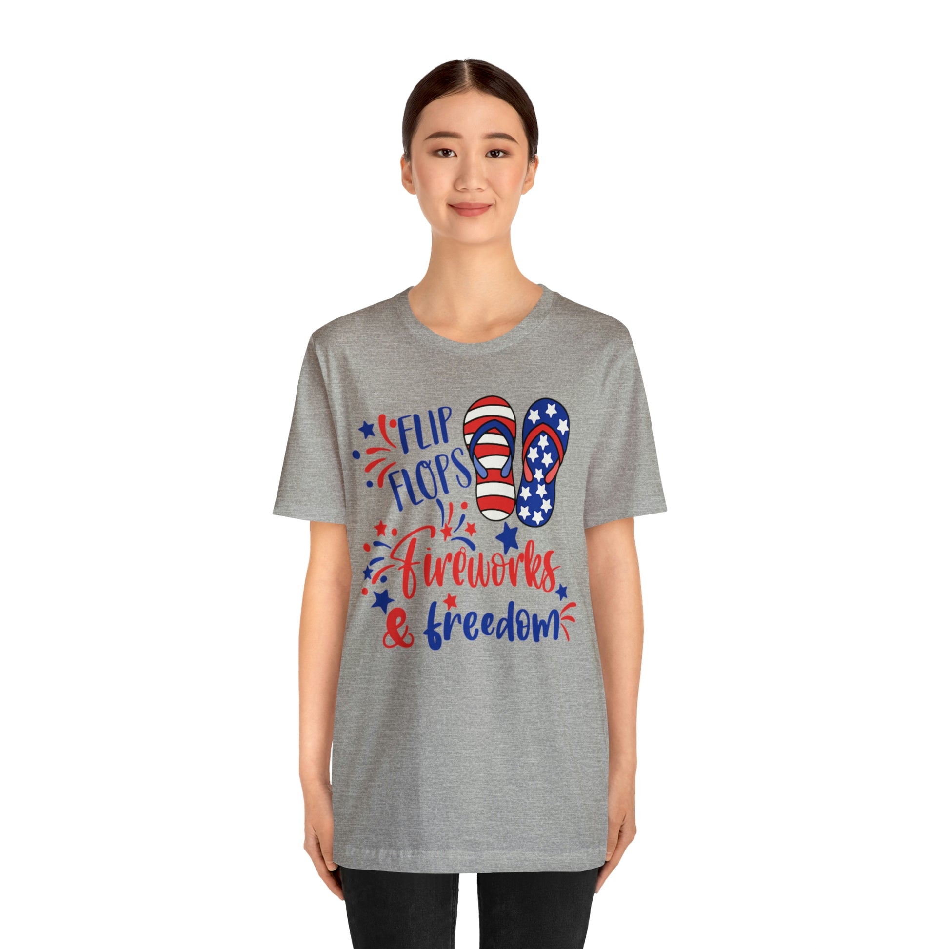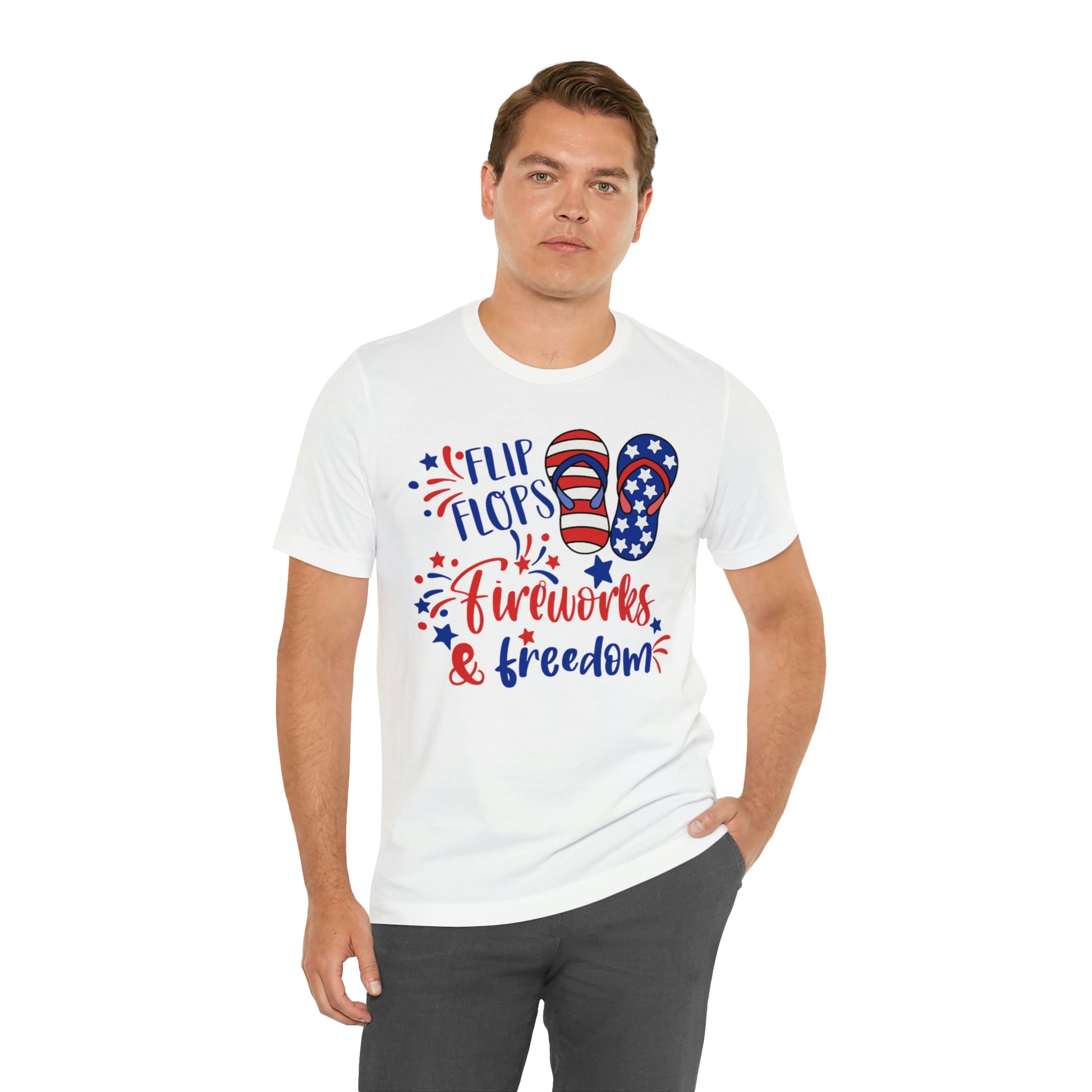 This Flip Flops Fireworks and Freedom shirt is the perfect summer look! It features a crisp white background, with bold blue lettering and colorful fireworks, to celebrate all that freedom stands for. This comfortable t-shirt looks great with shorts, sandals and sunnies, and dress it up with accessories for the nighttime. Fireworks, flip flops and freedom is a great way to show your independence and embrace the summer heat.