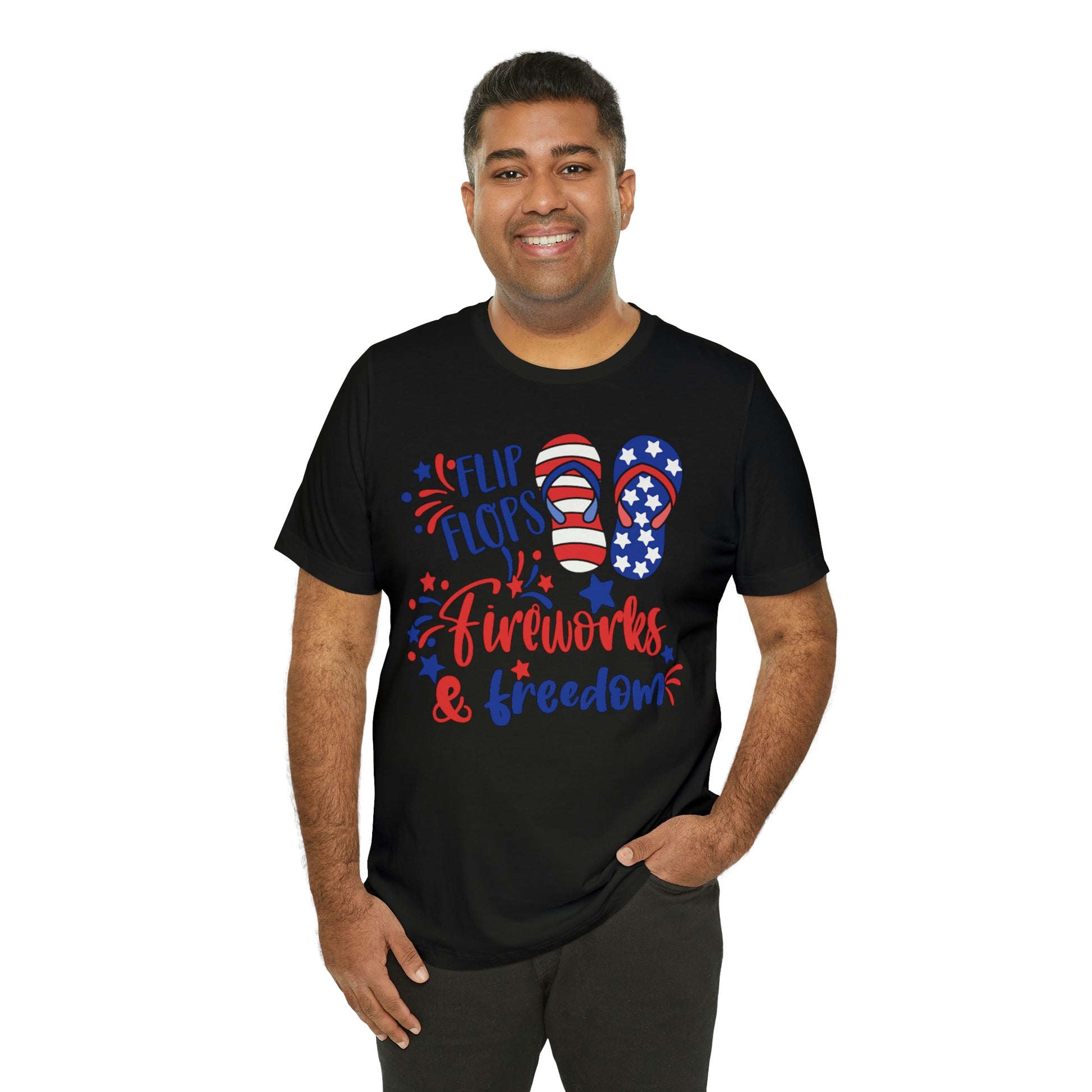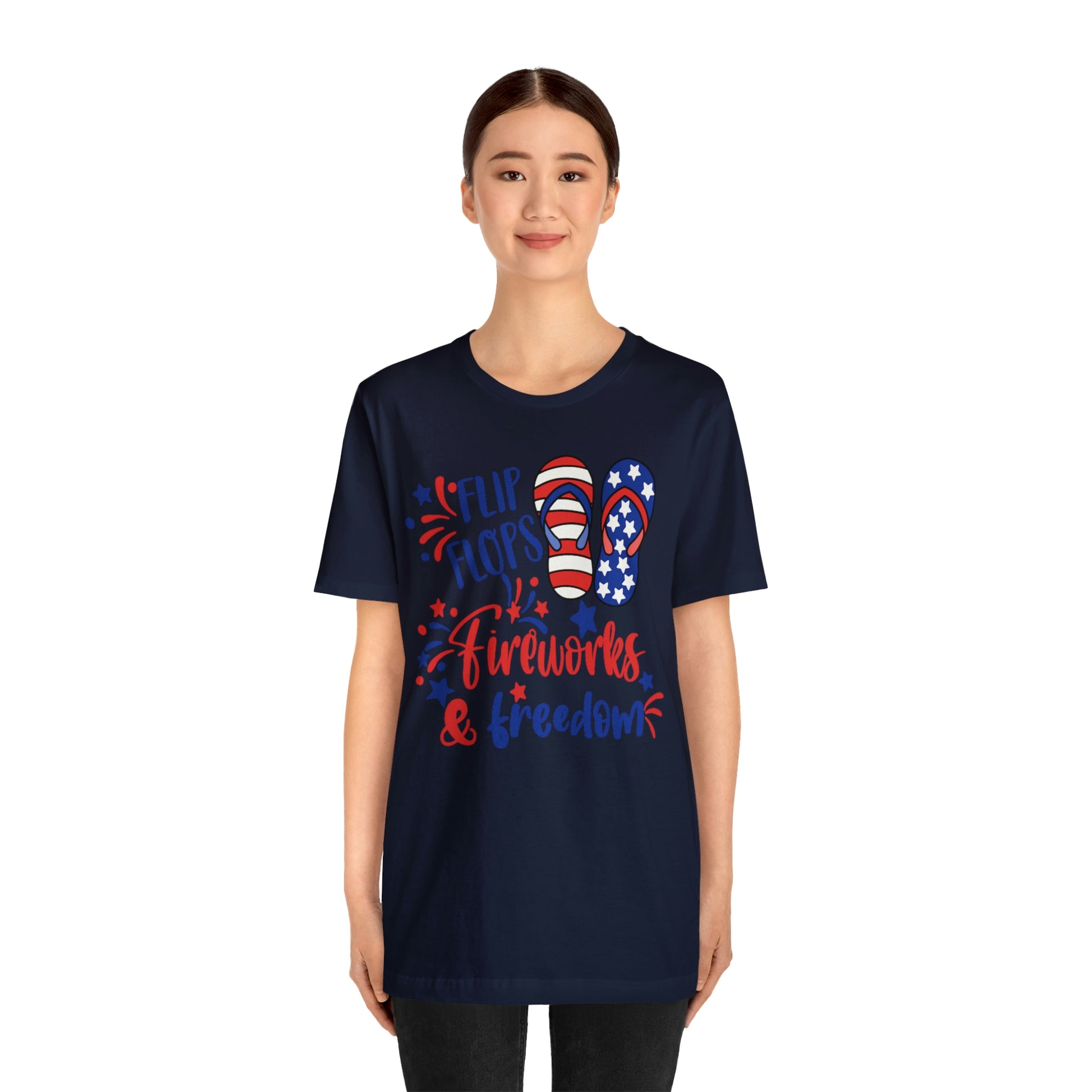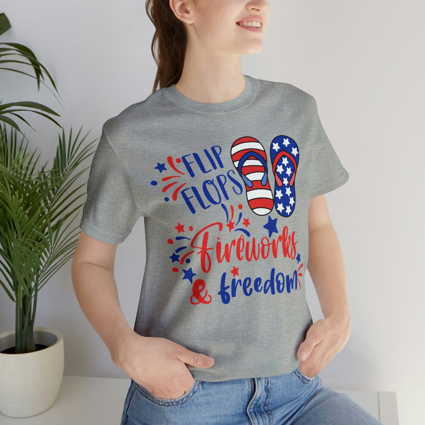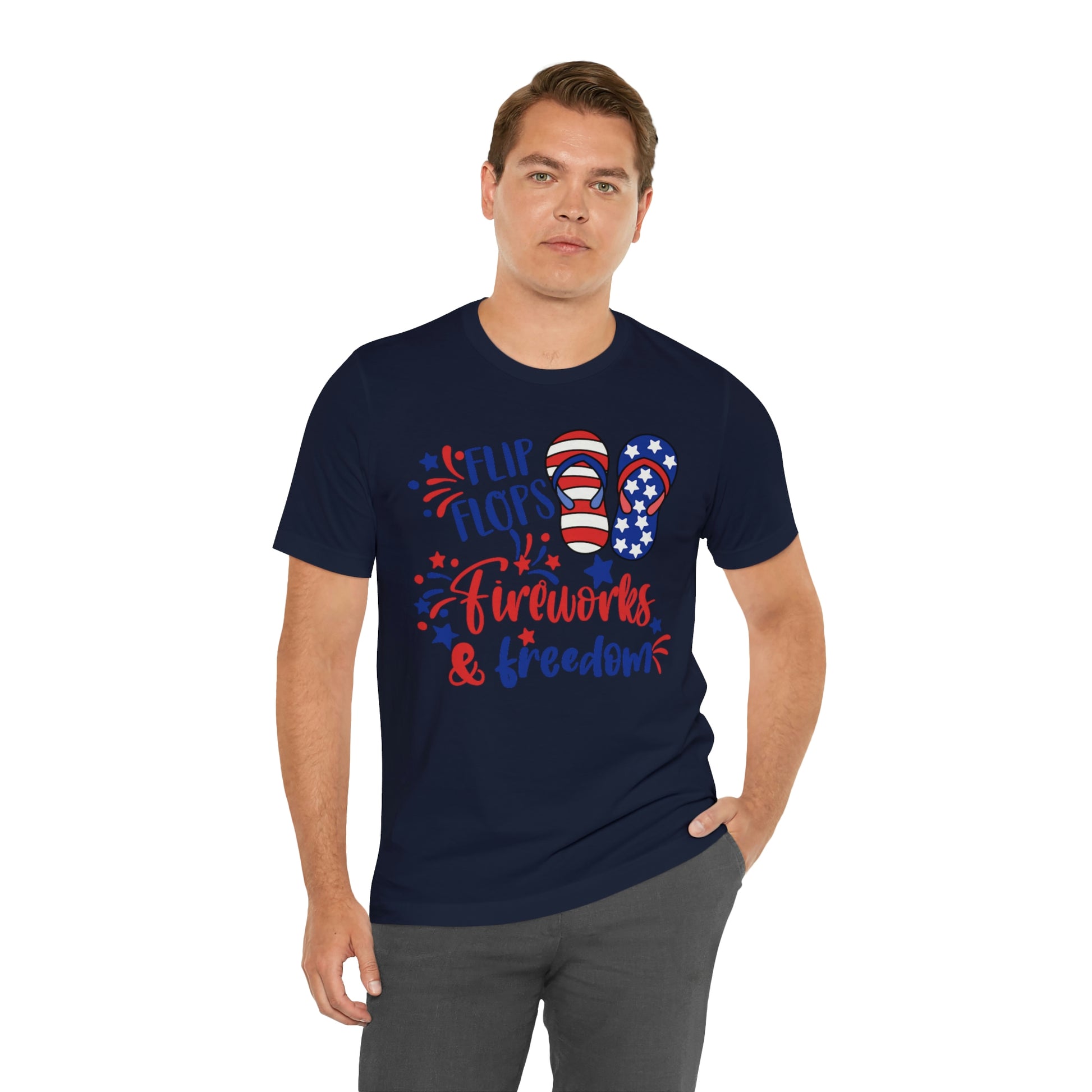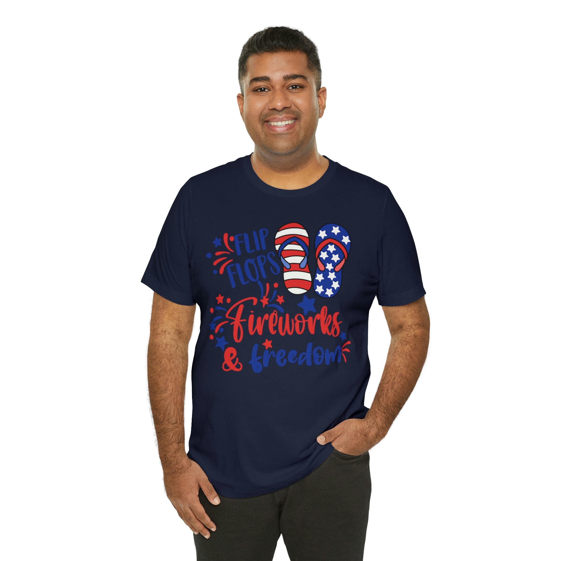 This Flip Flops Fireworks and Freedom shirt is the perfect summer look! It features a crisp white background, with bold blue lettering and colorful fireworks, to celebrate all that freedom stands for. This comfortable t-shirt looks great with shorts, sandals and sunnies, and dress it up with accessories for the nighttime. Fireworks, flip flops and freedom is a great way to show your independence and embrace the summer heat.