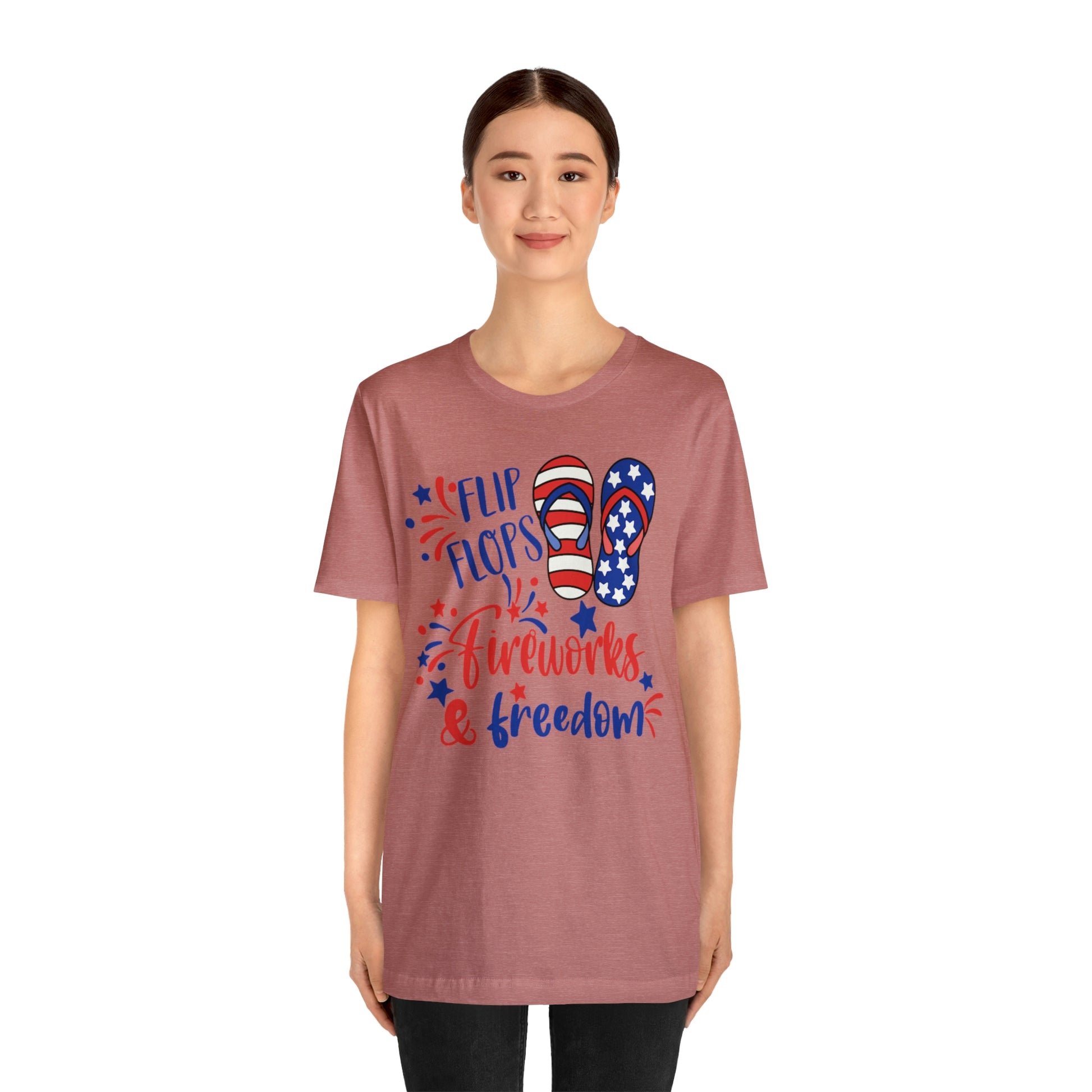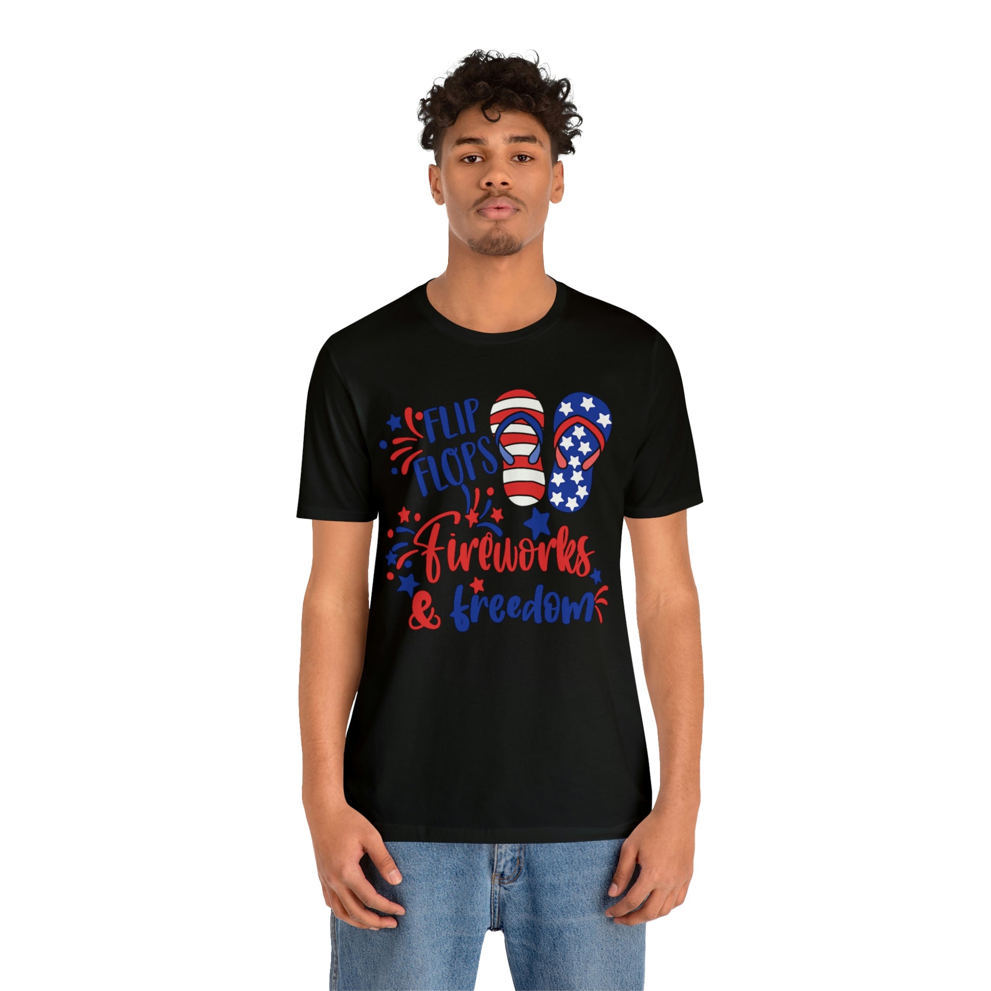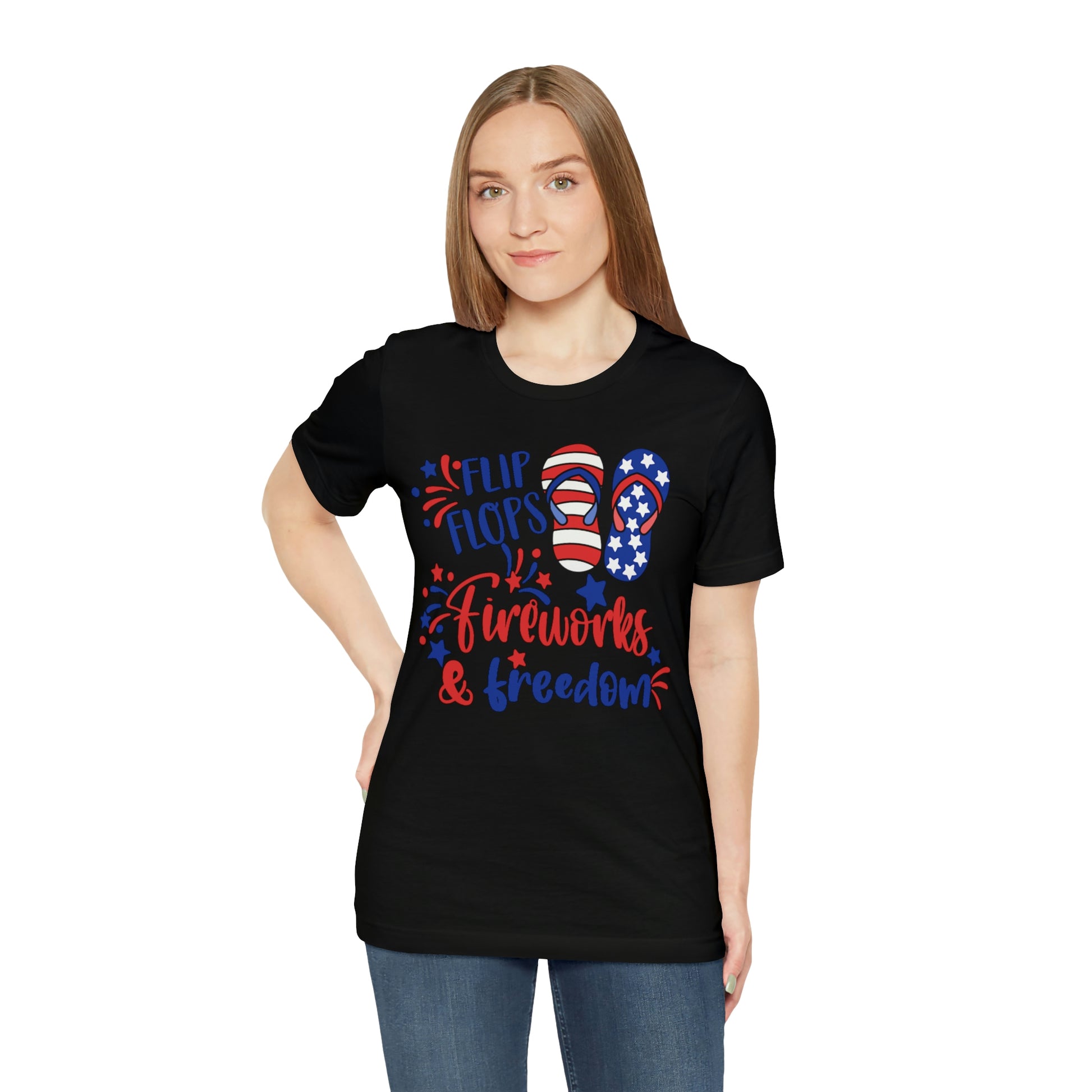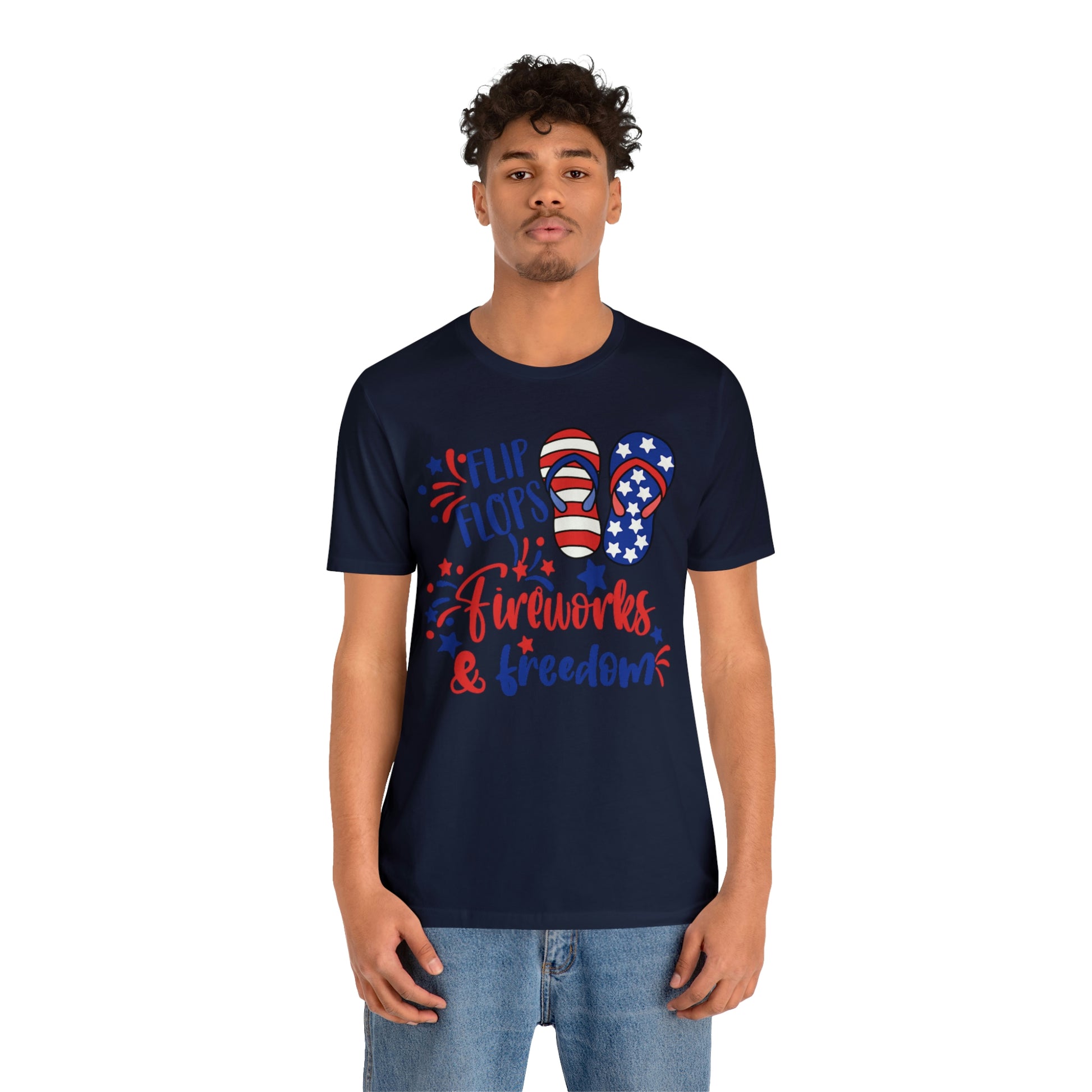 This Flip Flops Fireworks and Freedom shirt is the perfect summer look! It features a crisp white background, with bold blue lettering and colorful fireworks, to celebrate all that freedom stands for. This comfortable t-shirt looks great with shorts, sandals and sunnies, and dress it up with accessories for the nighttime. Fireworks, flip flops and freedom is a great way to show your independence and embrace the summer heat.