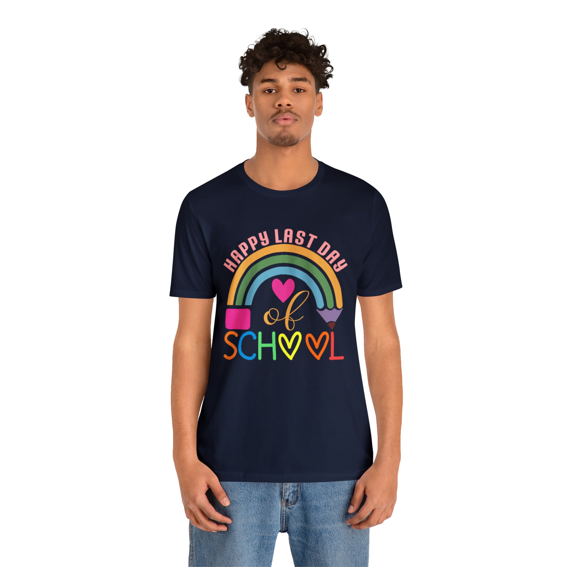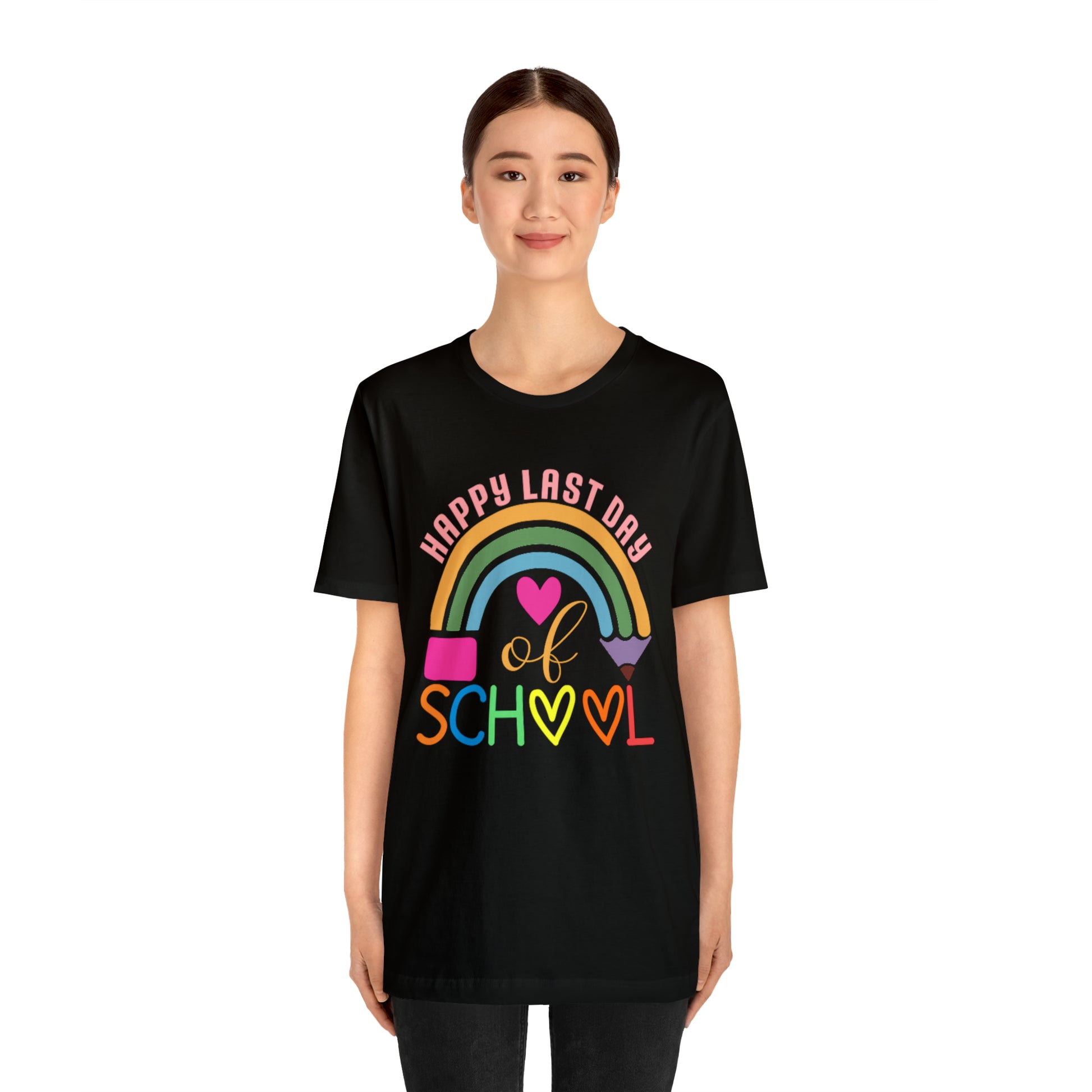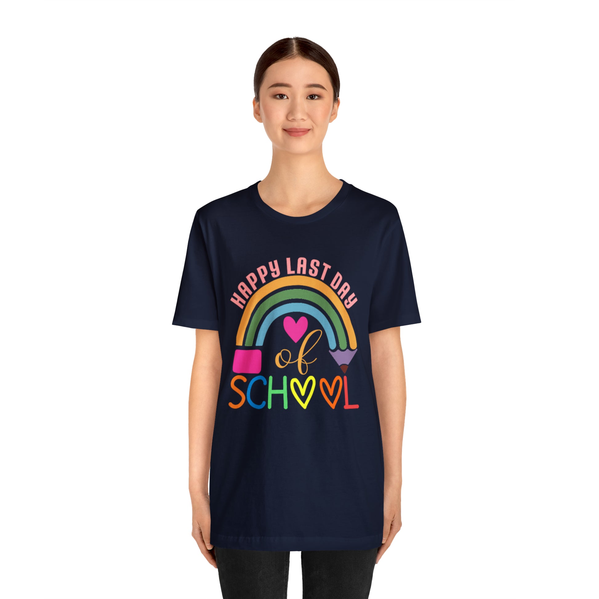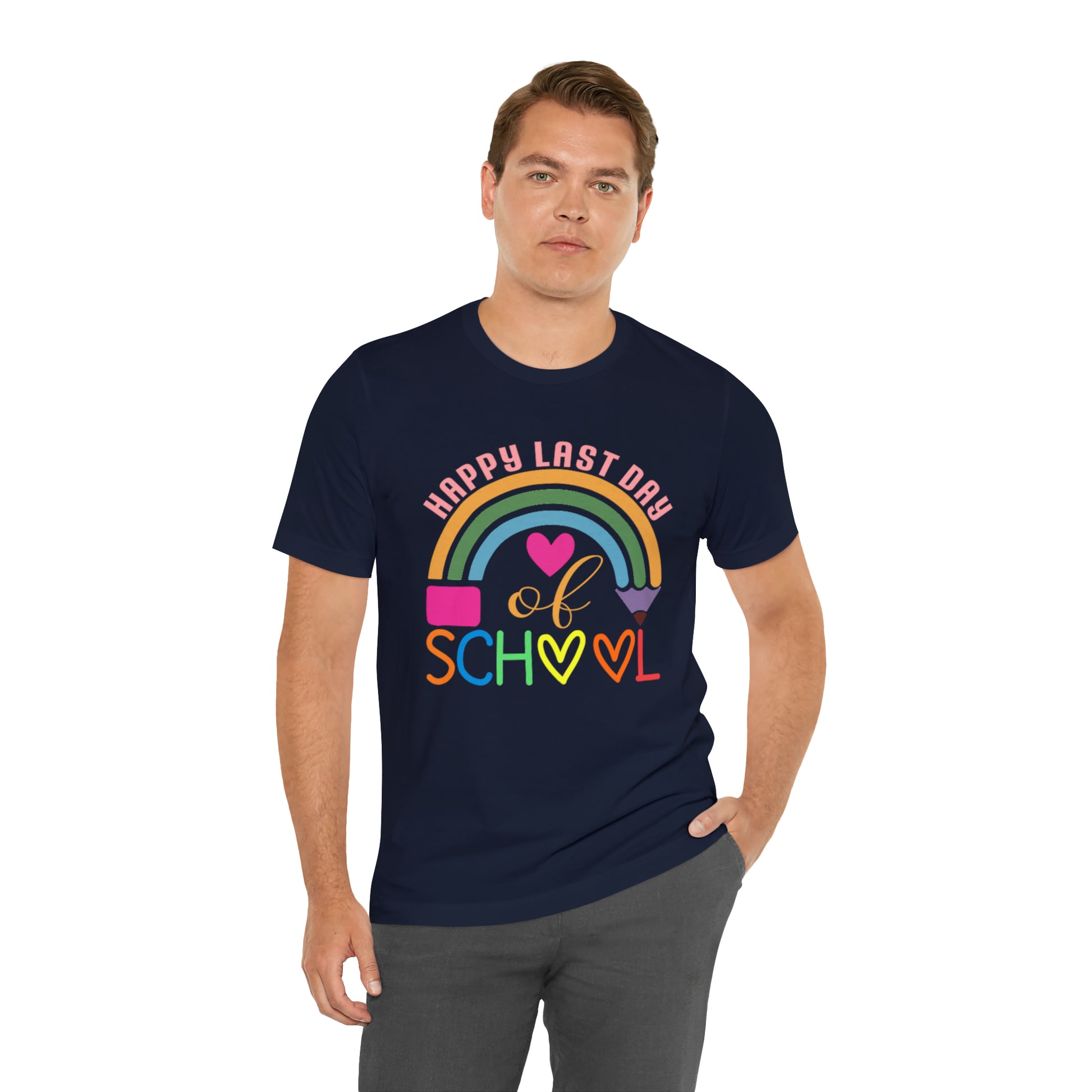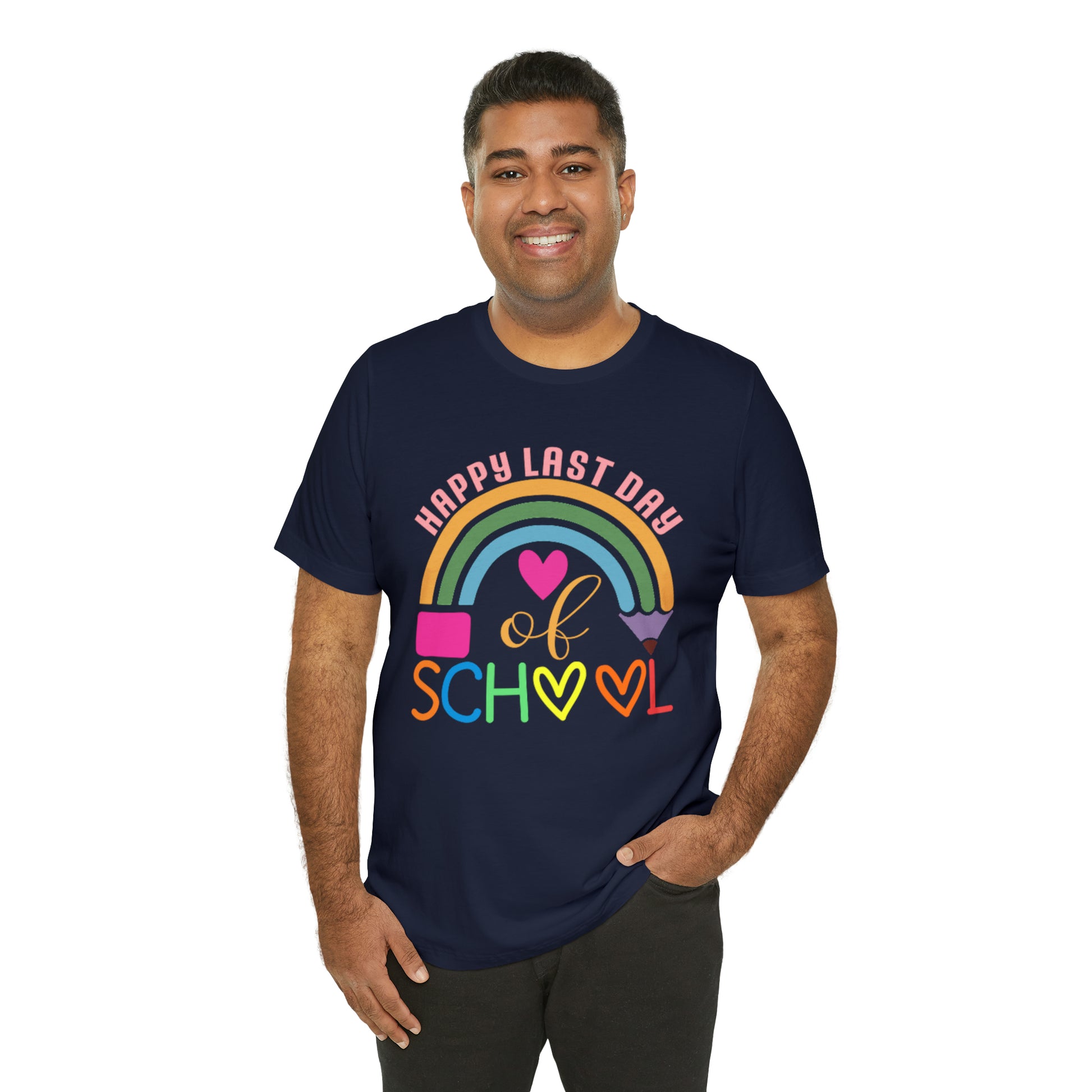 This stylish shirt is perfect for the last day of school! It features "Happy Last Day Of School" and a group of students smiling and holding diplomas. It's made of 100% cotton for a comfortable fit, and it comes in several sizes to fit everyone. Show off your pride for graduation and your perfect attendance with this fun shirt!