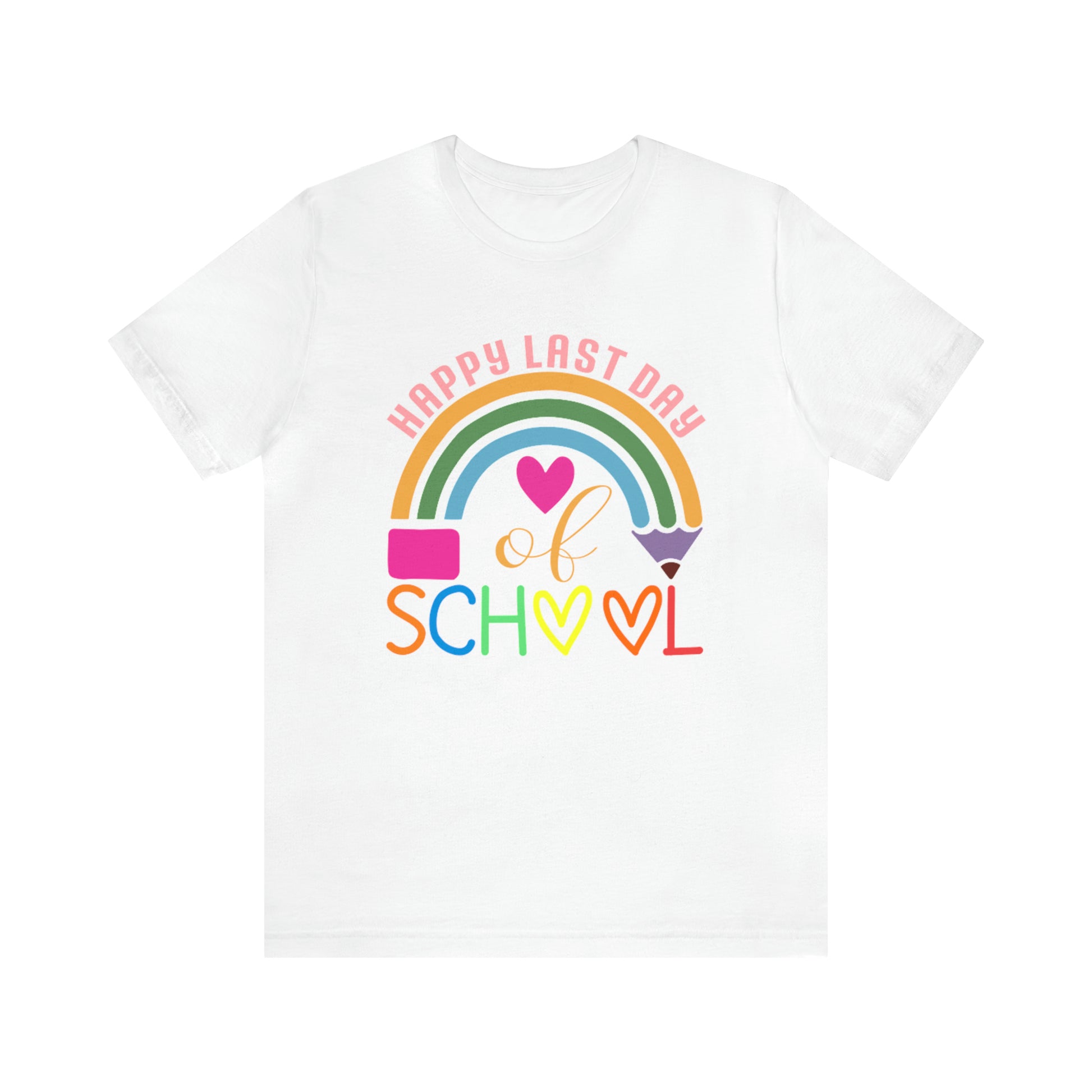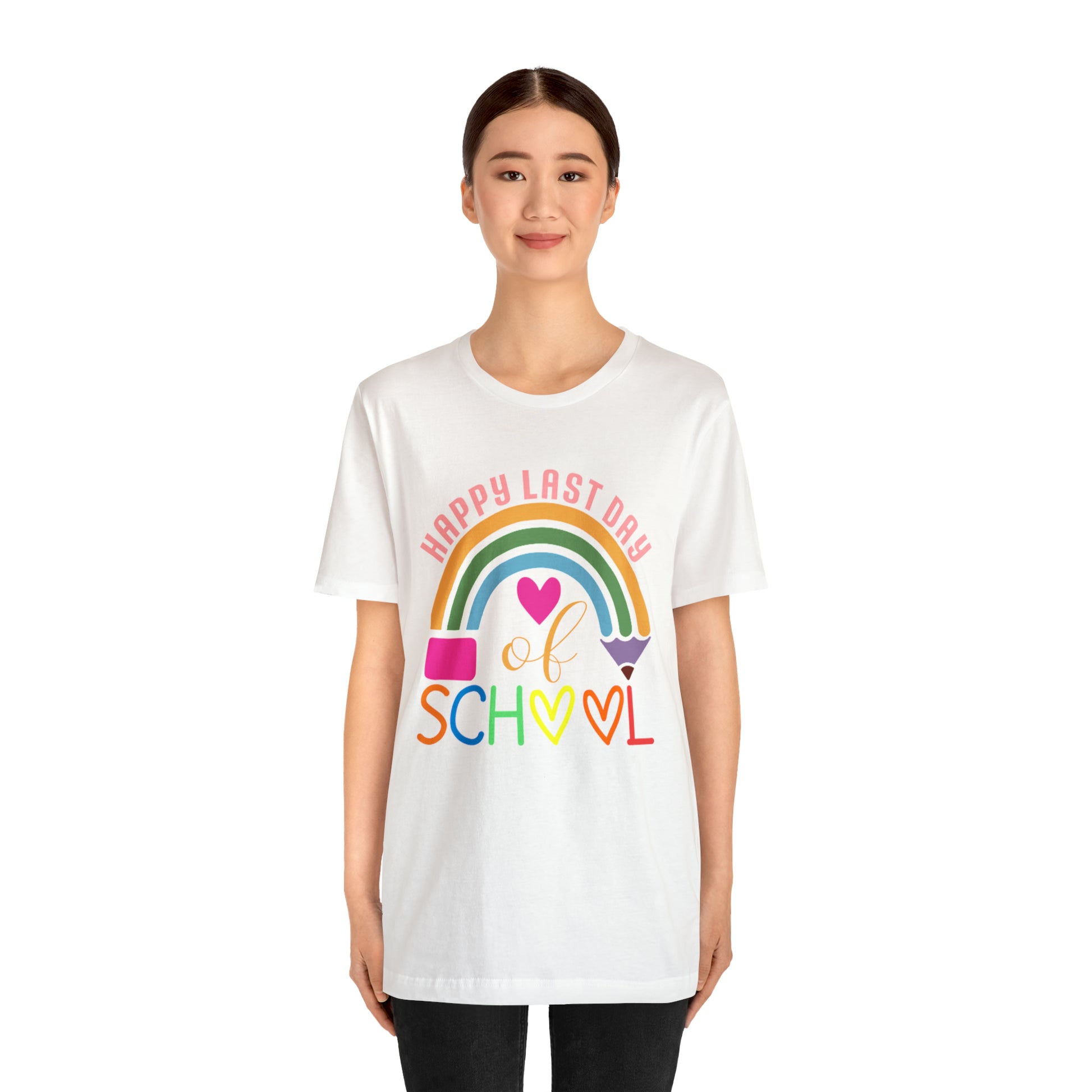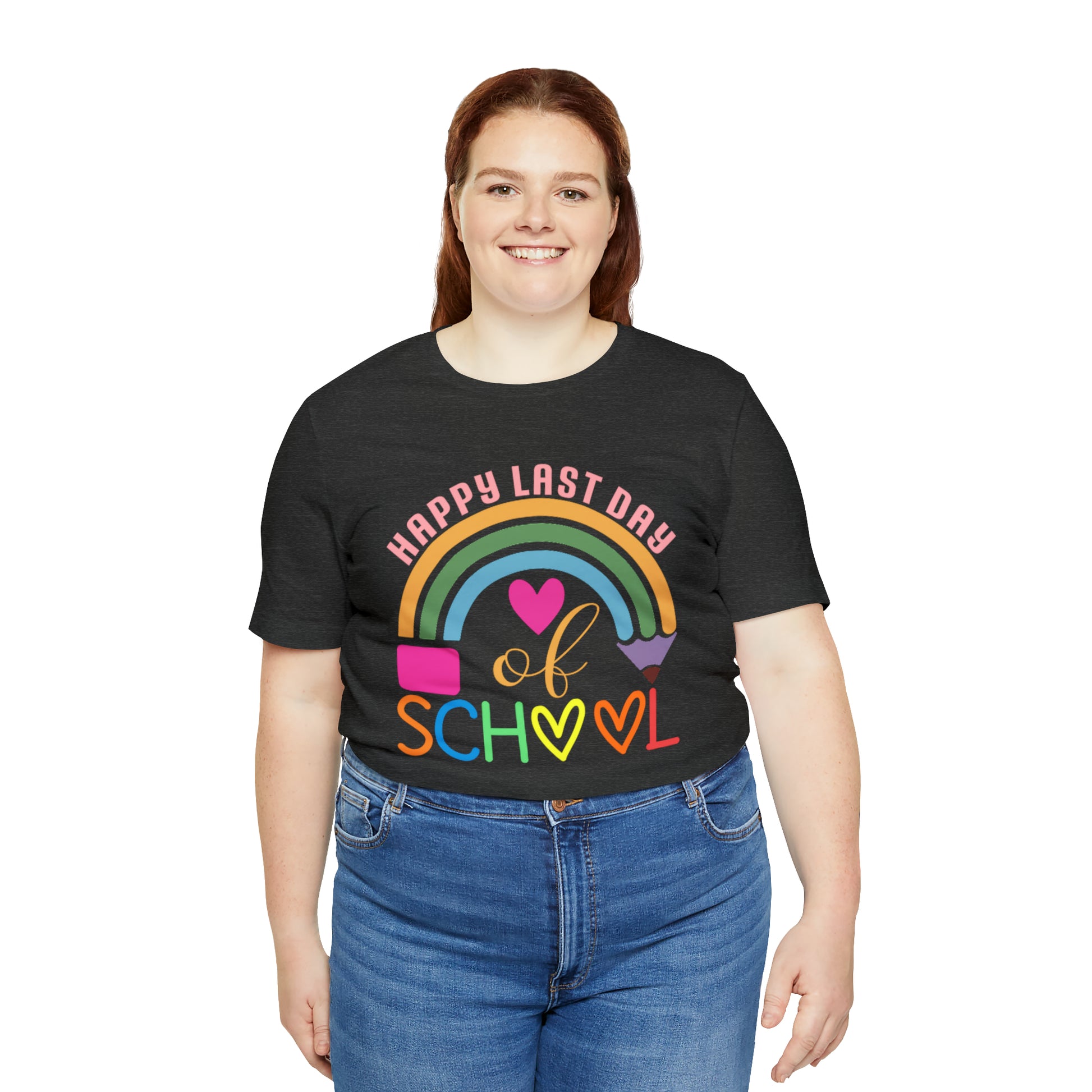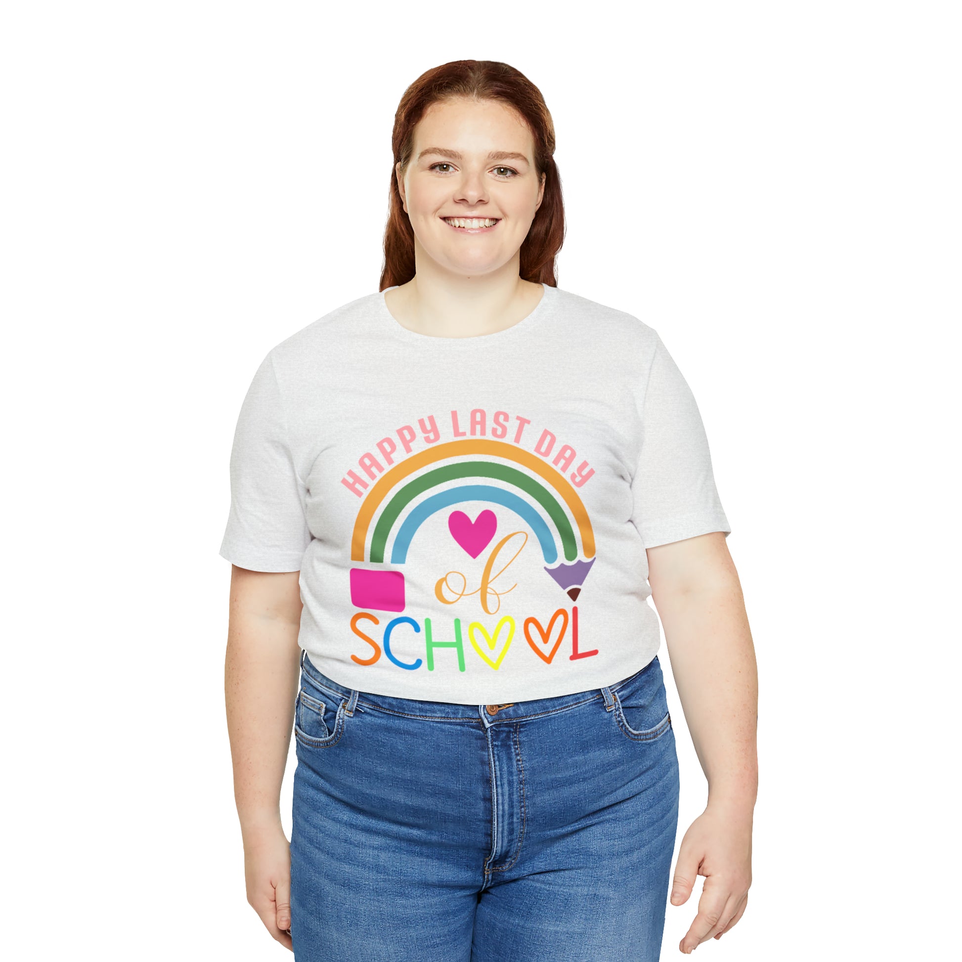 This stylish shirt is perfect for the last day of school! It features "Happy Last Day Of School" and a group of students smiling and holding diplomas. It's made of 100% cotton for a comfortable fit, and it comes in several sizes to fit everyone. Show off your pride for graduation and your perfect attendance with this fun shirt!
