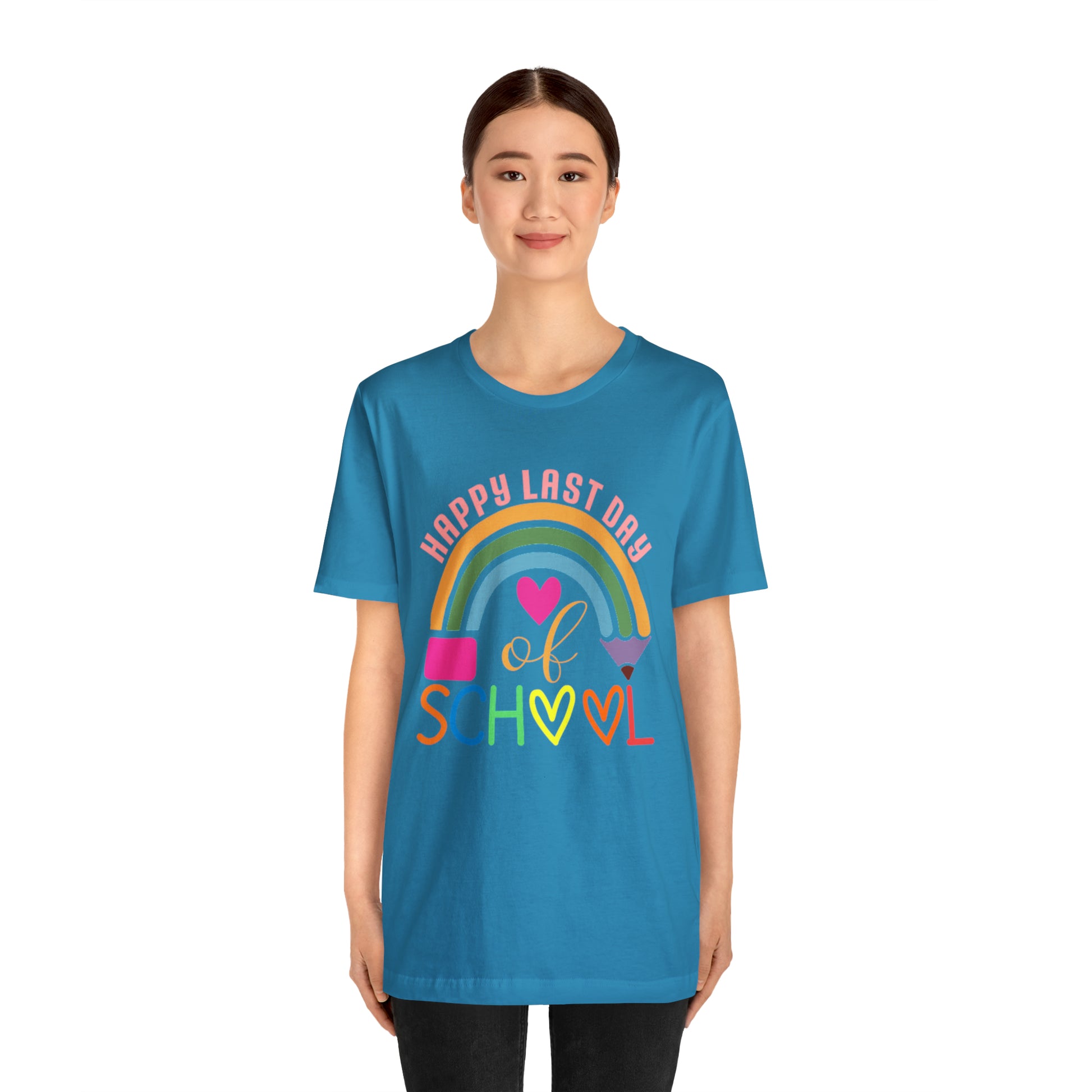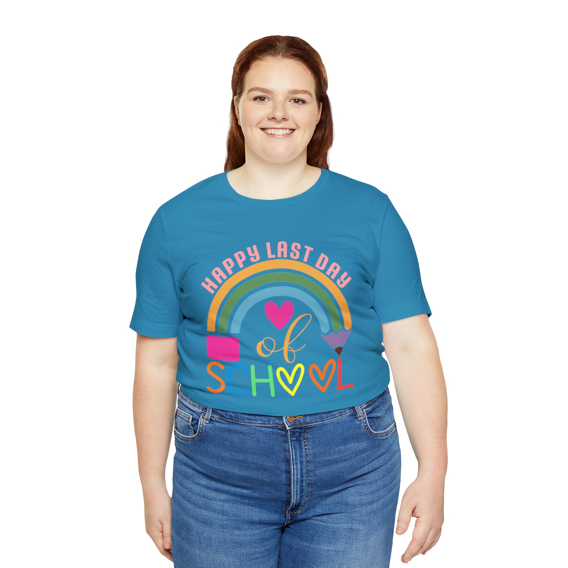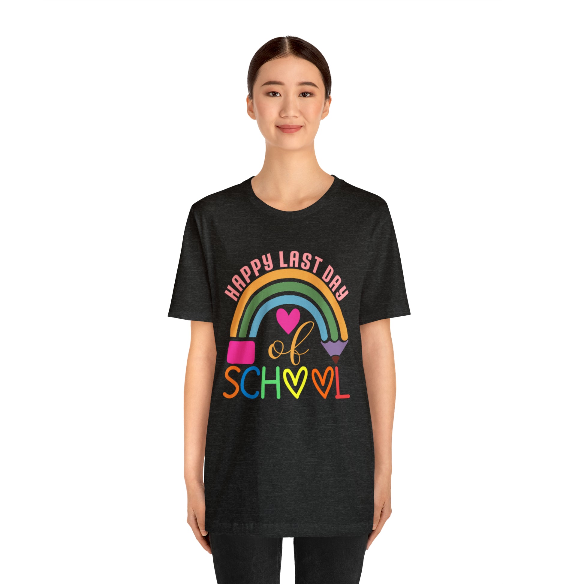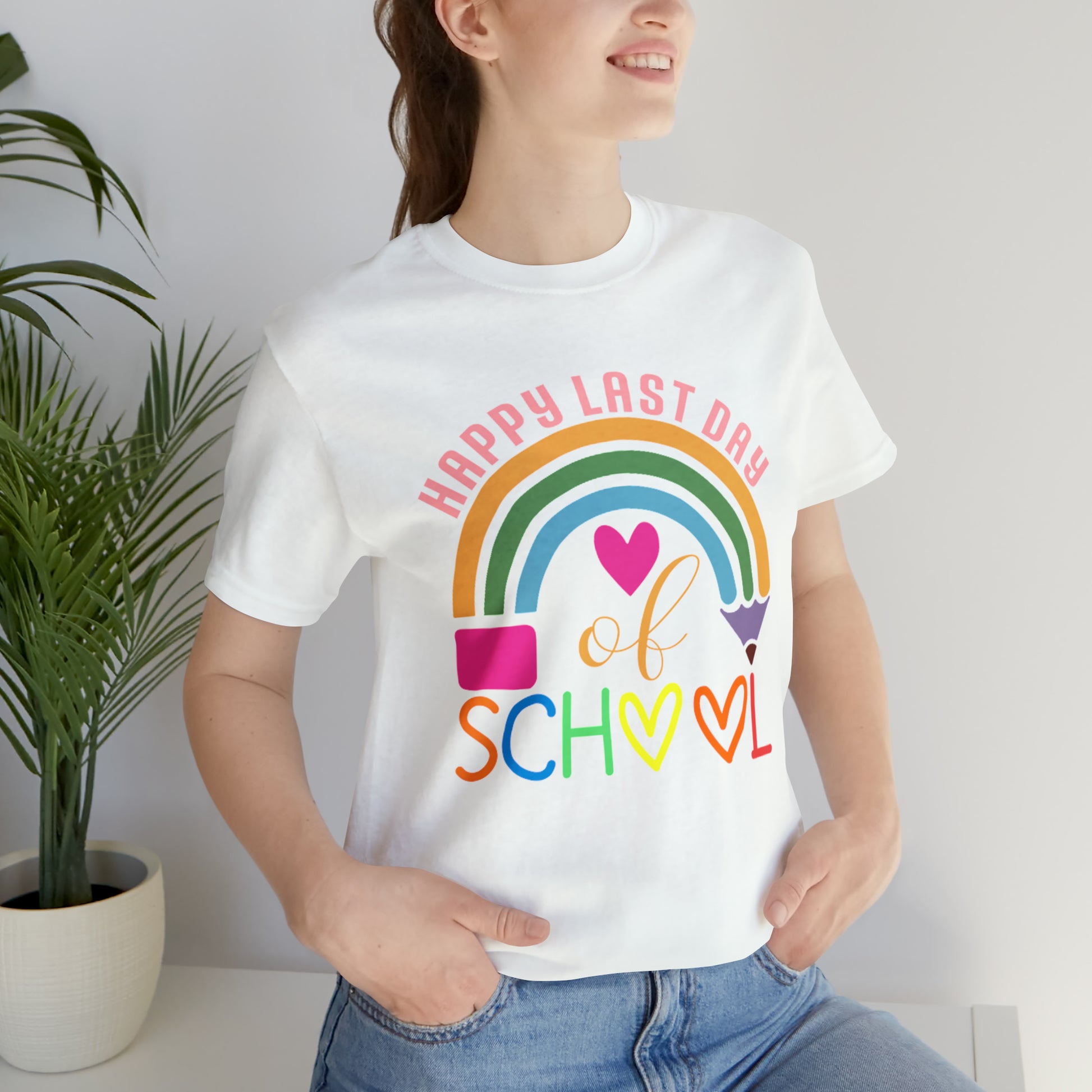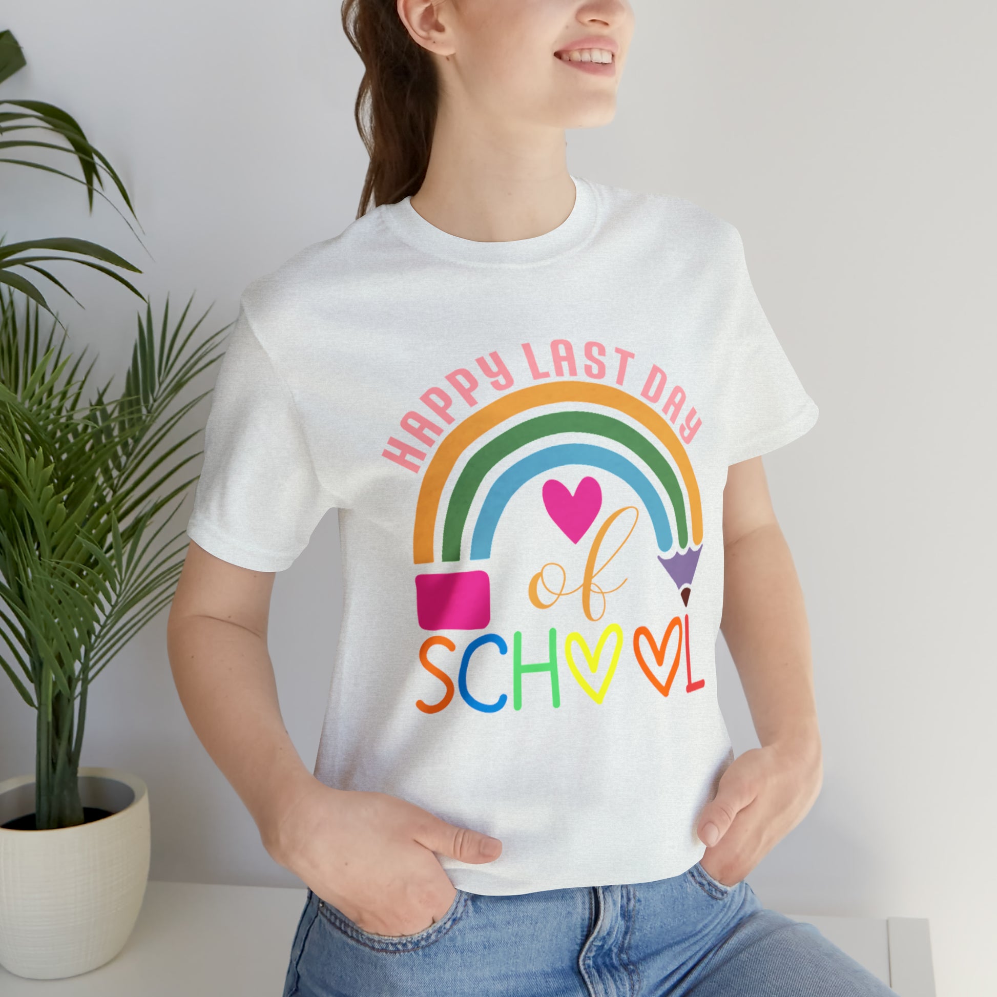 This stylish shirt is perfect for the last day of school! It features "Happy Last Day Of School" and a group of students smiling and holding diplomas. It's made of 100% cotton for a comfortable fit, and it comes in several sizes to fit everyone. Show off your pride for graduation and your perfect attendance with this fun shirt!