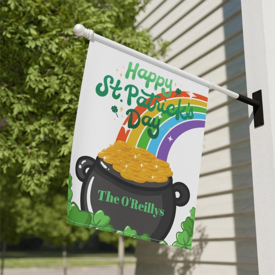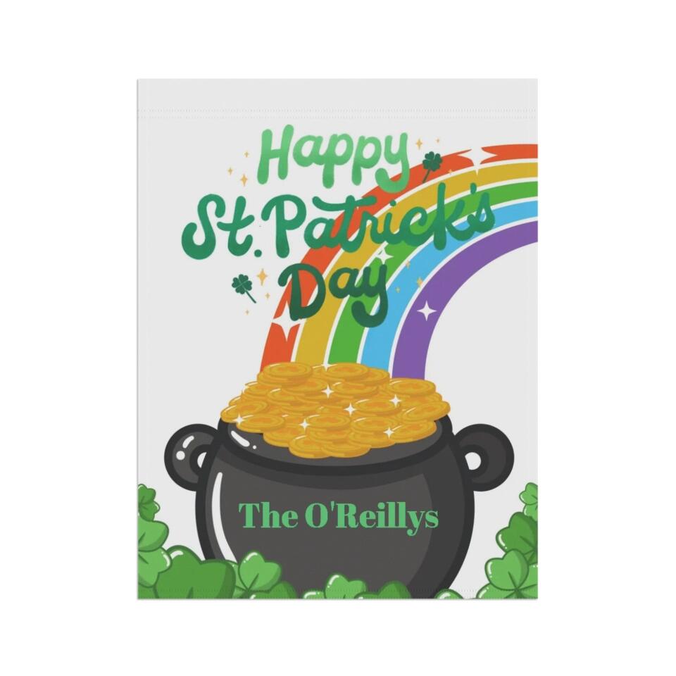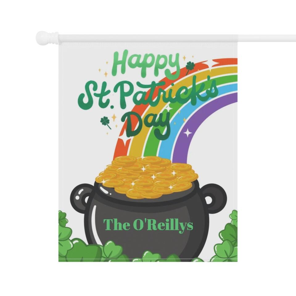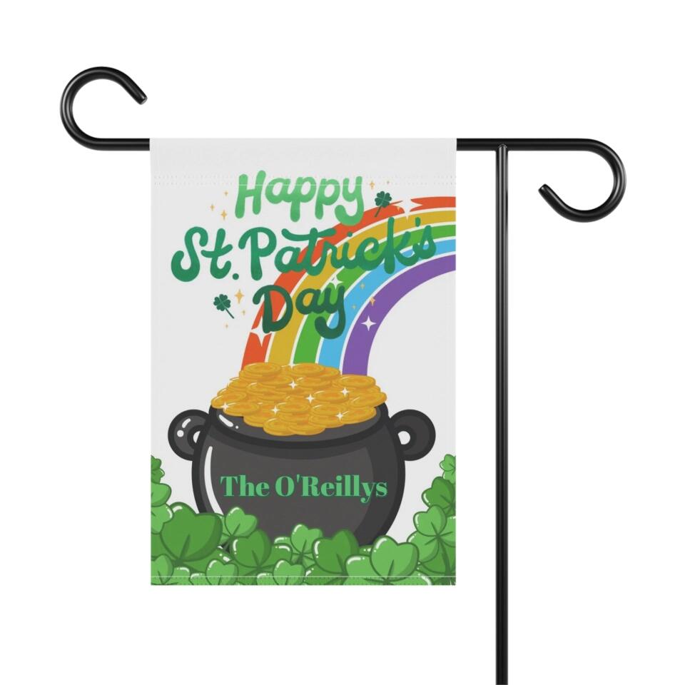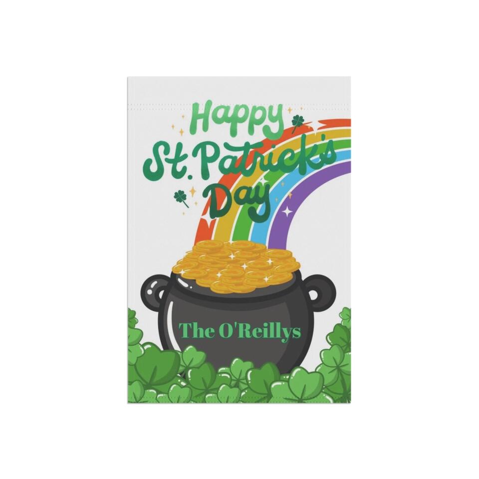 Give the luck of the Irish with a personalized "Happy St. Patrick's Day" flag. Available in two different sizes for your garden or house, this flag comes double sided. Makes a great gift for Irish Heritage Month and St. Patrick's Day.