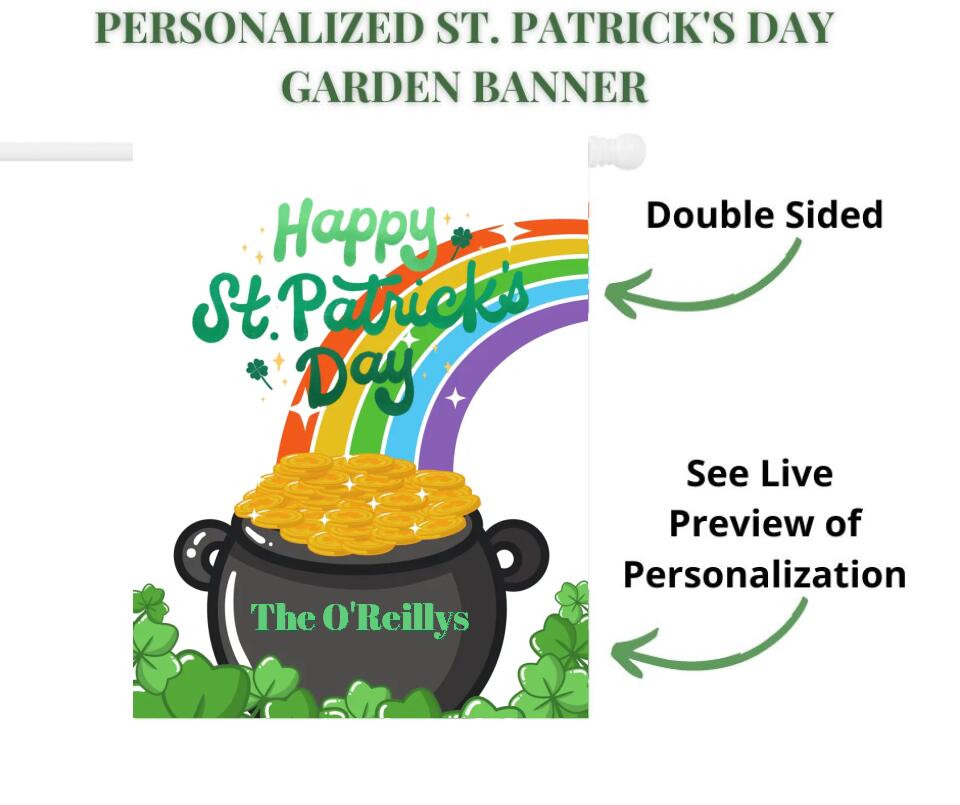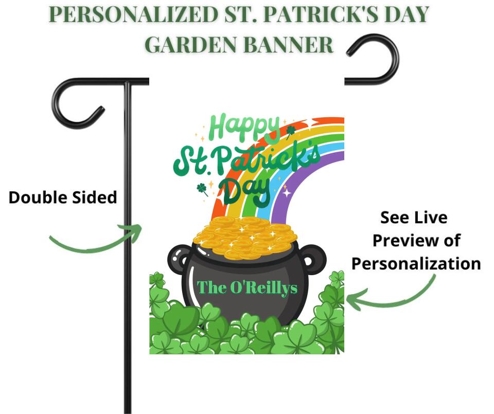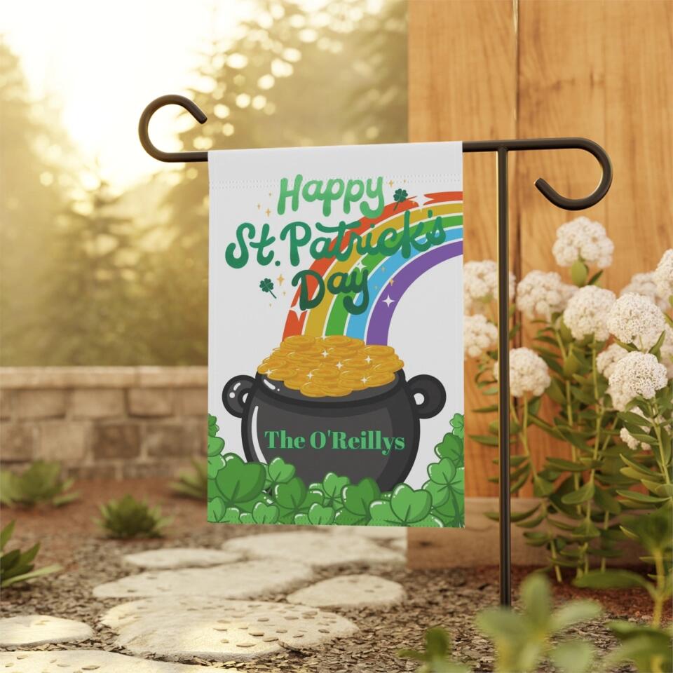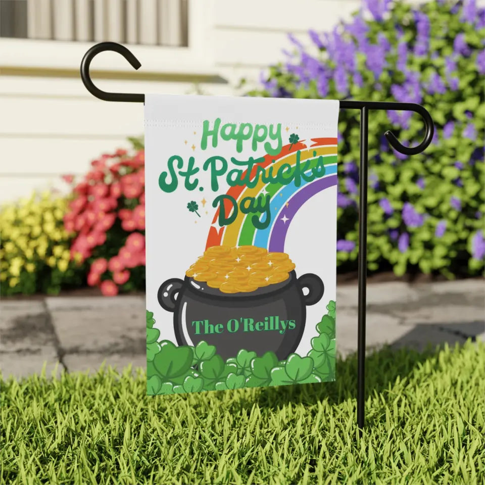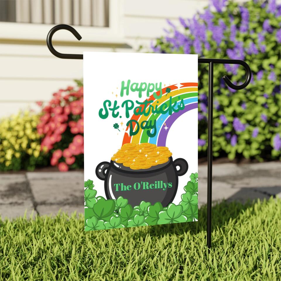 Give the luck of the Irish with a personalized "Happy St. Patrick's Day" flag. Available in two different sizes for your garden or house, this flag comes double sided. Makes a great gift for Irish Heritage Month and St. Patrick's Day.