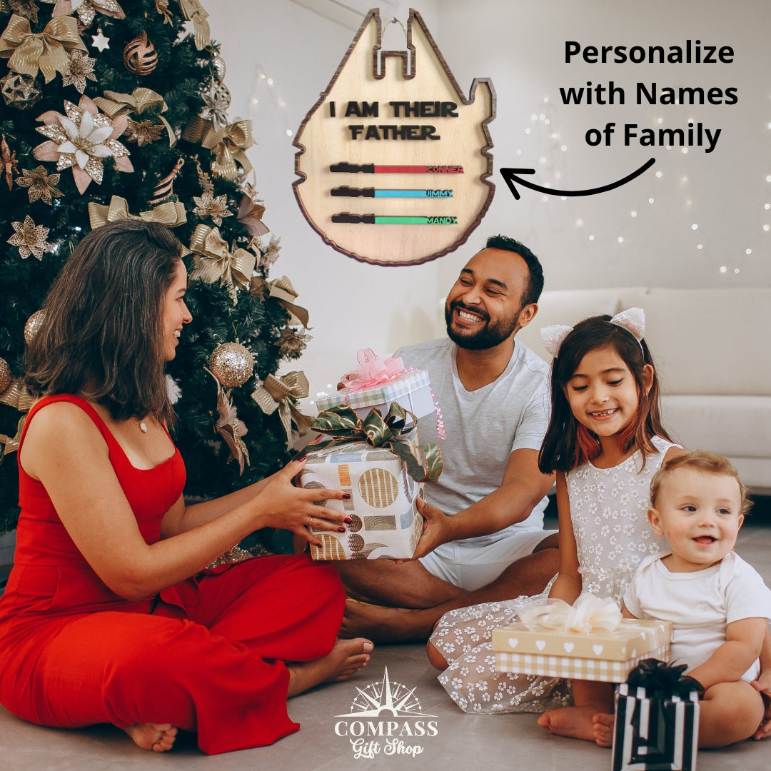 The best gift in the galaxy for Dad's is Compass Gift Shop's Custom I Am Their Father With Family Names Spaceship Shaped Wooden Plaque. Each lightsaber can be customized in a different color with 1 to 7 names. Dad is the greatest man in the universe, this lightsaber plaque is the perfect Holiday or Father's Day gift. It's also the perfect birthday, anniversary gift for Sci Fi fans. This custom gift is exactly what your father has been waiting for!