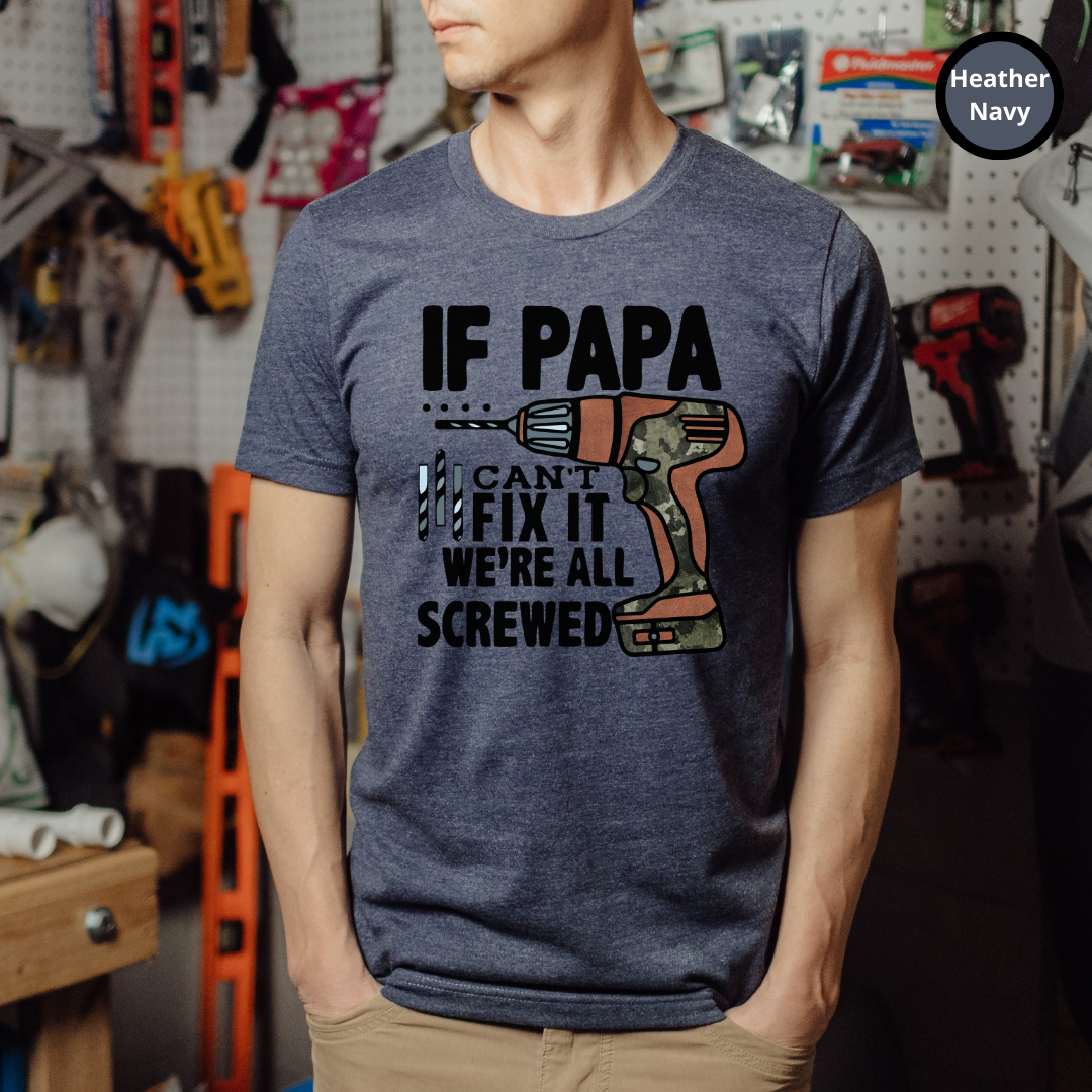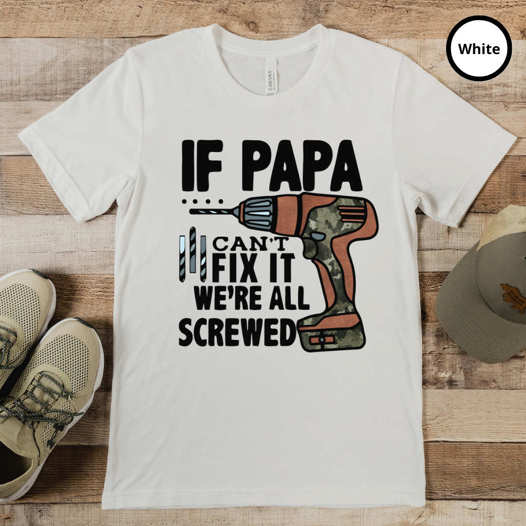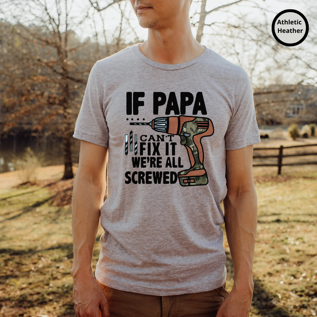 This If Papa Can't Fix It We're All Screwed T-shirt features a simple design that conveys a strong message - a reminder that if your papa can't fix a problem, we're all screwed. Crafted with a classic camo pattern and made from comfortable materials, this T-shirt is perfect for both casual days out, and for when you need to show your support for an old-fashioned dad.