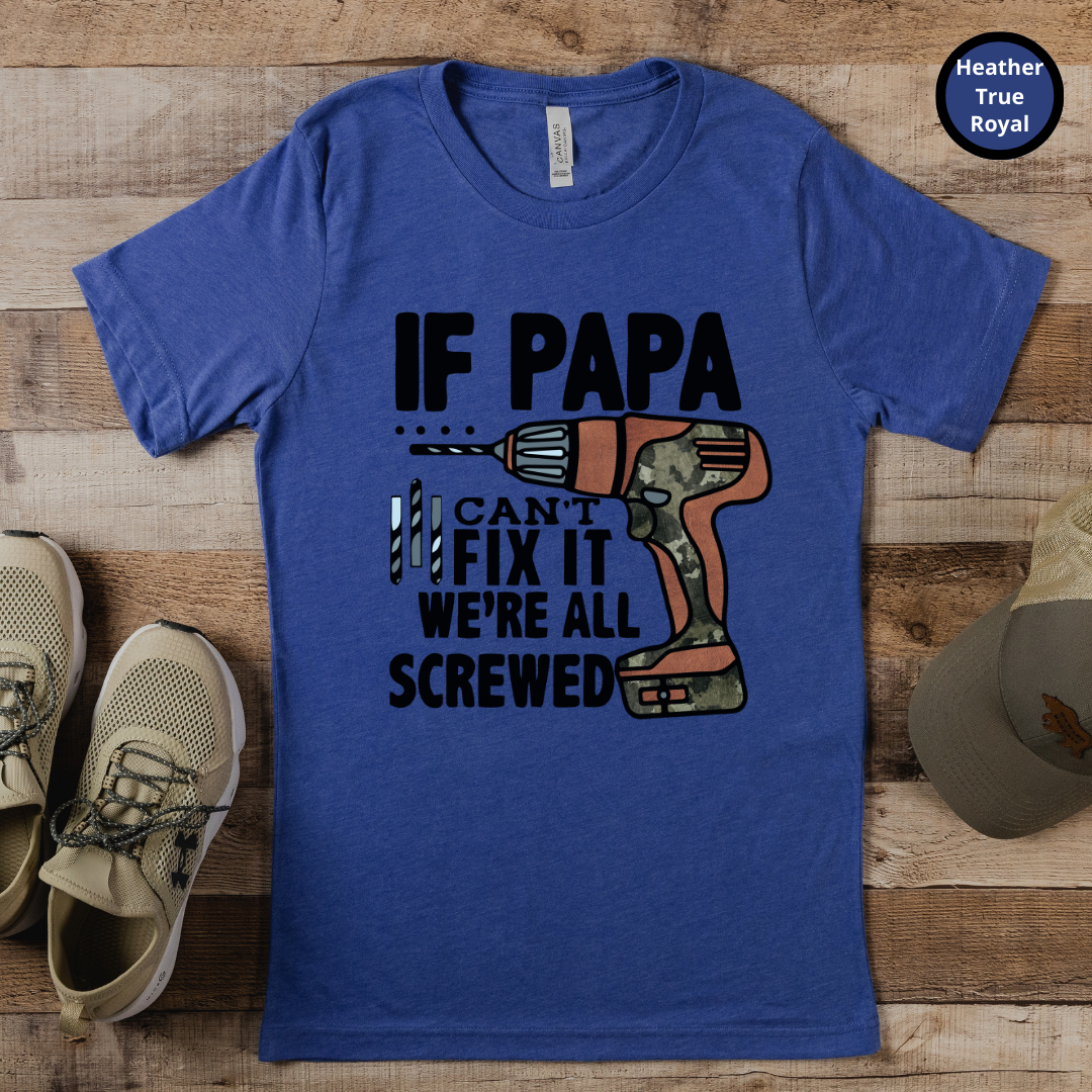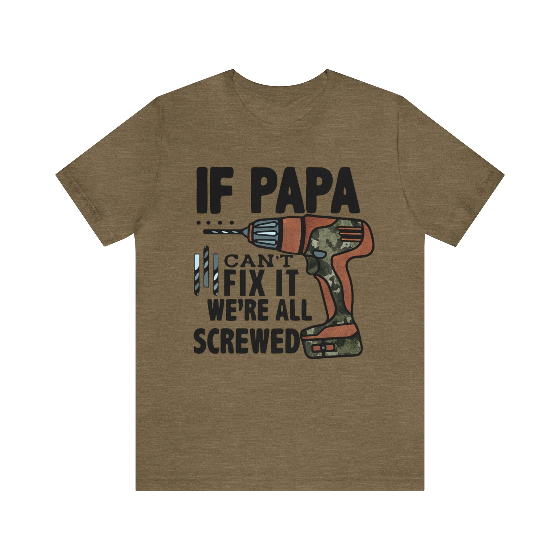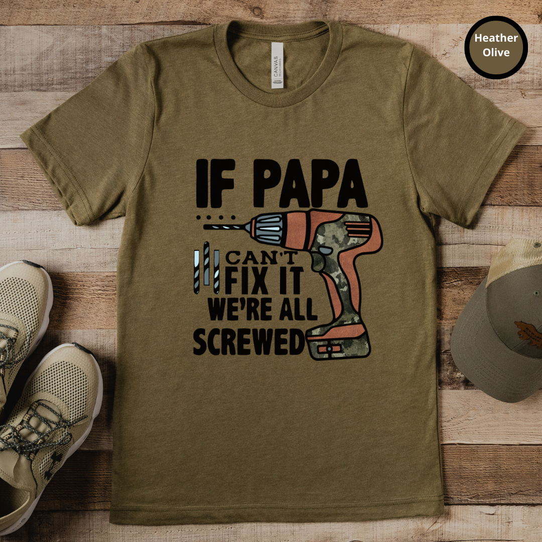 This If Papa Can't Fix It We're All Screwed T-shirt features a simple design that conveys a strong message - a reminder that if your papa can't fix a problem, we're all screwed. Crafted with a classic camo pattern and made from comfortable materials, this T-shirt is perfect for both casual days out, and for when you need to show your support for an old-fashioned dad.