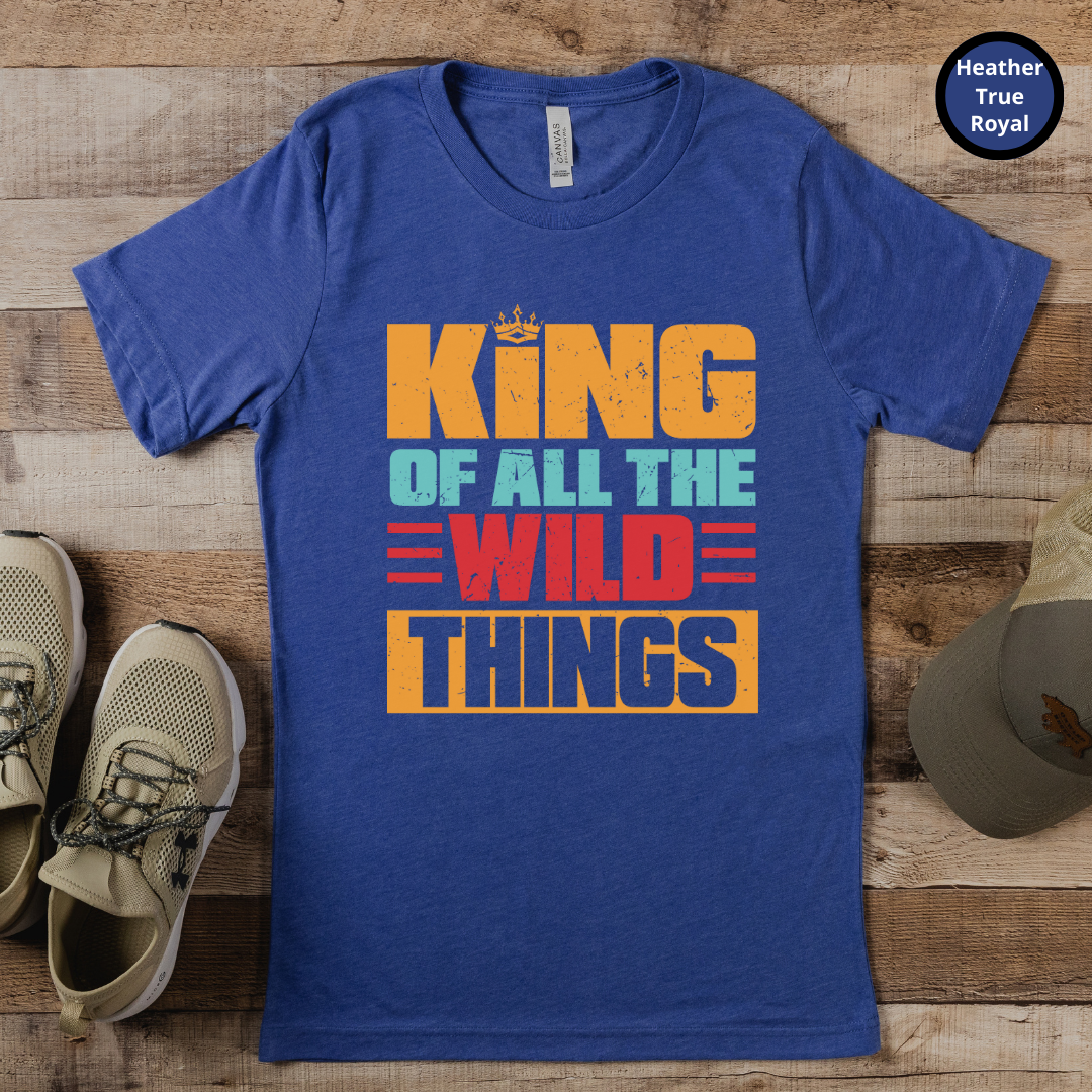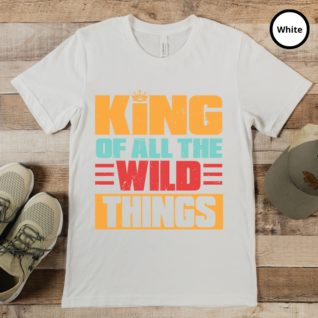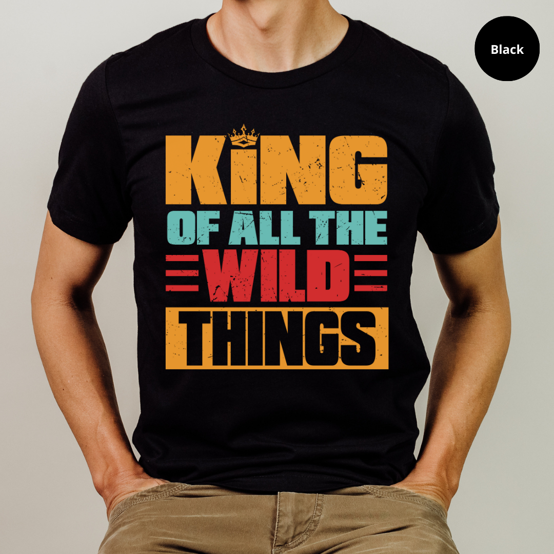 Our King Of All The Wild Things tshirt is perfect for anyone looking to express their wild side. Featuring a majestic lion with a regal golden crown, this tshirt is sure to turn heads and make a bold statement. Printed with high quality inks on a soft and comfortable cotton blend fabric, this tshirt is made to last. With its classic crew neck fit and flattering short sleeves, this garment is perfect for all occasions, dress it down for a casual look or style it up for a night out. Let this tshirt be your go-to for conveying your wild spirit. Makes a great gift for dad on Father's Day or his birthday... or anytime!