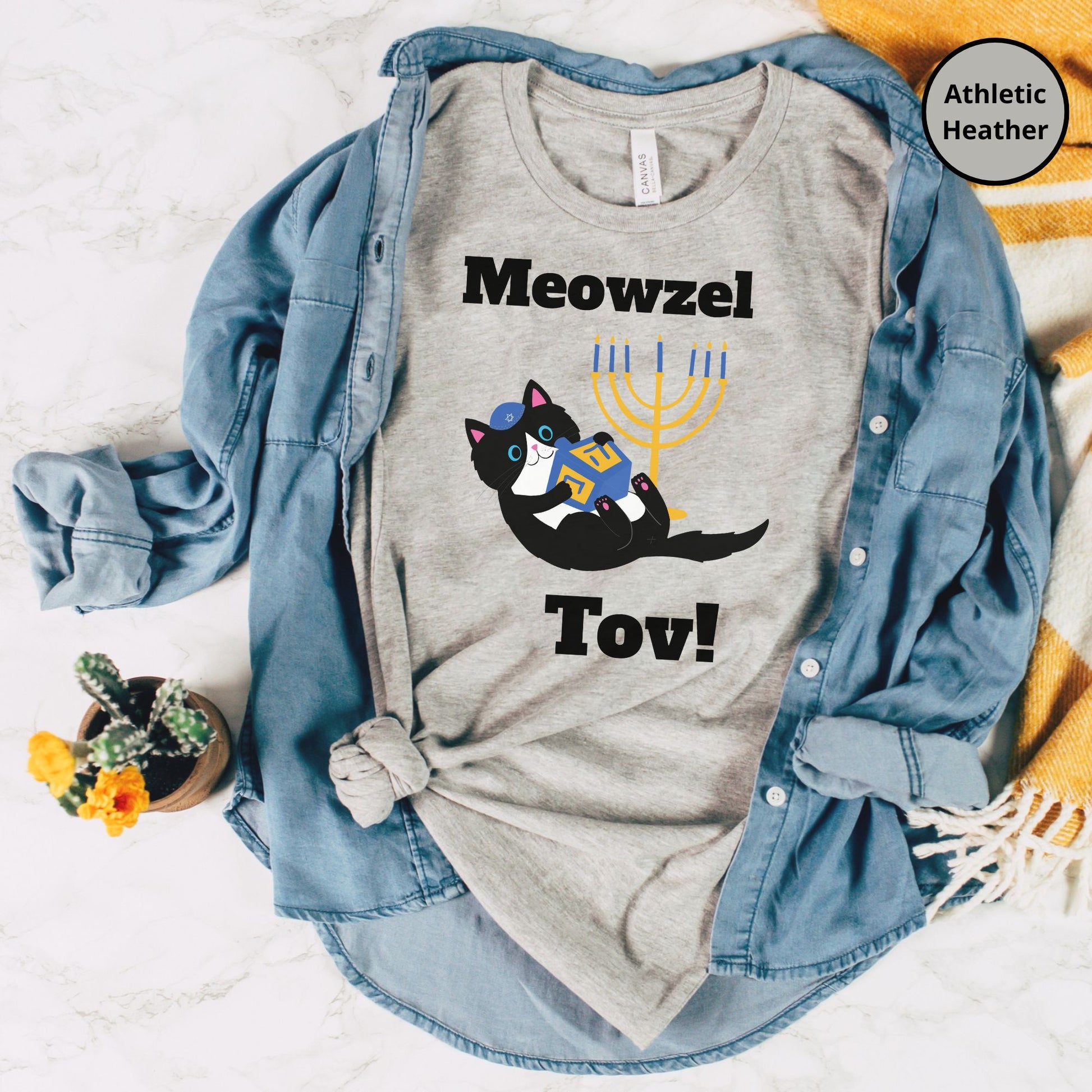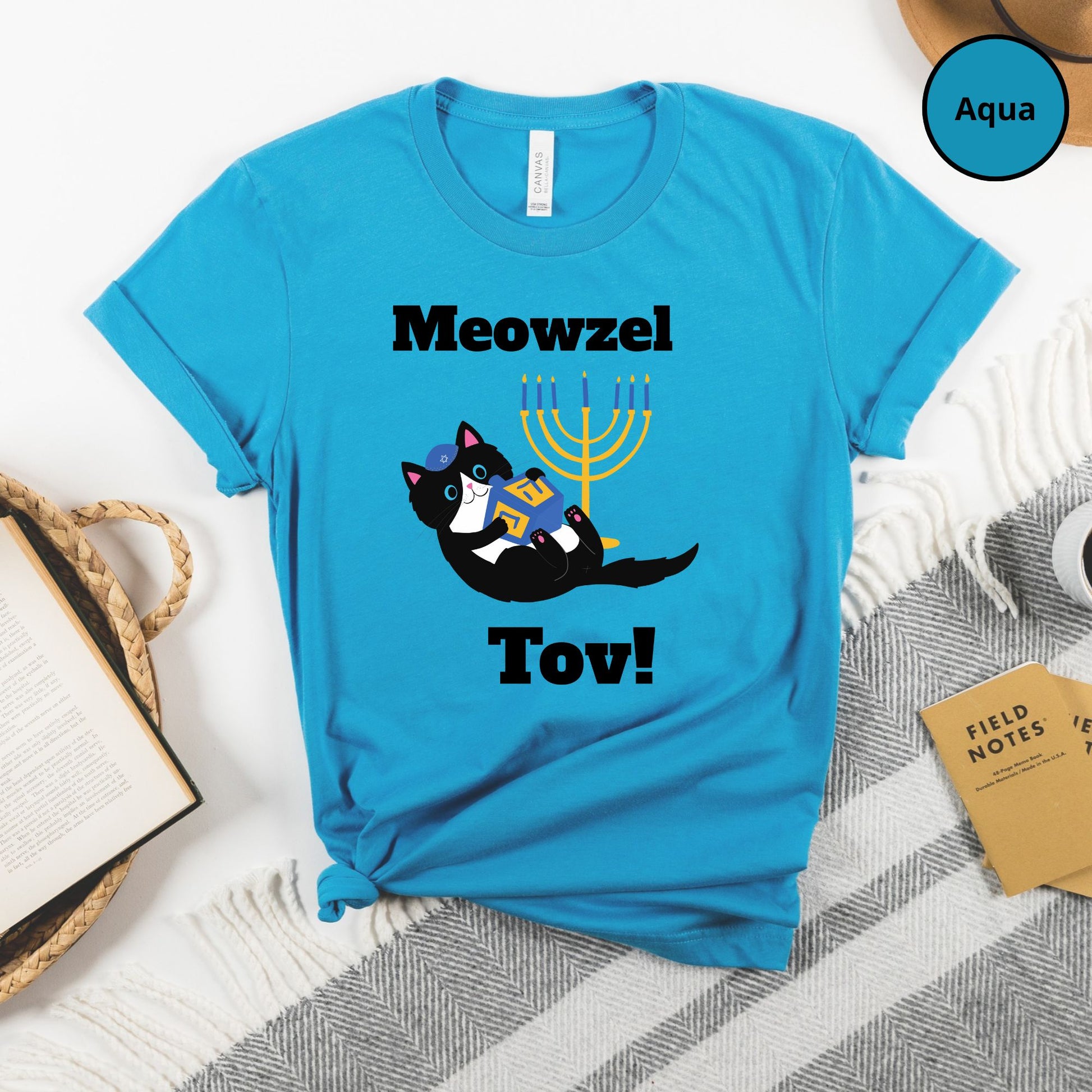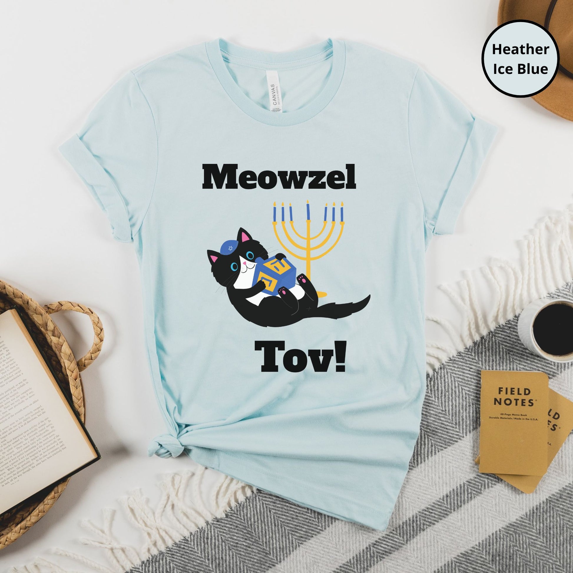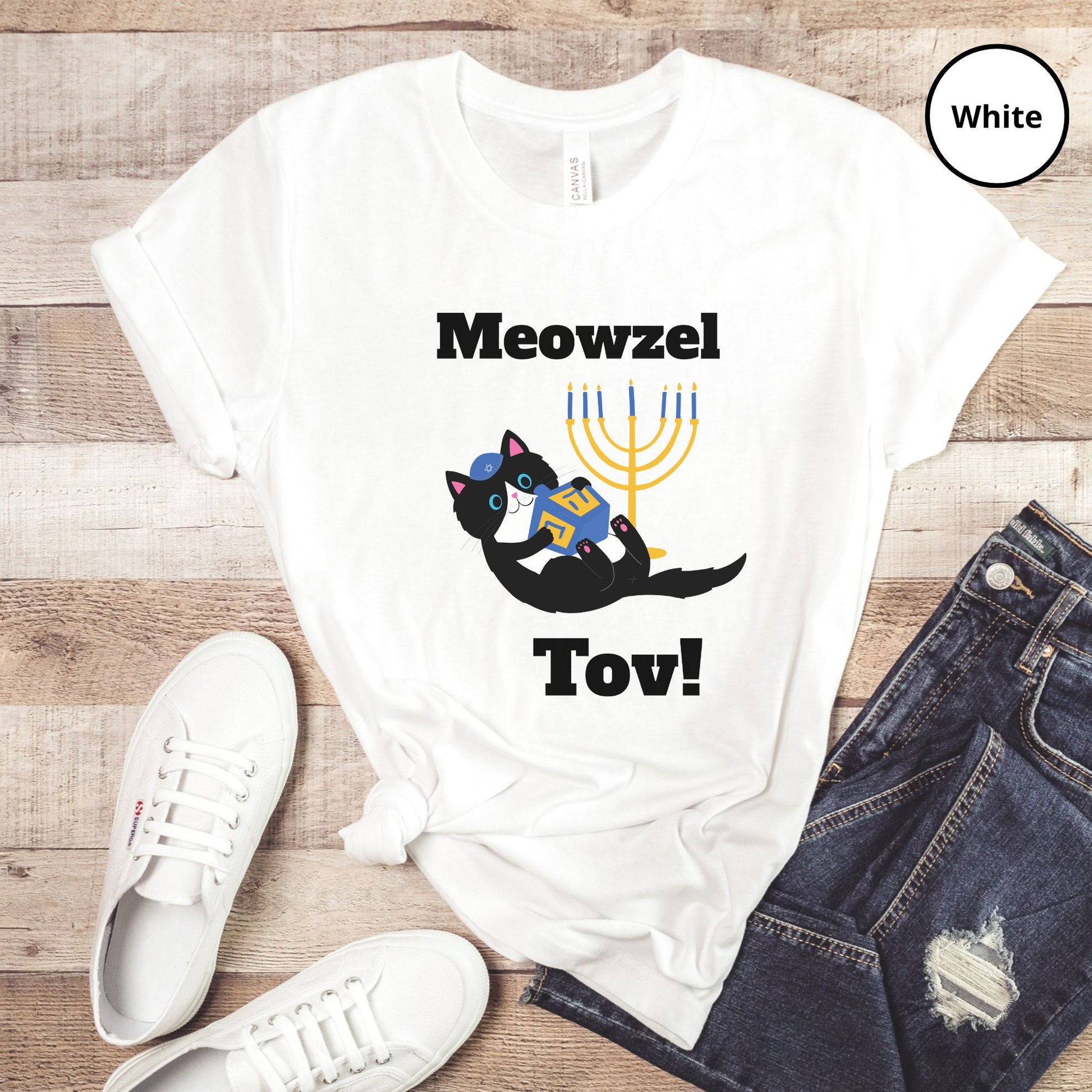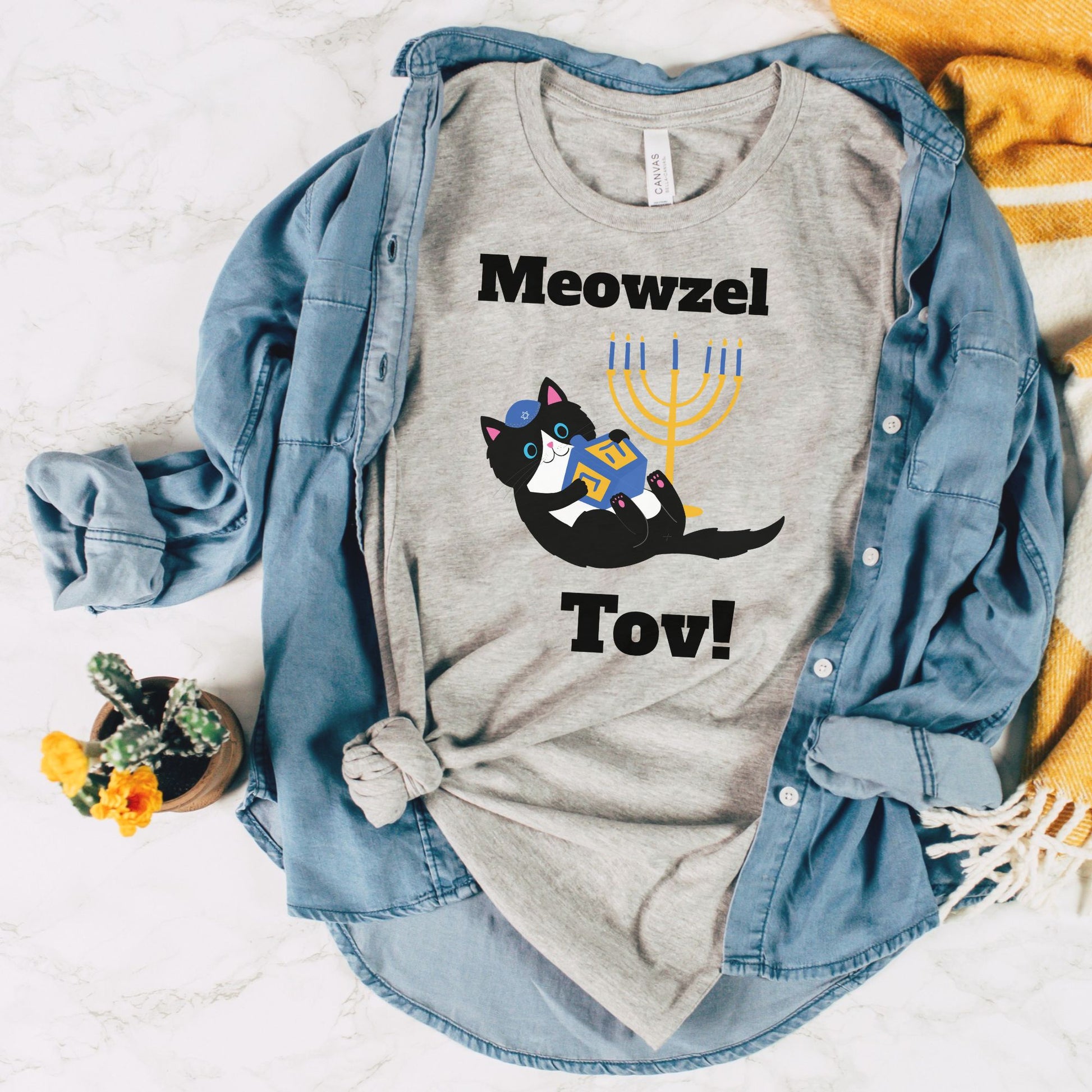 Celebrate Hanukkah with a purr-fect twist! Our best selling “Meowzel Tov!” t-shirt combines festive fun with feline flair. Printed on a soft, unisex jersey tee, this shirt brings cozy vibes and joyful spirit to your holiday season. Whether you're spinning the dreidel, lighting candles, or just cuddling with your favorite cat, this shirt is sure to bring smiles and spark conversation. Great as a gift or for your own Hanukkah celebrations — because nothing says "Festival of Lights" like a festive feline wishing you a Meowzel Tov!