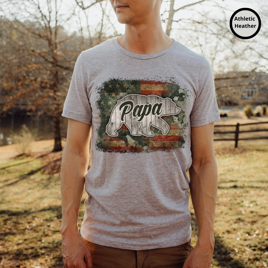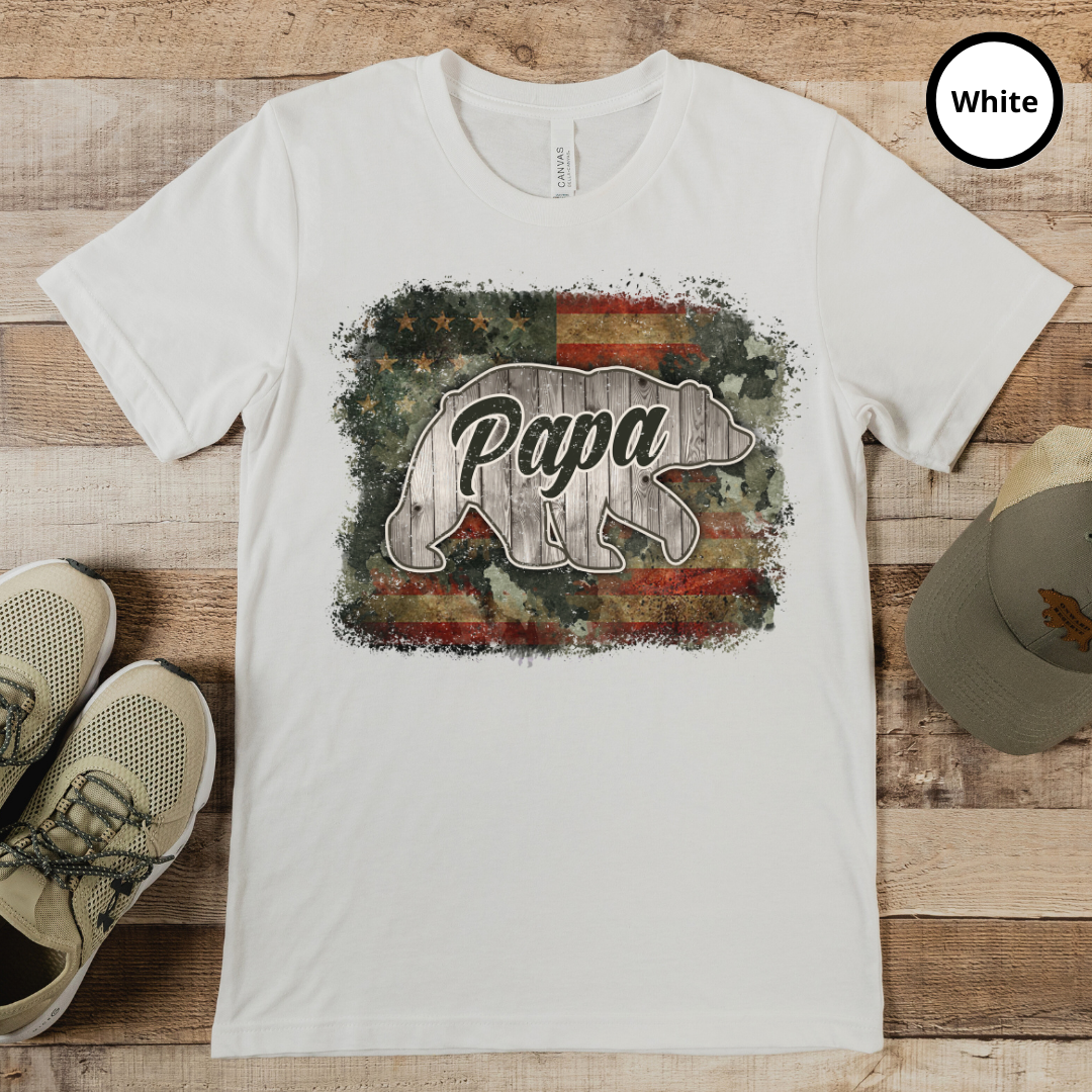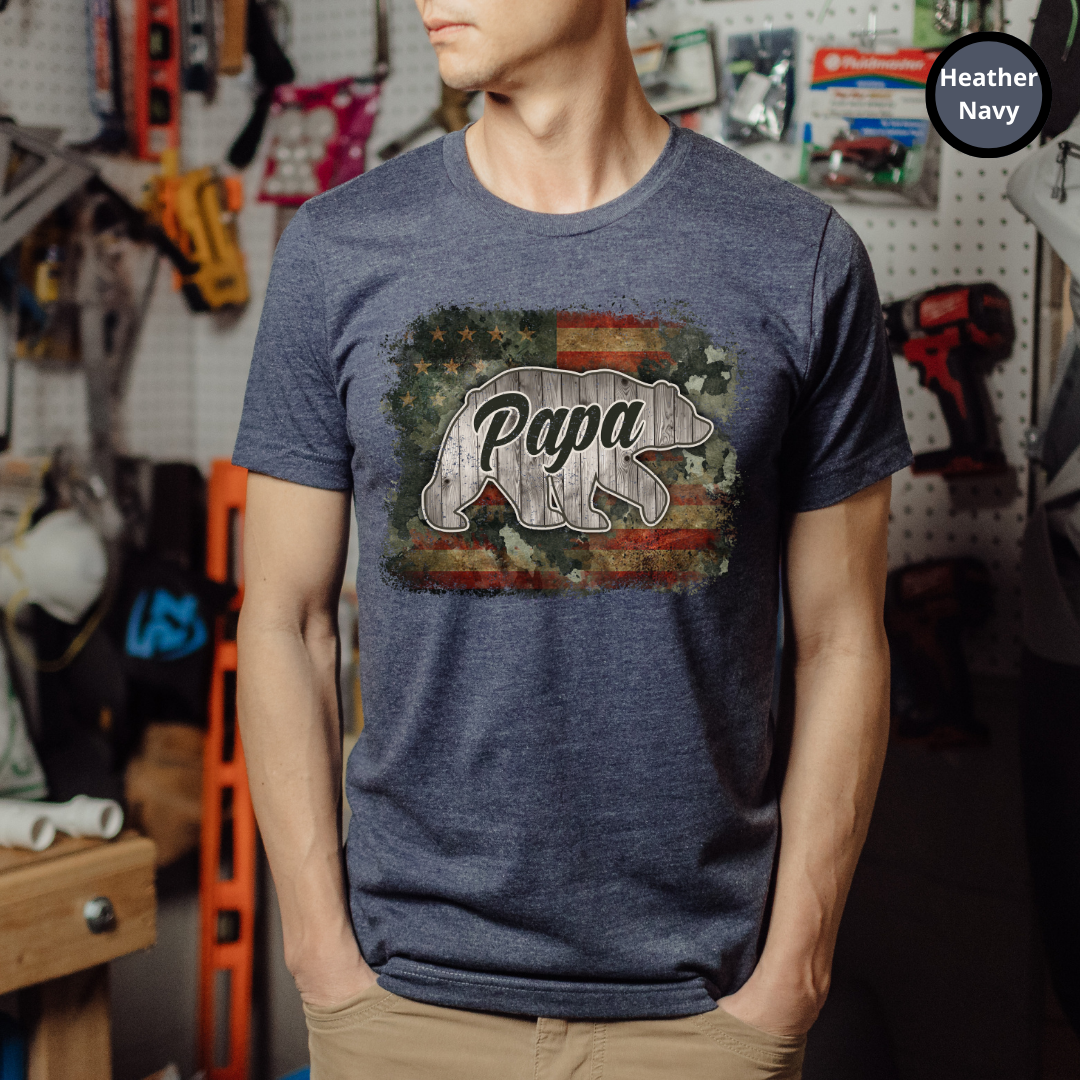 Introducing our new patriotic Papa Bear t-shirt! Featuring a positive, loving message of the American spirit and Papa Bear, this unique t-shirt provides a unique and stylish way to express your love of country and the importance of family. This shirt is 100% preshrunk cotton, giving it a comfortable feel with a durable and long-lasting design. Do your part in expressing your patriotism and pride for the USA with this timeless Papa Bear and American Flag t-shirt.