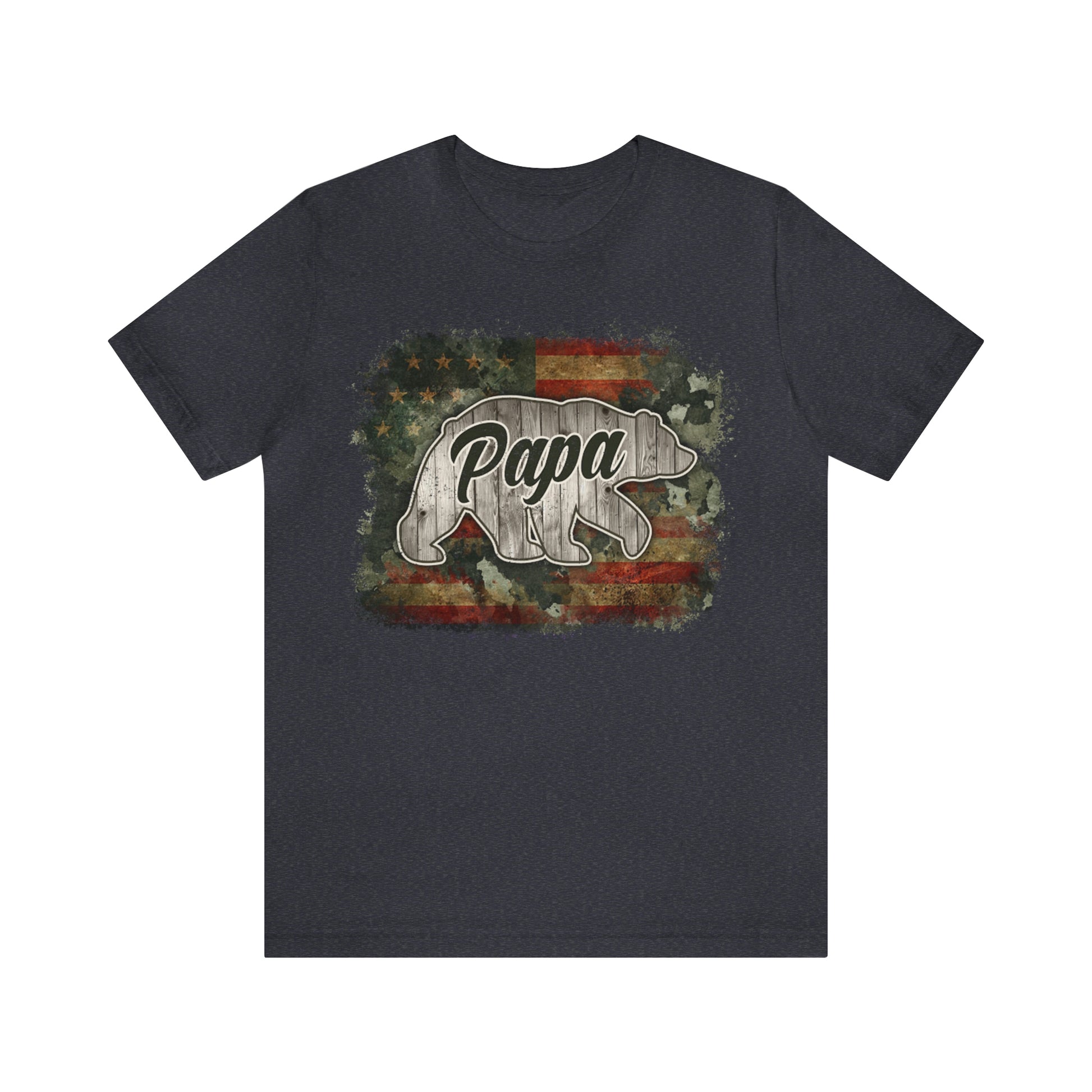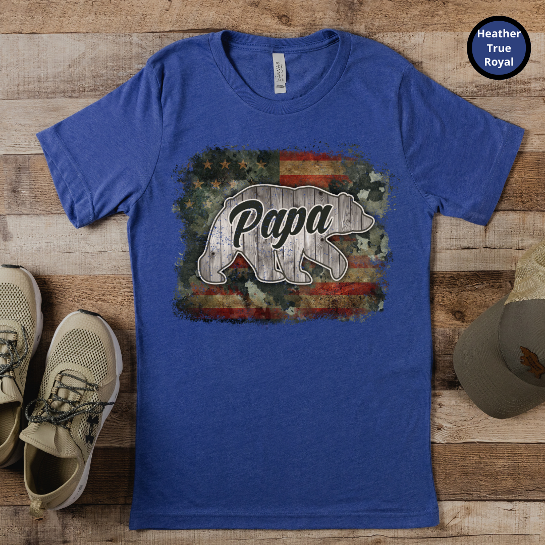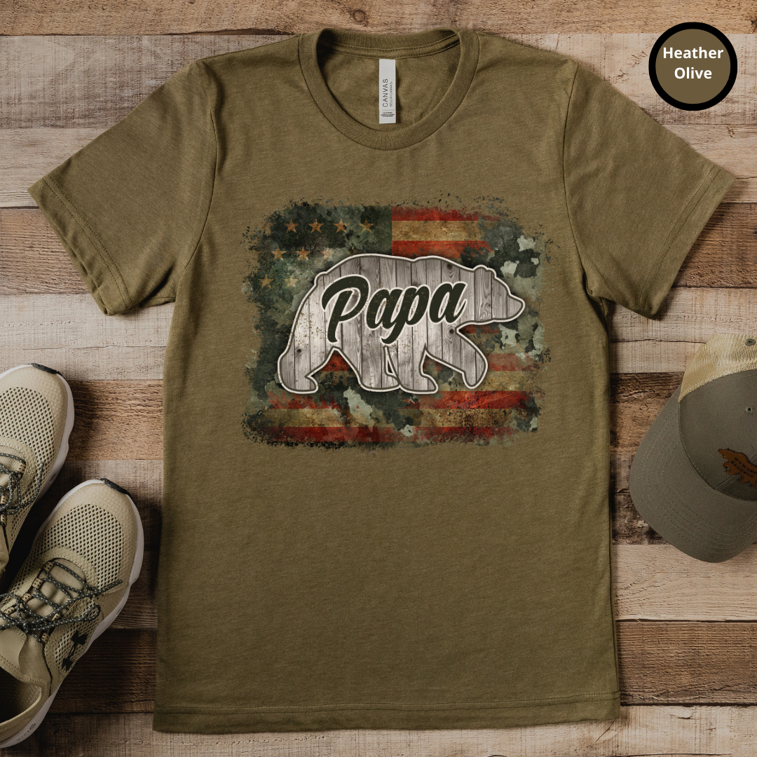 Introducing our new patriotic Papa Bear t-shirt! Featuring a positive, loving message of the American spirit and Papa Bear, this unique t-shirt provides a unique and stylish way to express your love of country and the importance of family. This shirt is 100% preshrunk cotton, giving it a comfortable feel with a durable and long-lasting design. Do your part in expressing your patriotism and pride for the USA with this timeless Papa Bear and American Flag t-shirt.