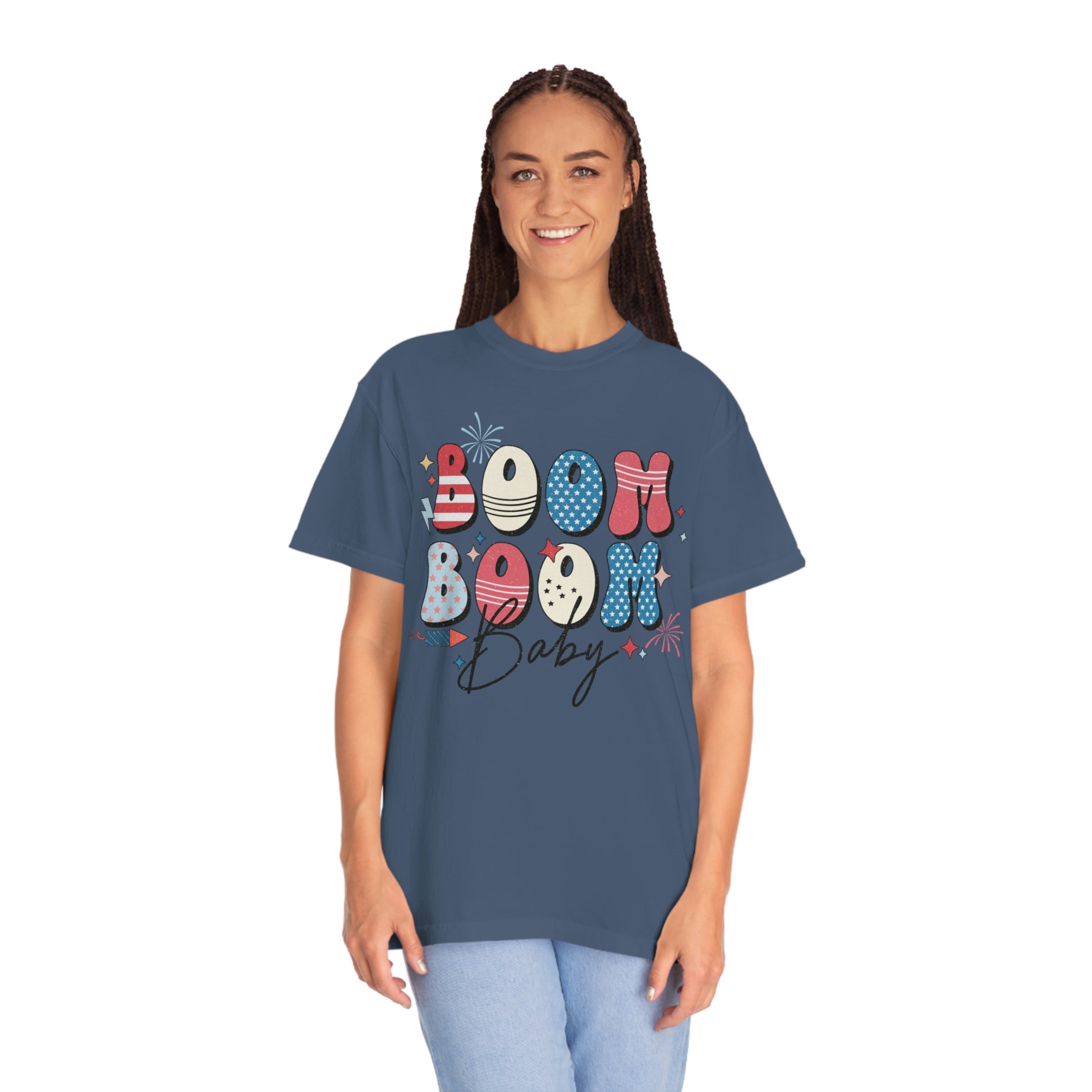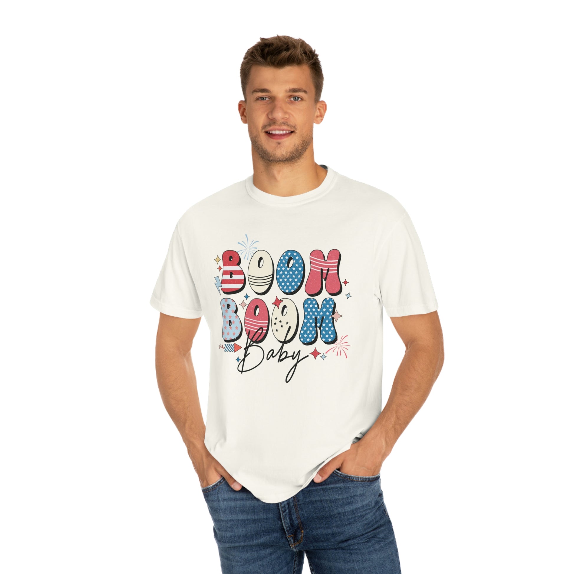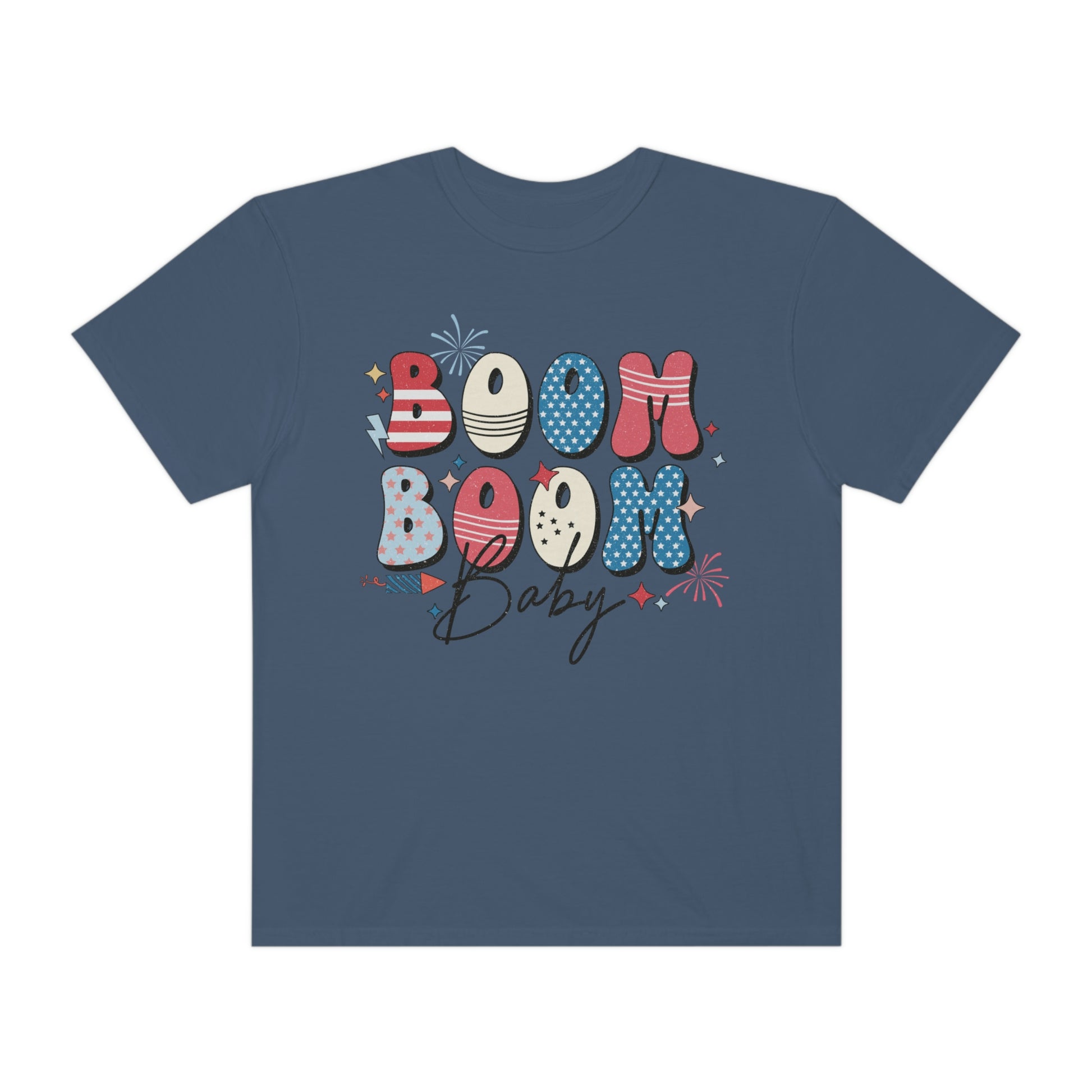 This classic Comfort Colors tshirt is a perfect way to show off your patriotism with style. You'll look simply stylish and make a statement this 4th of July. Featuring the text "Boom Boom Baby" in retro font, it will pair perfectly with all your favorite denim or shorts. The lightweight pre-shrunk cotton fabric is breathable, comfortable and will have you feeling relaxed all Summer long. Show some love for your country and wear it with pride this Memorial Day, Independence Day, Labor Day or any festive BBQ.
