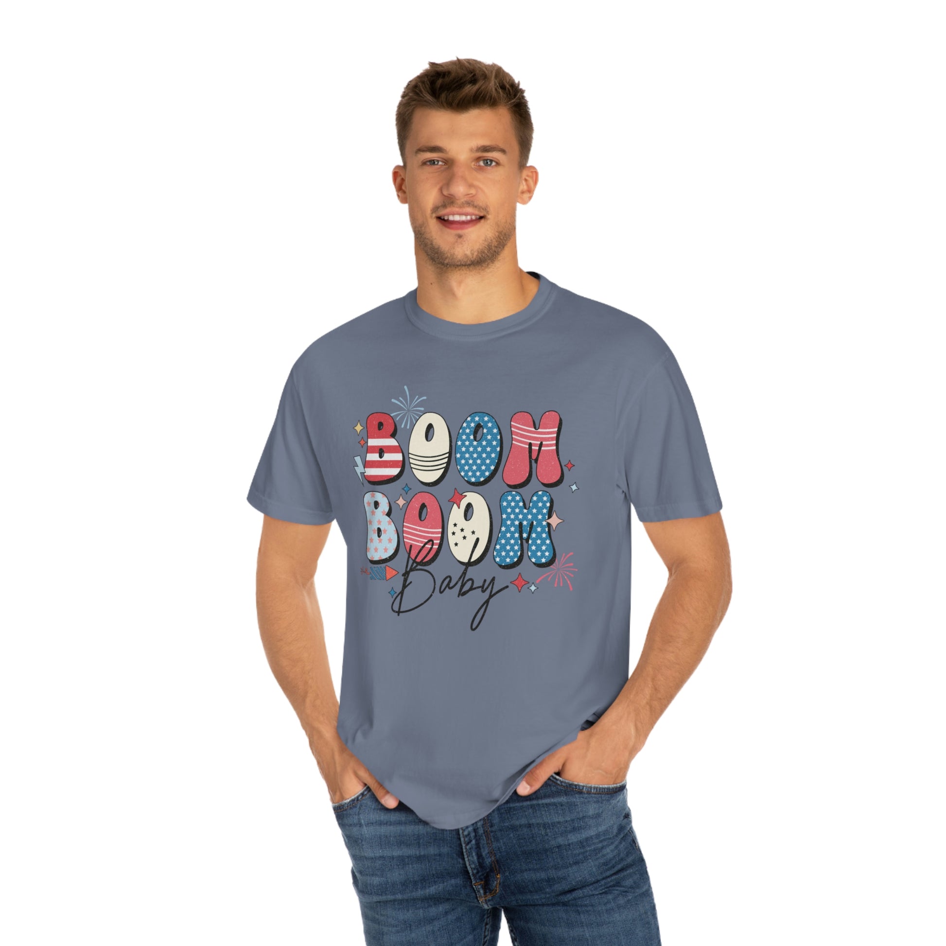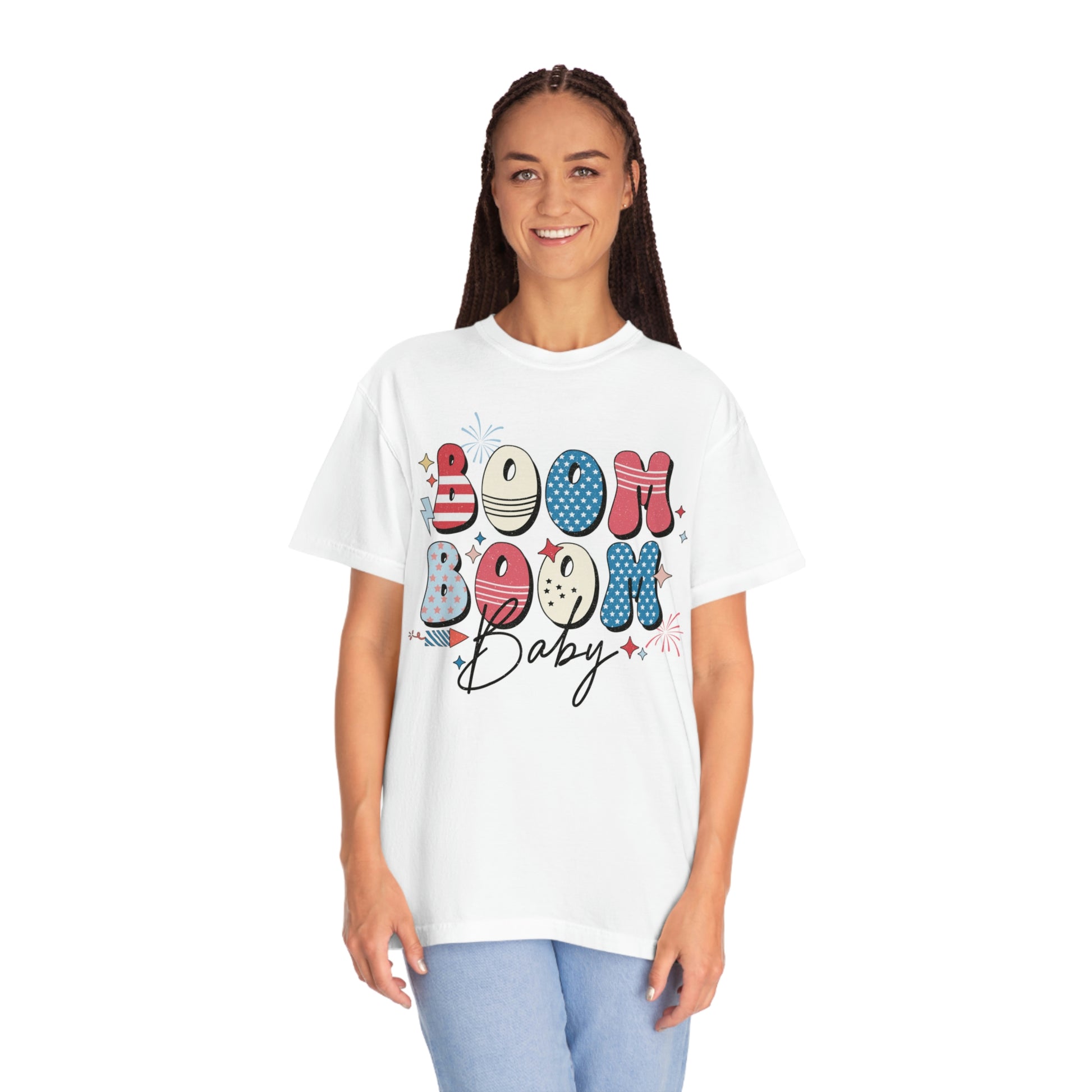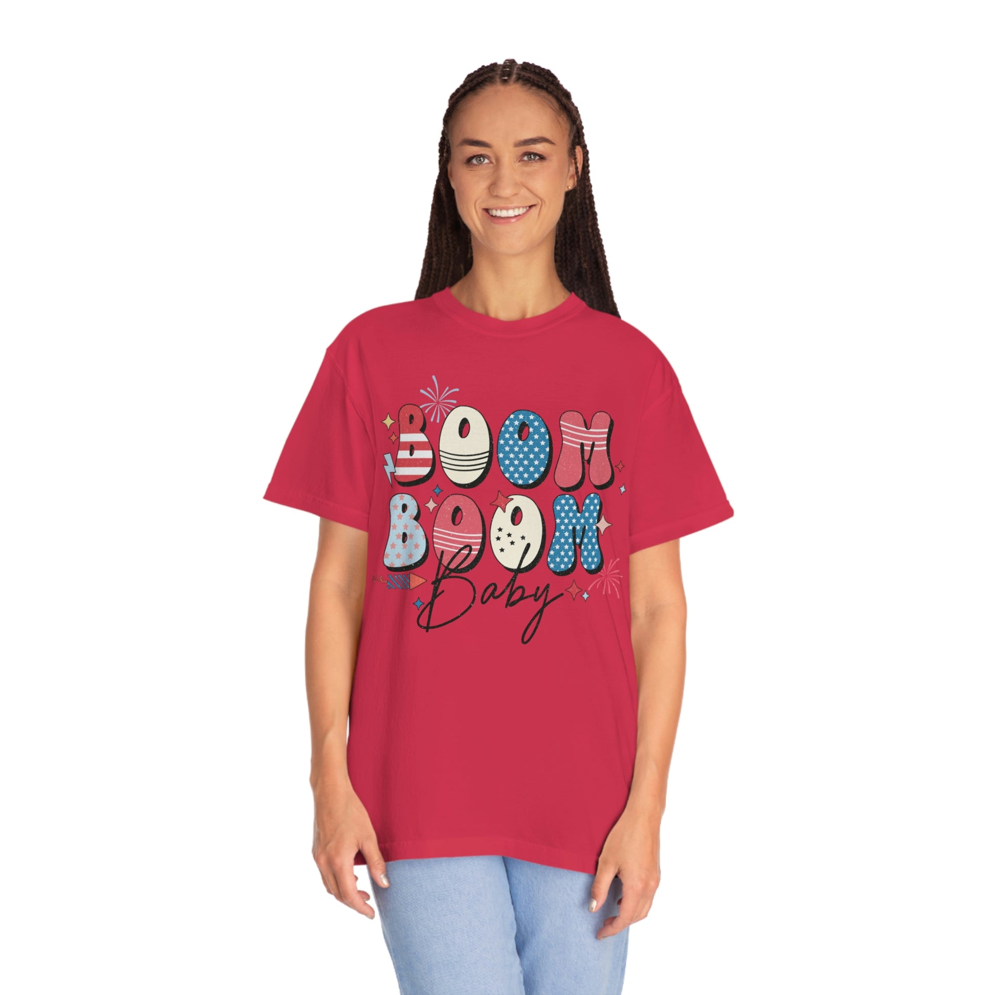 This classic Comfort Colors tshirt is a perfect way to show off your patriotism with style. You'll look simply stylish and make a statement this 4th of July. Featuring the text "Boom Boom Baby" in retro font, it will pair perfectly with all your favorite denim or shorts. The lightweight pre-shrunk cotton fabric is breathable, comfortable and will have you feeling relaxed all Summer long. Show some love for your country and wear it with pride this Memorial Day, Independence Day, Labor Day or any festive BBQ.
