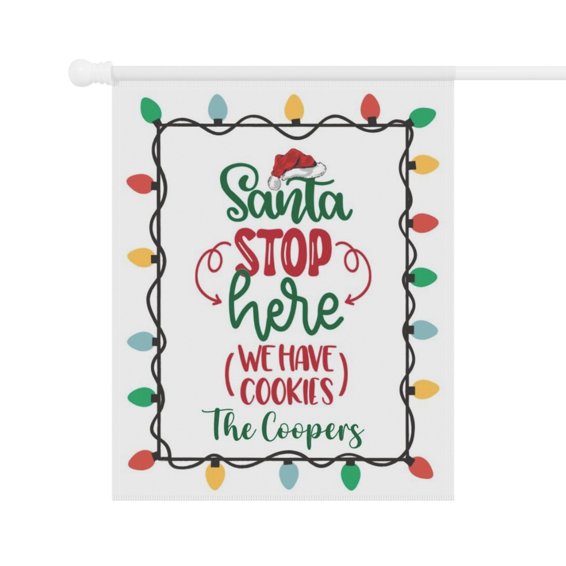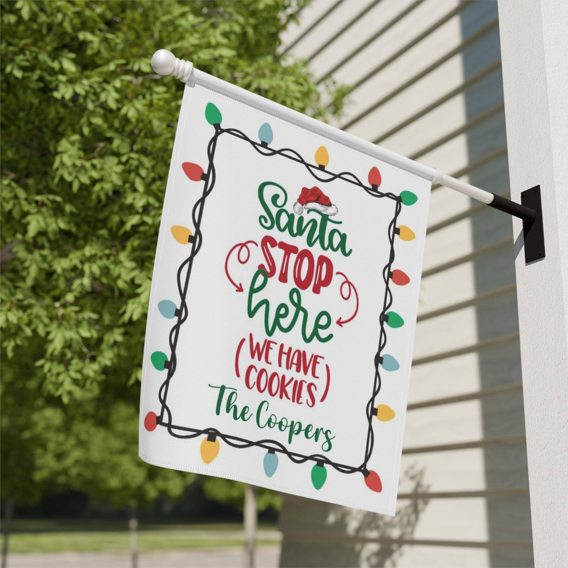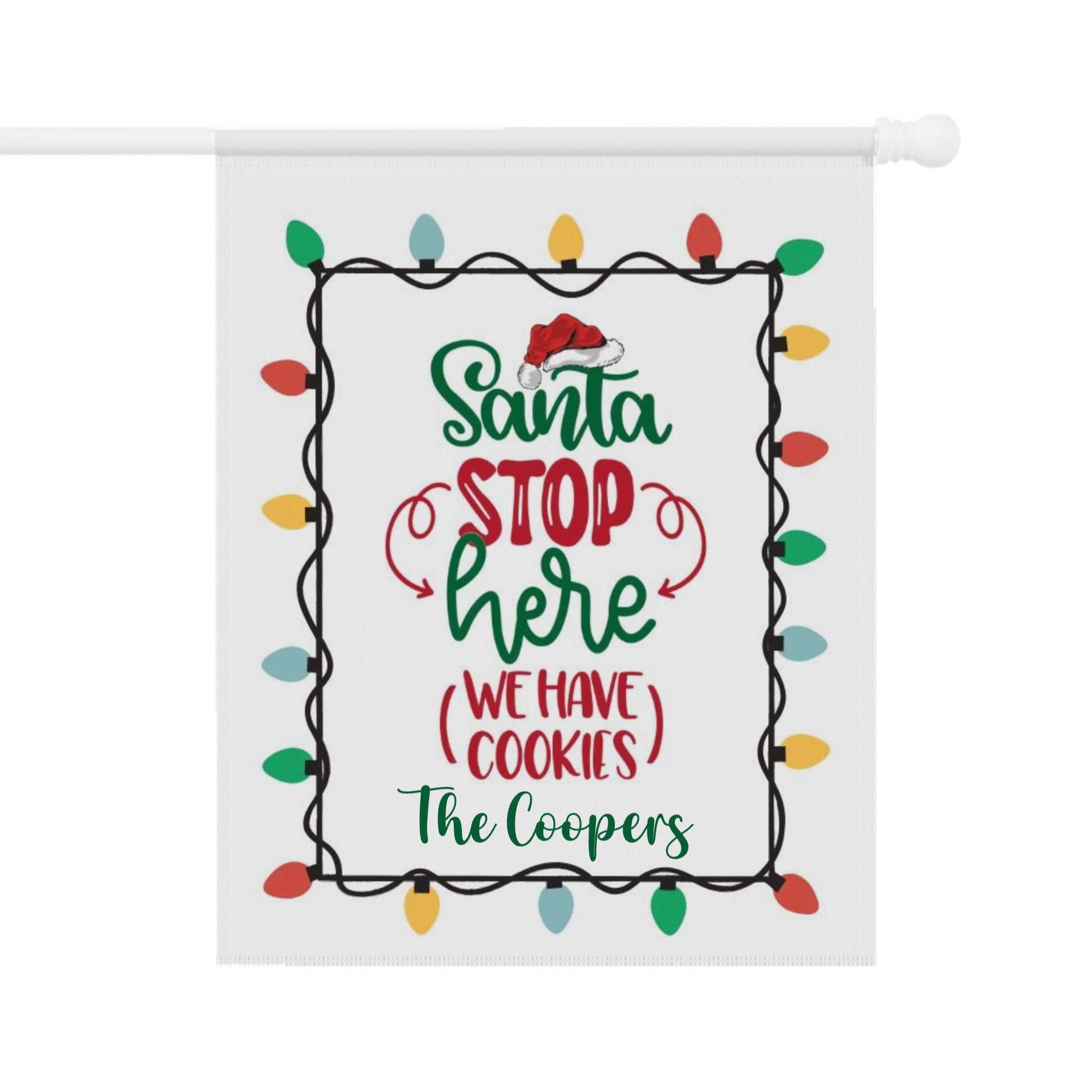 Celebrate the Christmas with our very popular Santa Stop Here House Flag. Customize this house flag with your own name. This banner is the perfect gift your favorite Holiday dinner hosts, gardener or present lover.