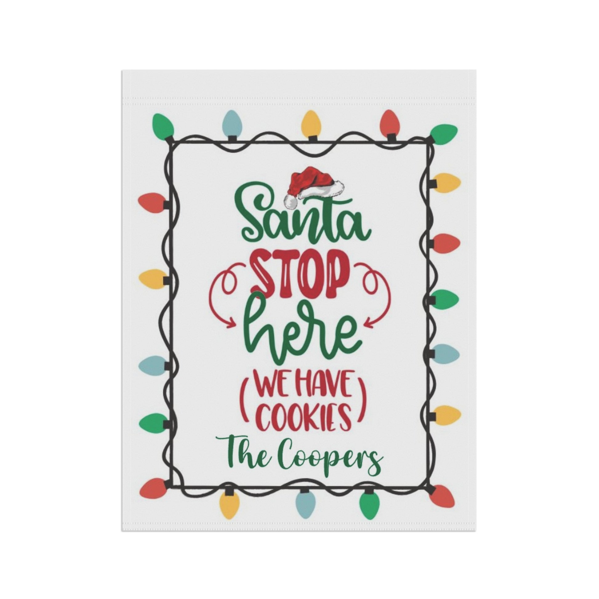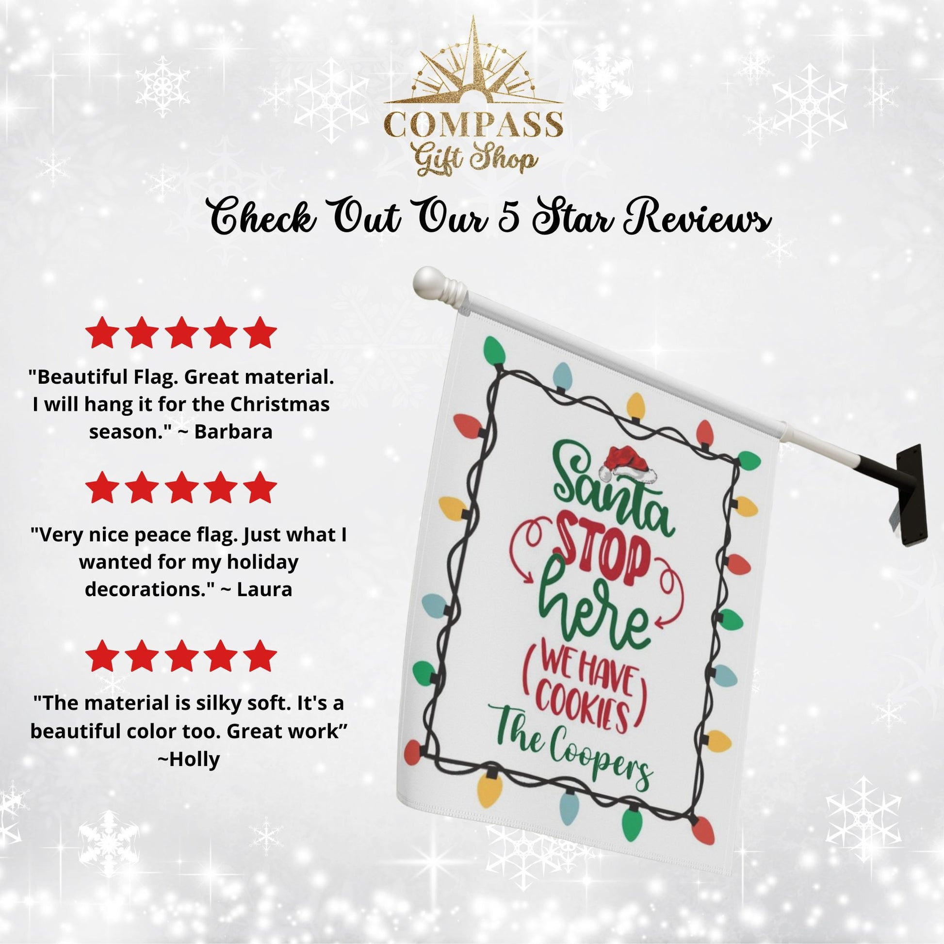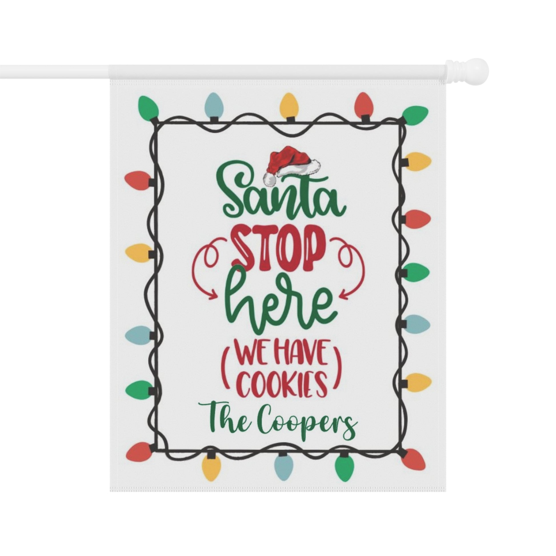 Celebrate the Christmas with our very popular Santa Stop Here House Flag. Customize this house flag with your own name. This banner is the perfect gift your favorite Holiday dinner hosts, gardener or present lover.