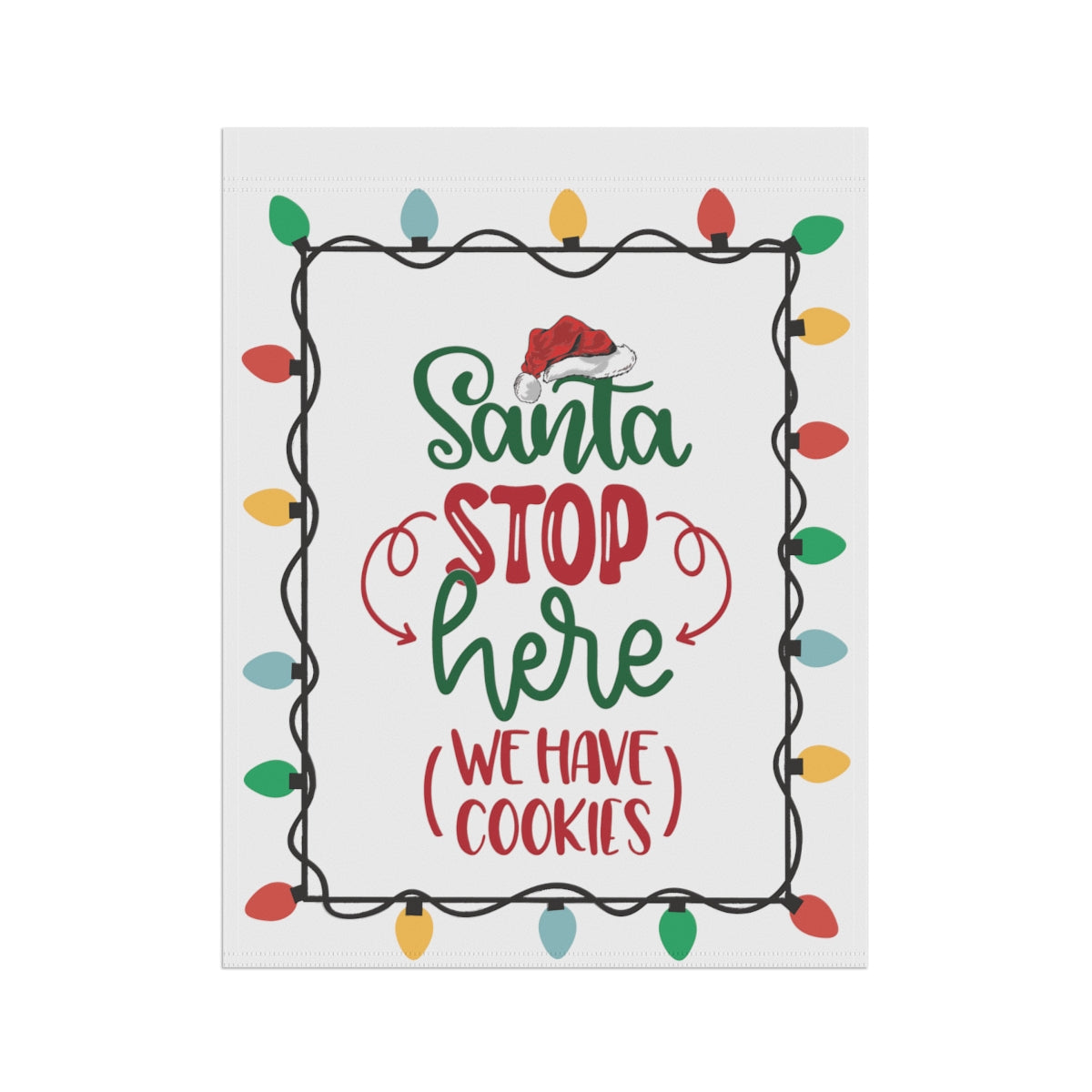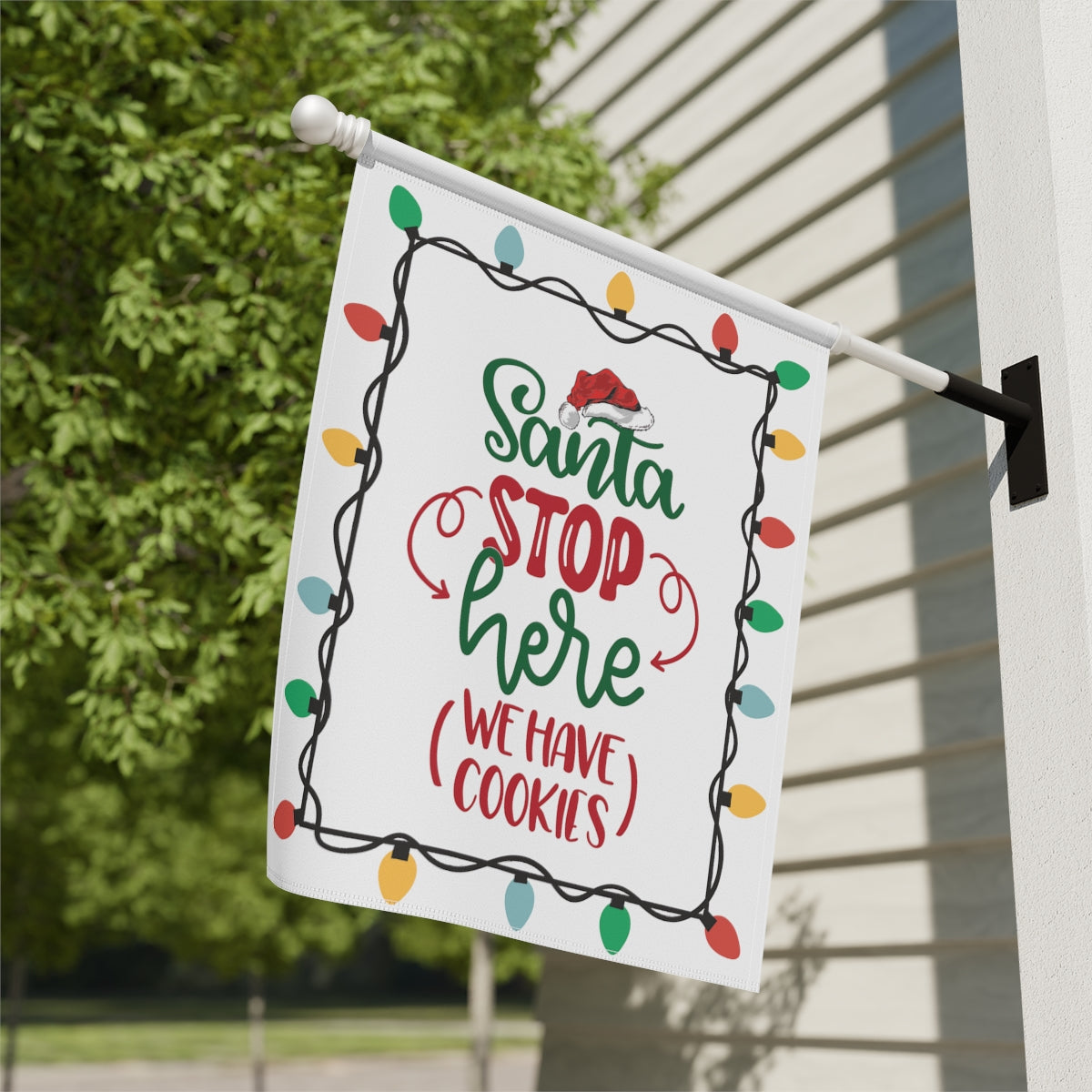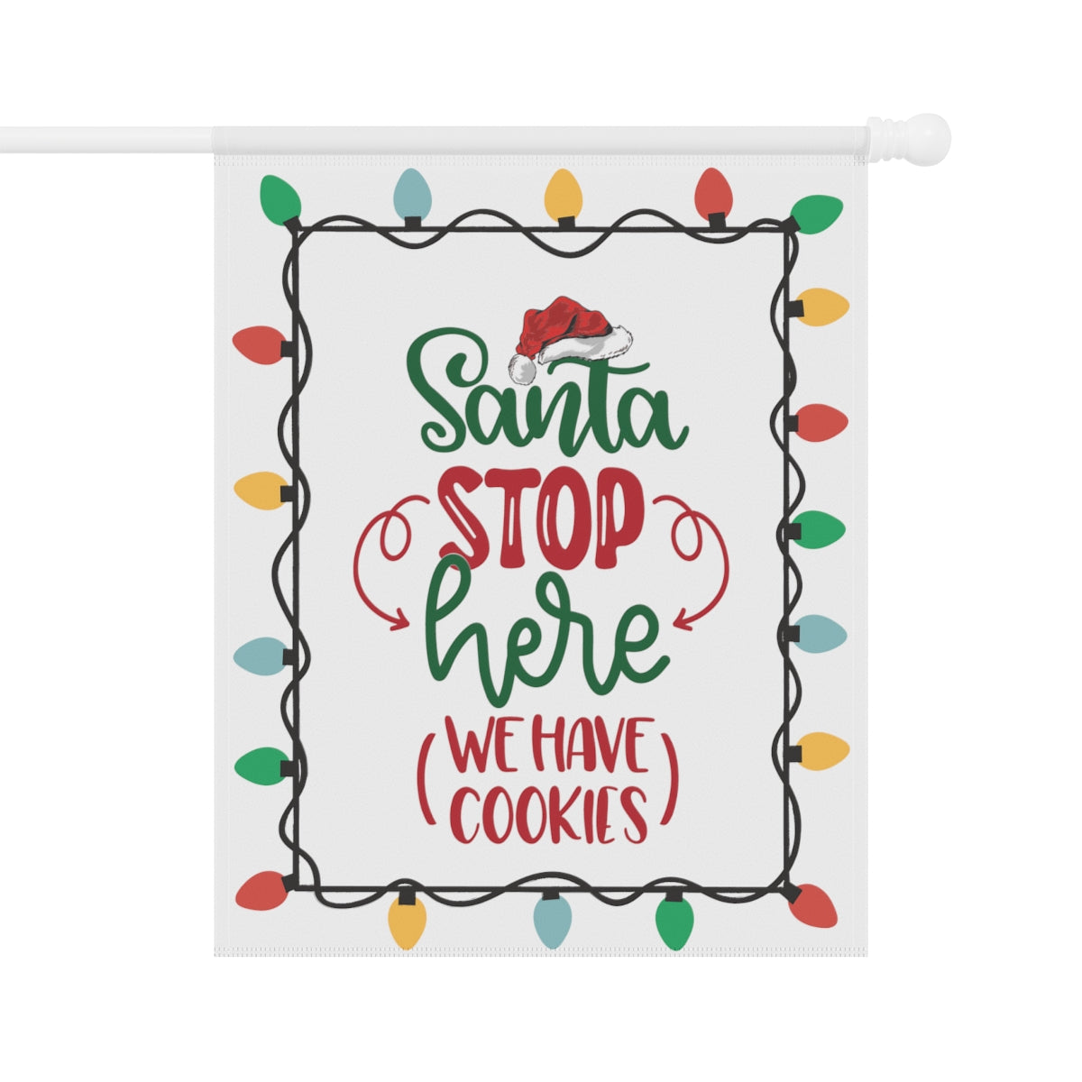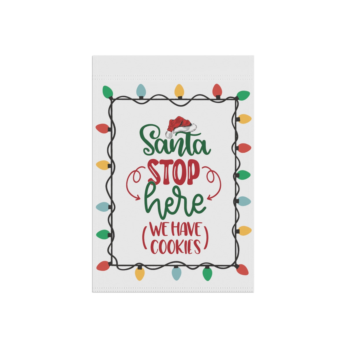 Celebrate the Holidays with this cute "Santa Stop Here We Have Cookies" Flag. Perfect for the garden or the house, this flag comes in two different sizes: 12" x 18" and 24.5" x 32". This flag is the perfect gift your favorite Holiday dinner hosts. ABOUT THIS ITEM: Help anyone transform their homestead or garden with a simple addition. Made with lightweight yet highly durable poly poplin-canvas fabric, these banners feel premium to the touch and will oversee your home for years on end. .: 100% Poly poplin-canvas fabric .: The same design printed on both sides .: Two sizes (12'' × 18'' and 24.5'' × 32'') .: Black inside lining .: Features sleeve at top .: All over print .: Pole not included