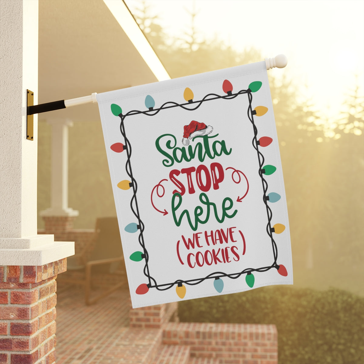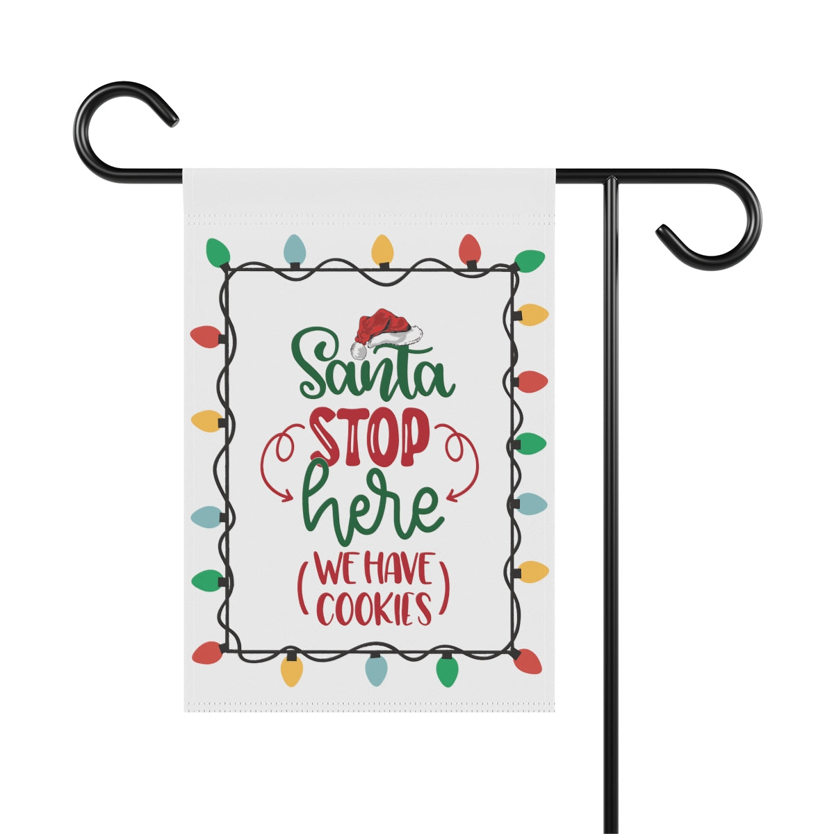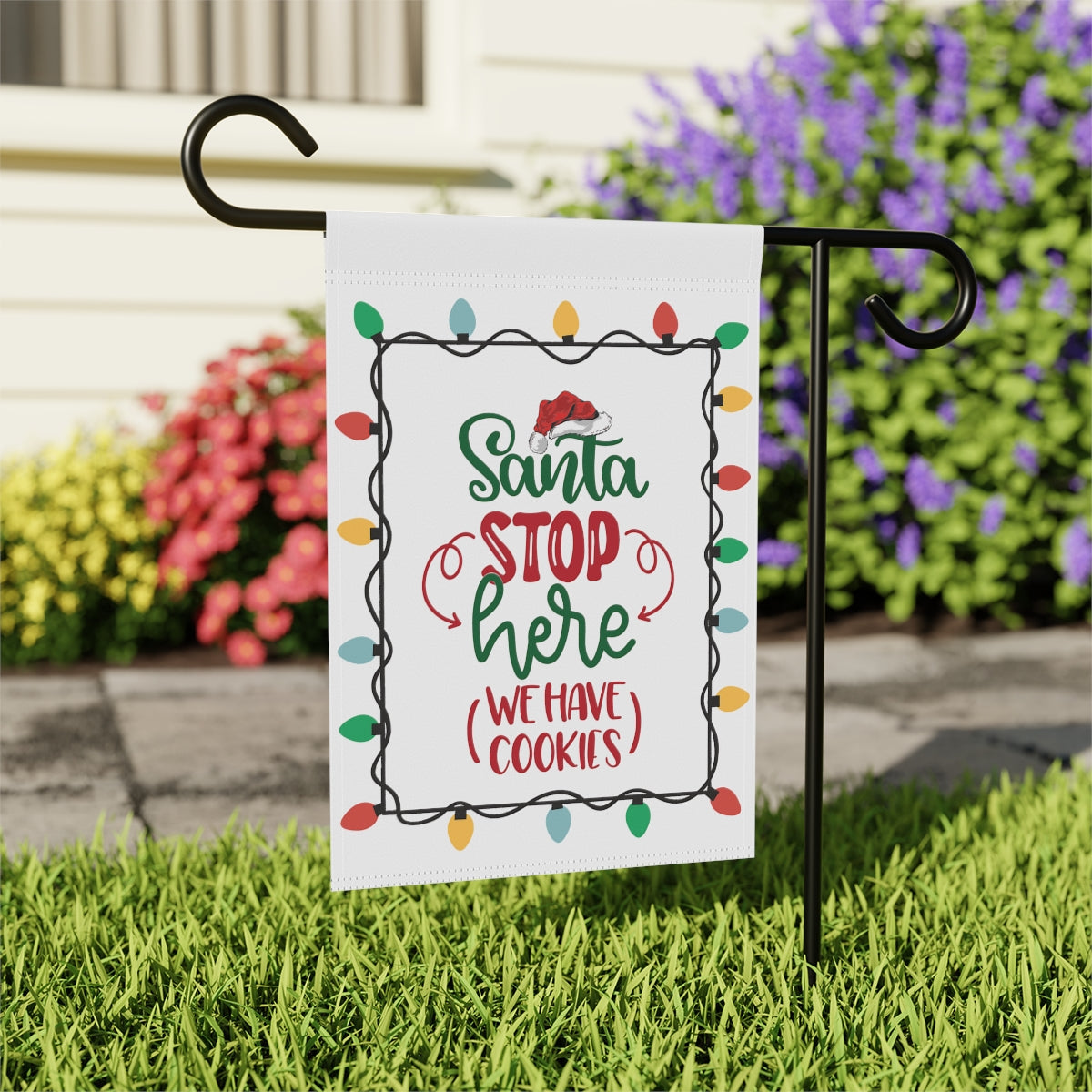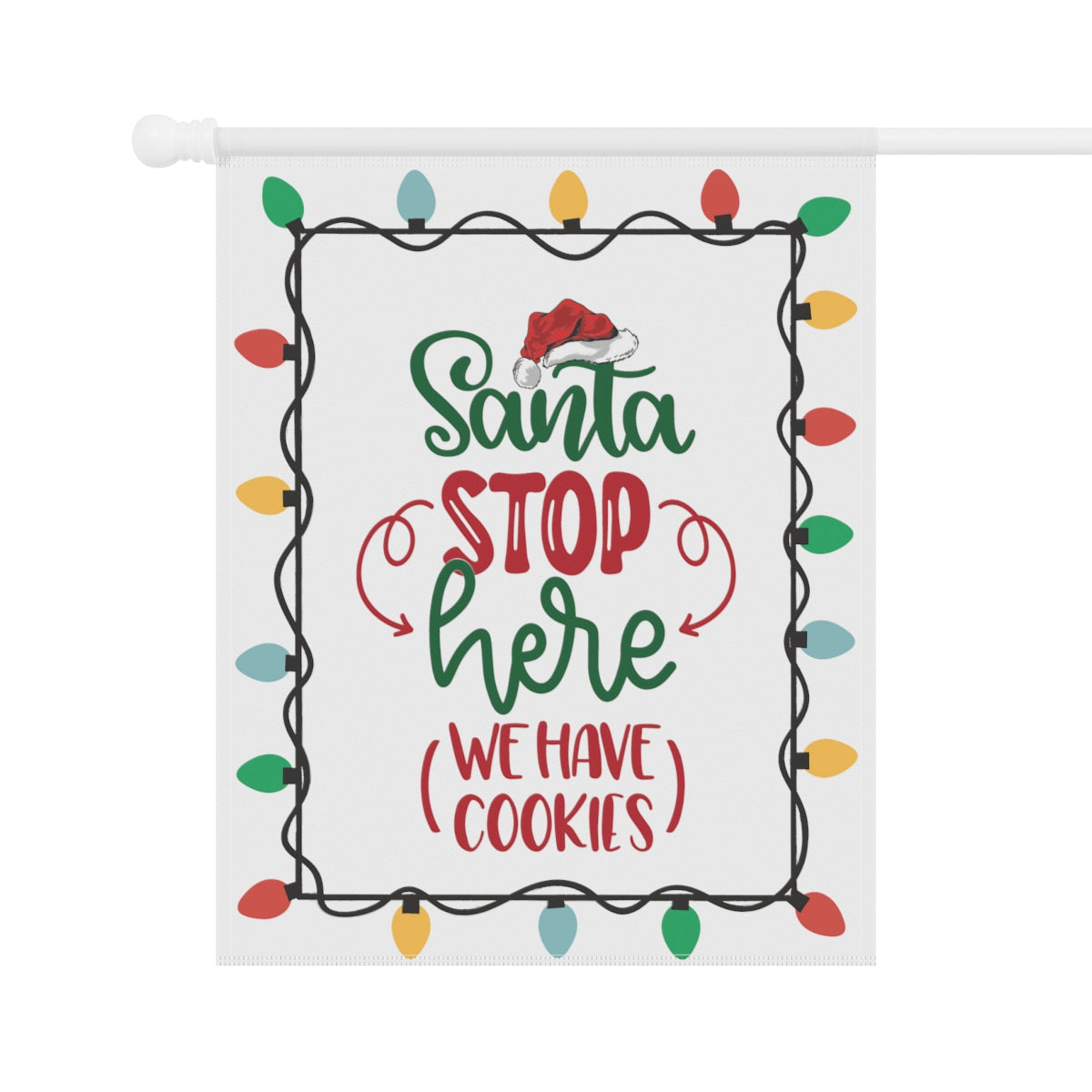 Celebrate the Holidays with this cute "Santa Stop Here We Have Cookies" Flag. Perfect for the garden or the house, this flag comes in two different sizes: 12" x 18" and 24.5" x 32". This flag is the perfect gift your favorite Holiday dinner hosts. ABOUT THIS ITEM: Help anyone transform their homestead or garden with a simple addition. Made with lightweight yet highly durable poly poplin-canvas fabric, these banners feel premium to the touch and will oversee your home for years on end. .: 100% Poly poplin-canvas fabric .: The same design printed on both sides .: Two sizes (12'' × 18'' and 24.5'' × 32'') .: Black inside lining .: Features sleeve at top .: All over print .: Pole not included