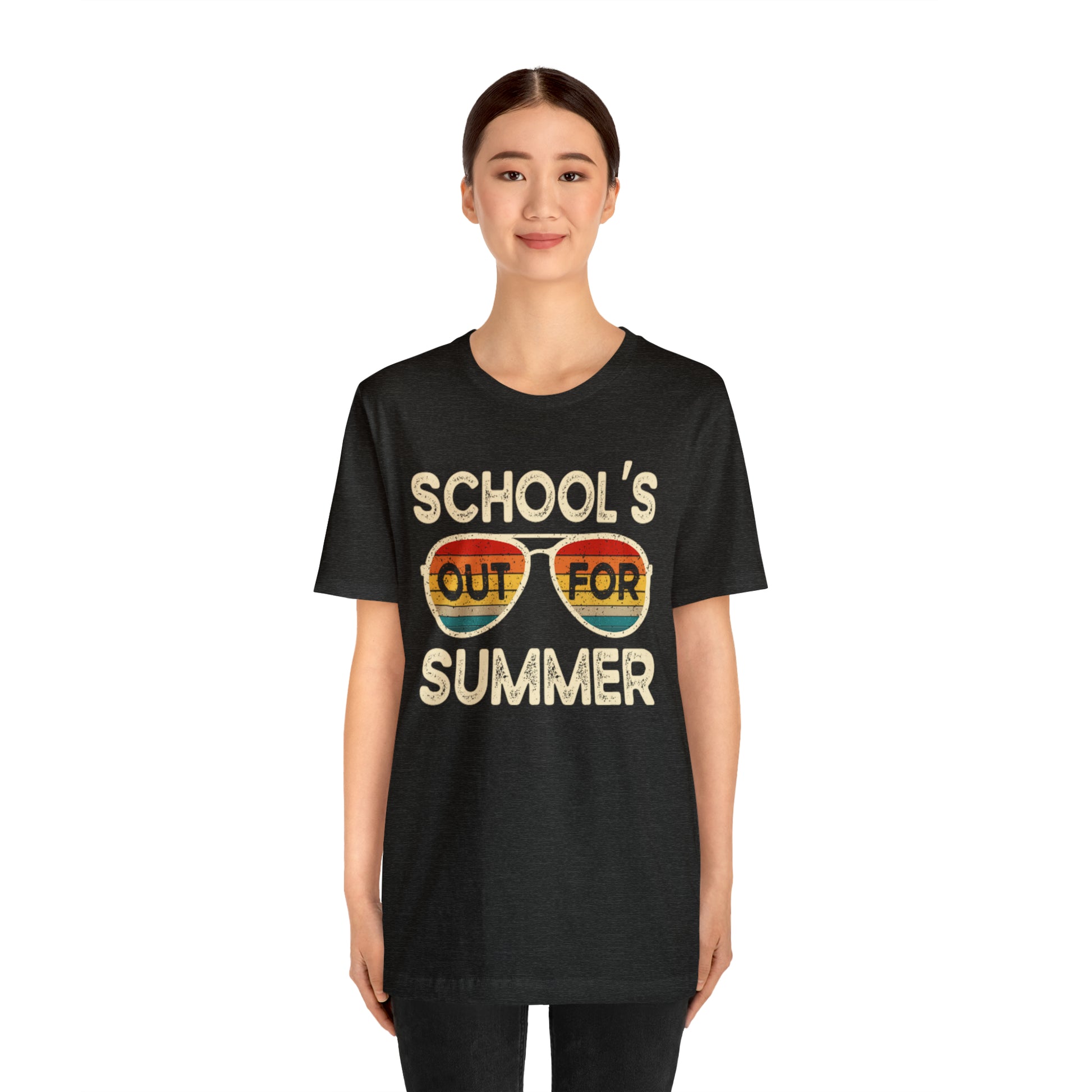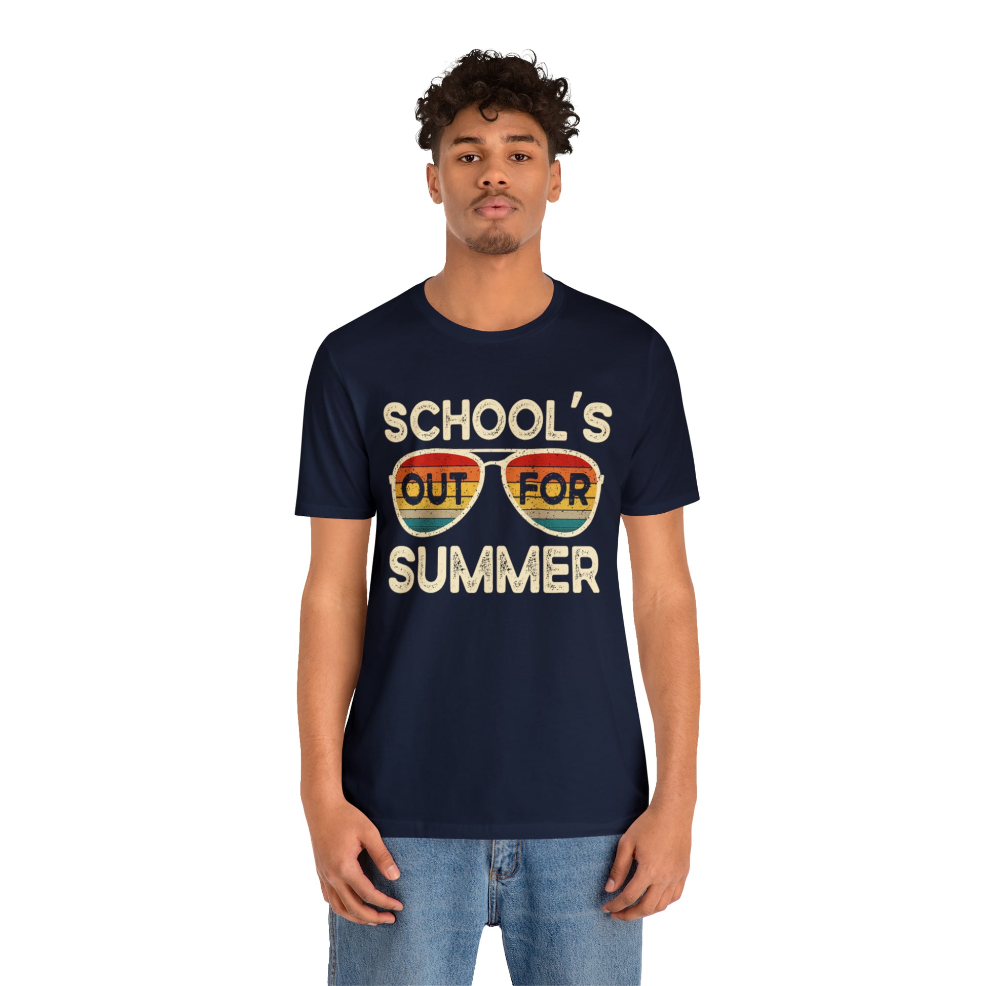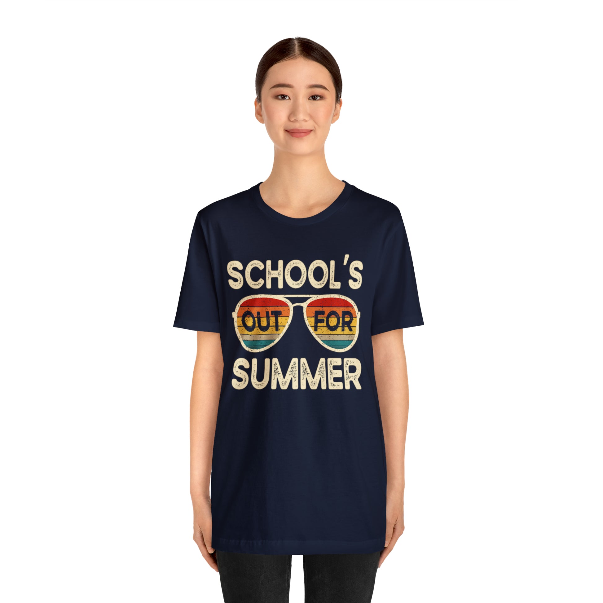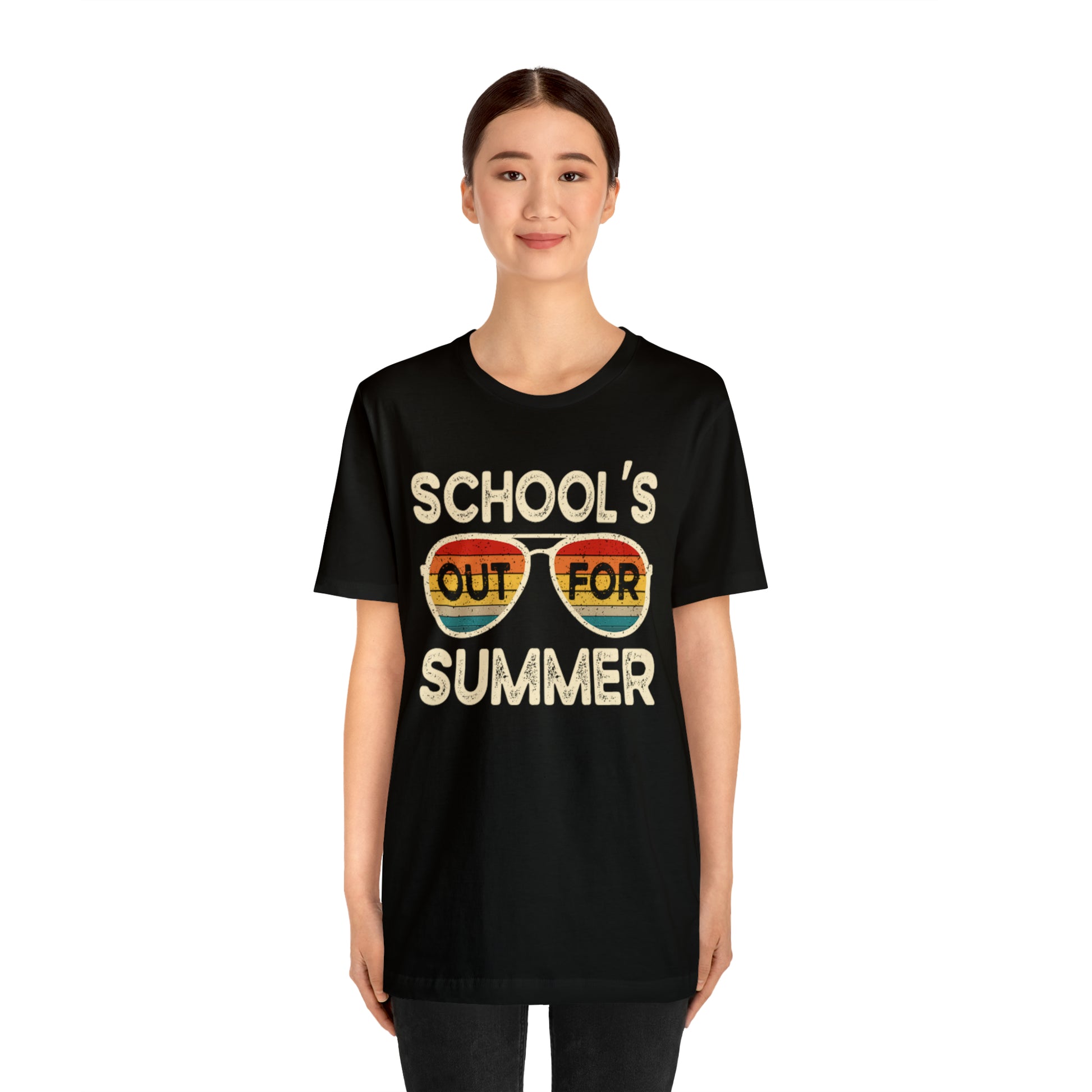 Celebrate the end of school with this retro "Schools Out for Summer" design. This classic, 80's inspired t-shirt is perfect for the summer season! Featuring a bold graphic of retro sunglasses, it will have you reminiscing about those sunny days spent in the playground. Crafted in super-soft cotton, the garment has a relaxed fit for added comfort and cool. Layer with jeans, shorts or skirts, and be sure to add some larger-than-life shades! Be the envy of your friends and rock this vintage look all summer long.