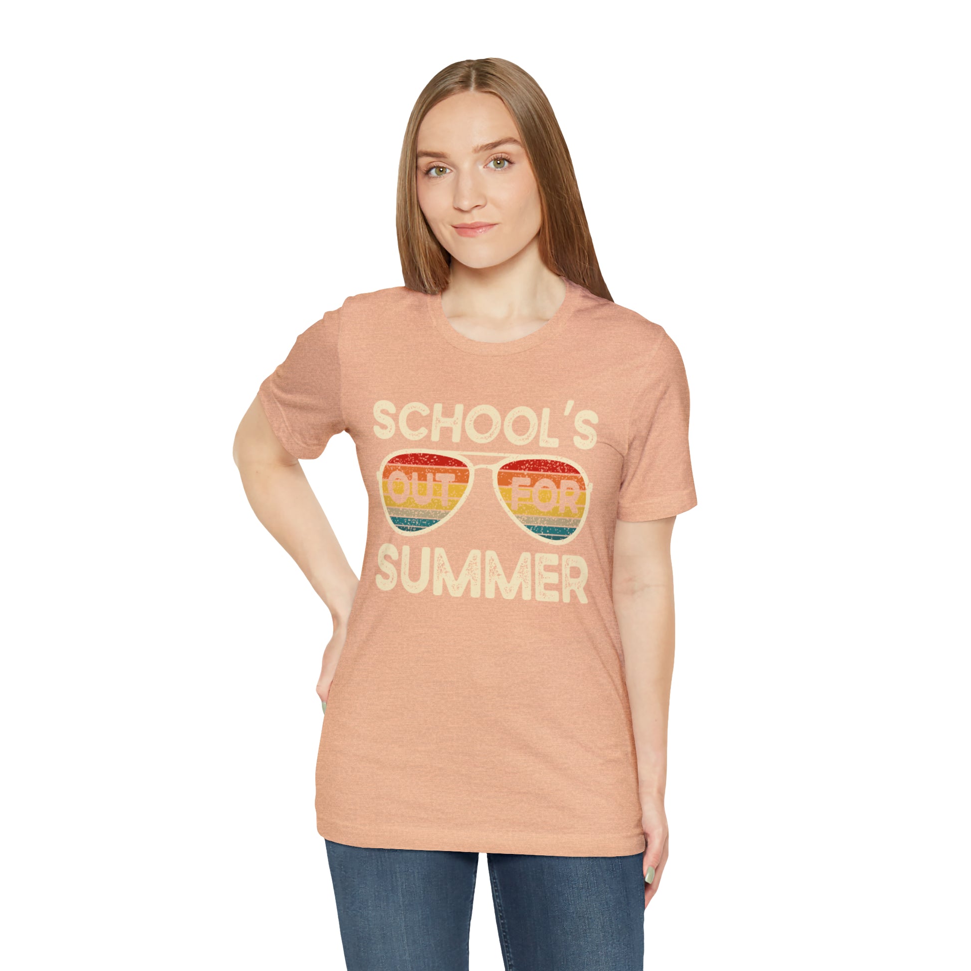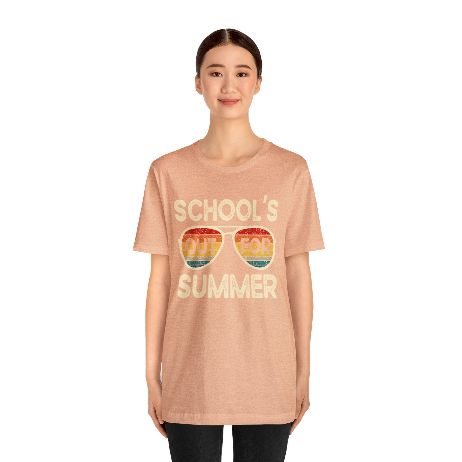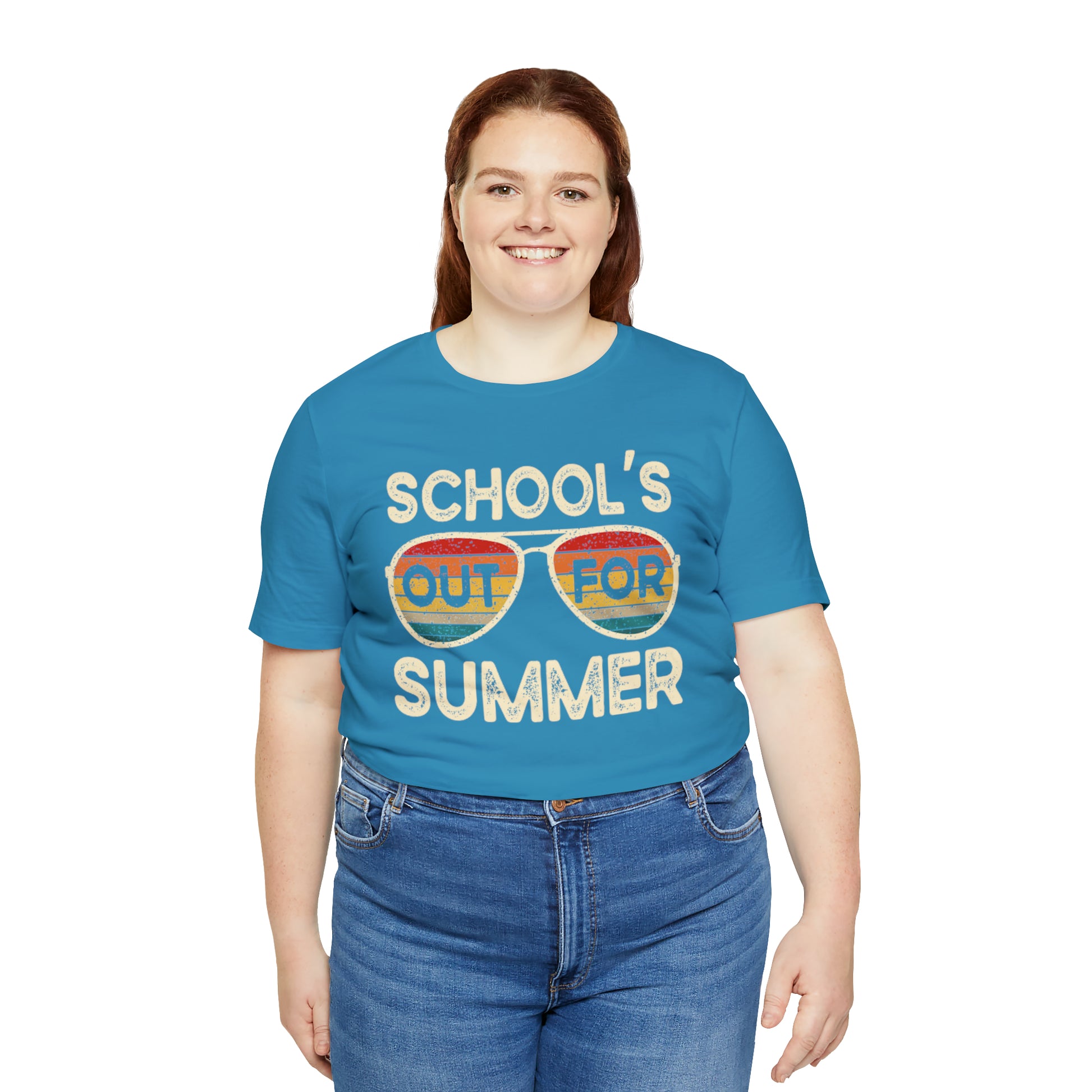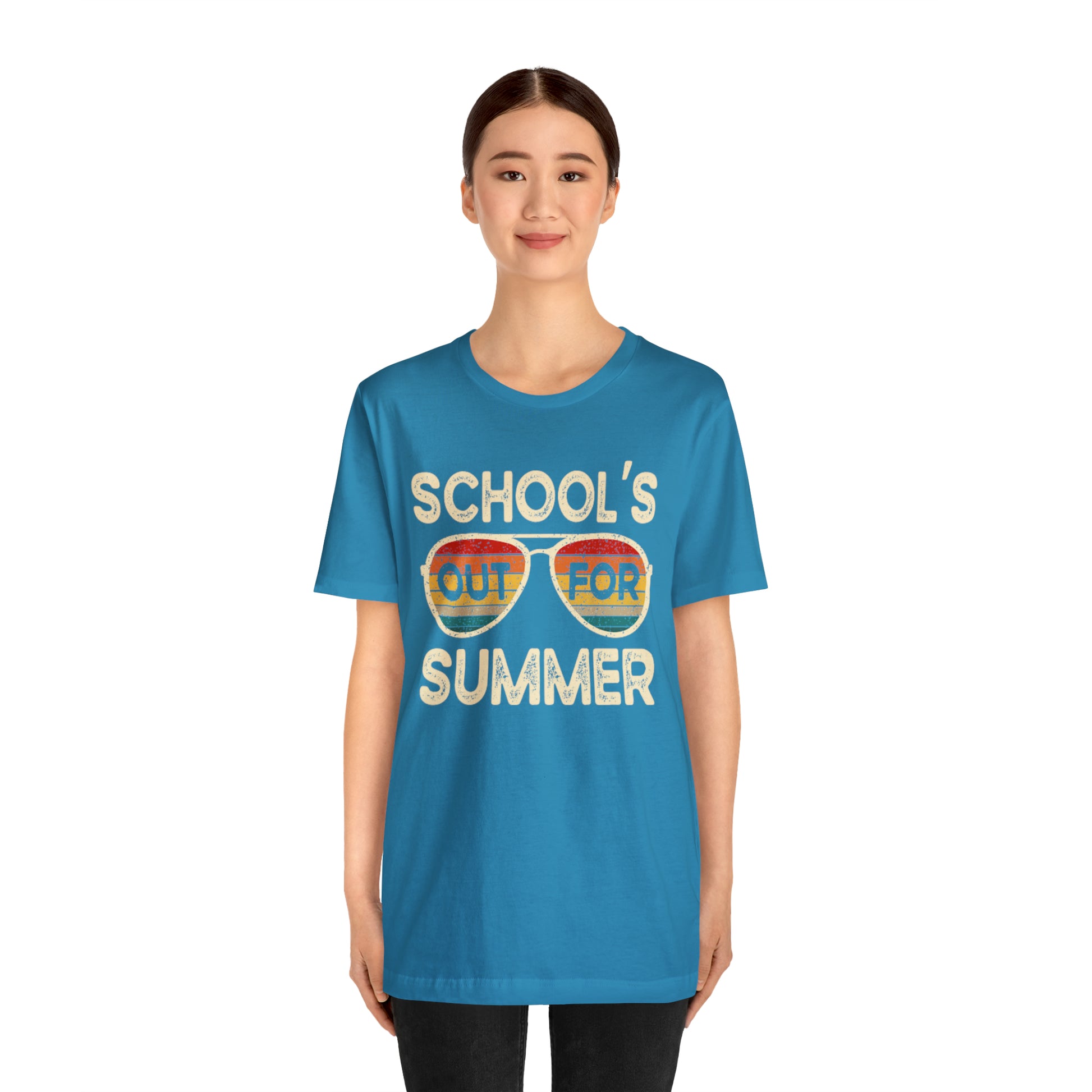 Celebrate the end of school with this retro "Schools Out for Summer" design. This classic, 80's inspired t-shirt is perfect for the summer season! Featuring a bold graphic of retro sunglasses, it will have you reminiscing about those sunny days spent in the playground. Crafted in super-soft cotton, the garment has a relaxed fit for added comfort and cool. Layer with jeans, shorts or skirts, and be sure to add some larger-than-life shades! Be the envy of your friends and rock this vintage look all summer long.