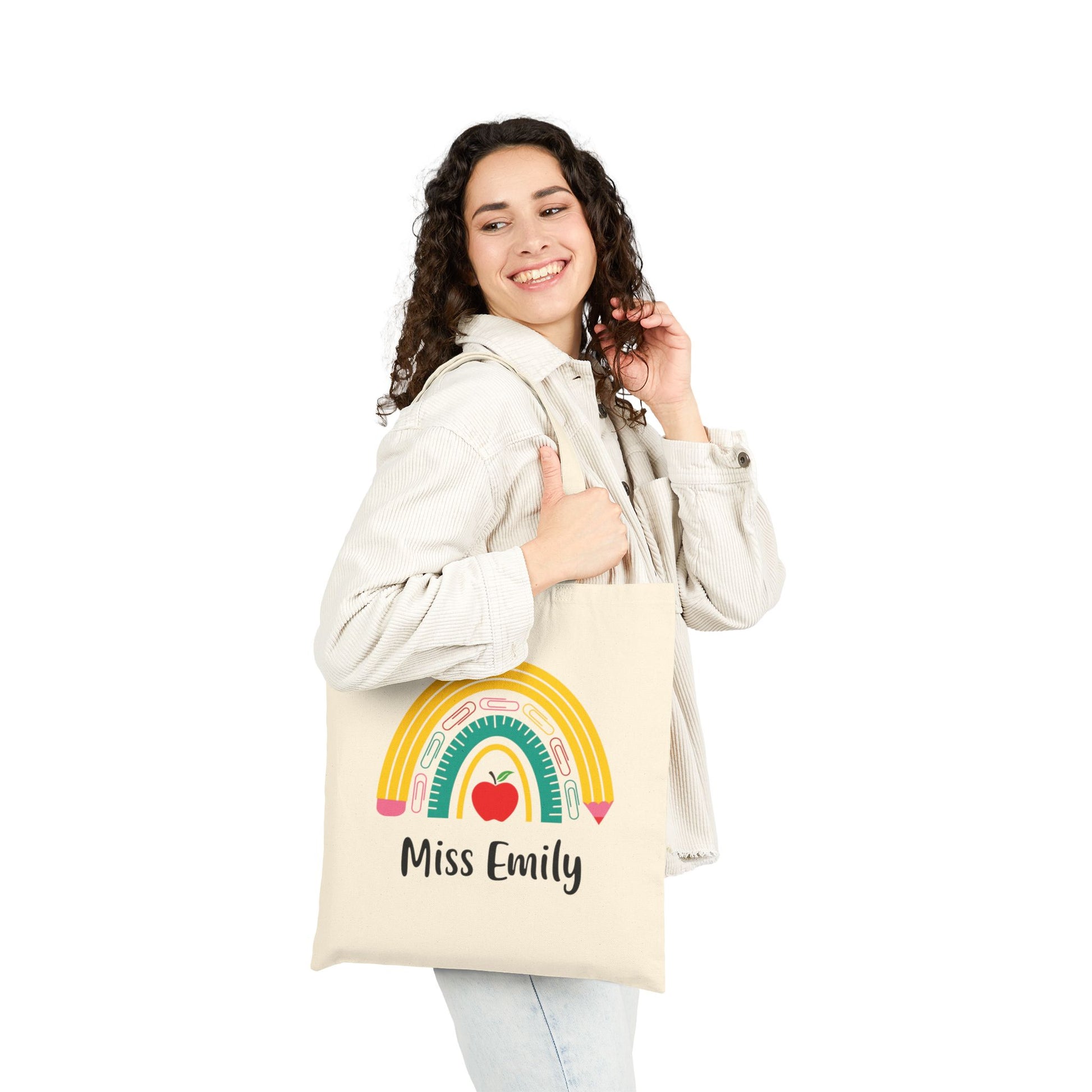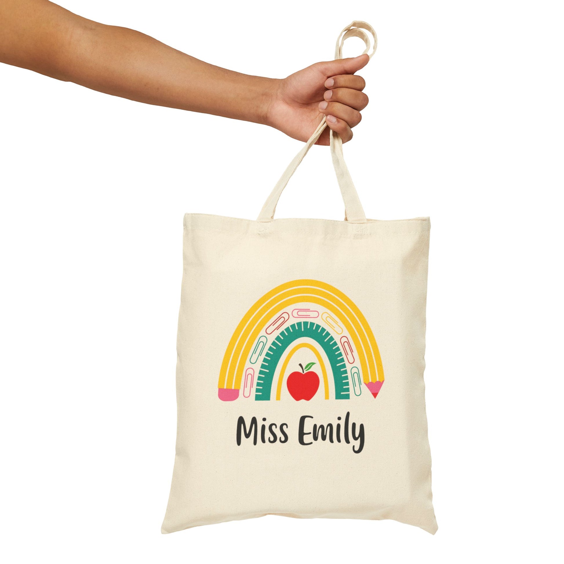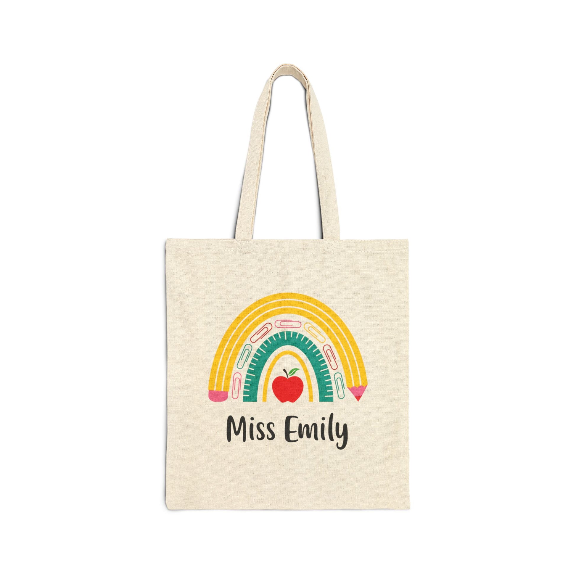 Elevate your teacher's style with our Personalized Teacher's Rainbow Tote Bag featuring a charming rainbow pencil, ruler and paperclip design. This tote bag is not only fashionable but also functional with plenty of space for everyday essentials. Make it truly special by adding their name, creating a unique and thoughtful gift for any teacher for Teacher Appreciation, Back to School, Christmas or the Holiday Season.