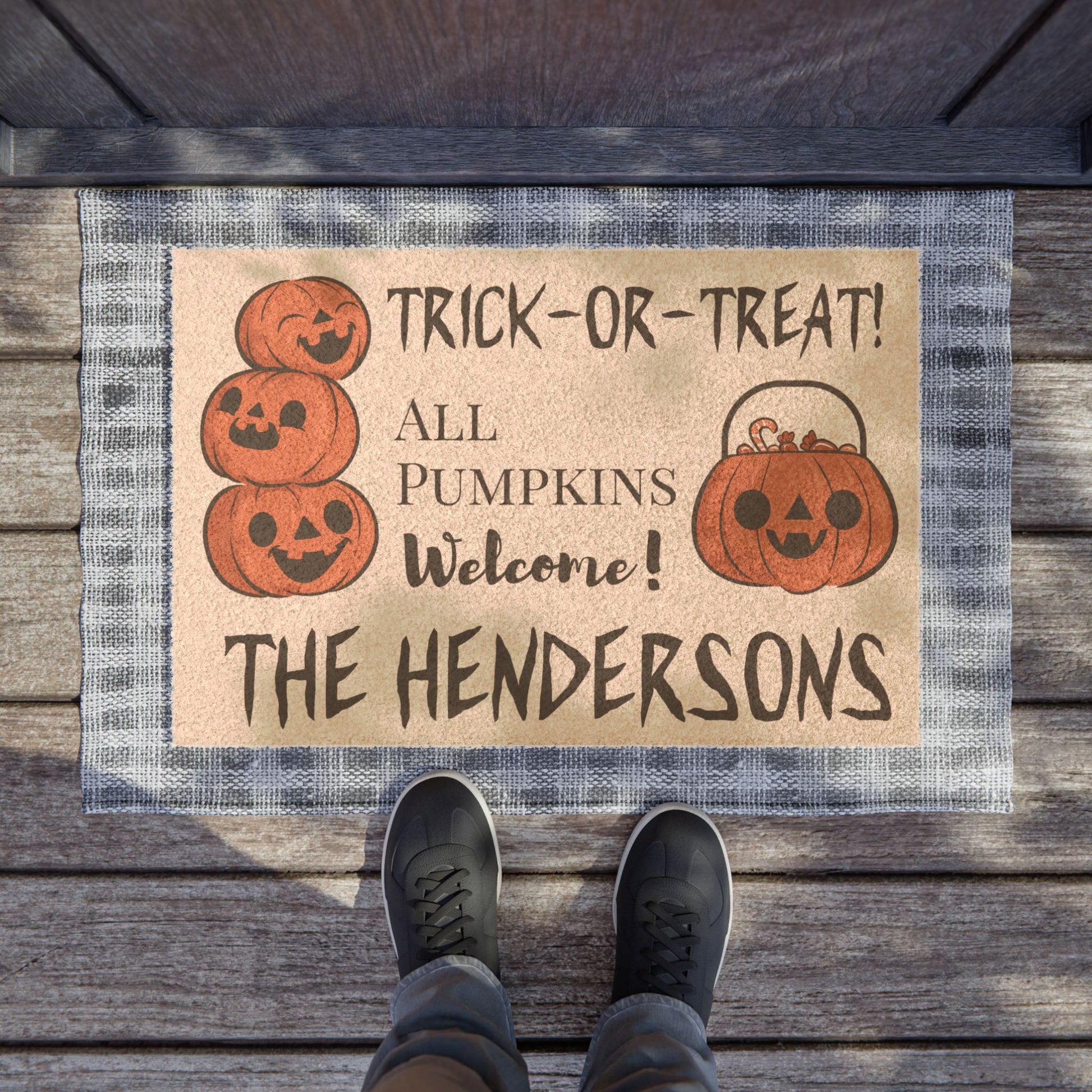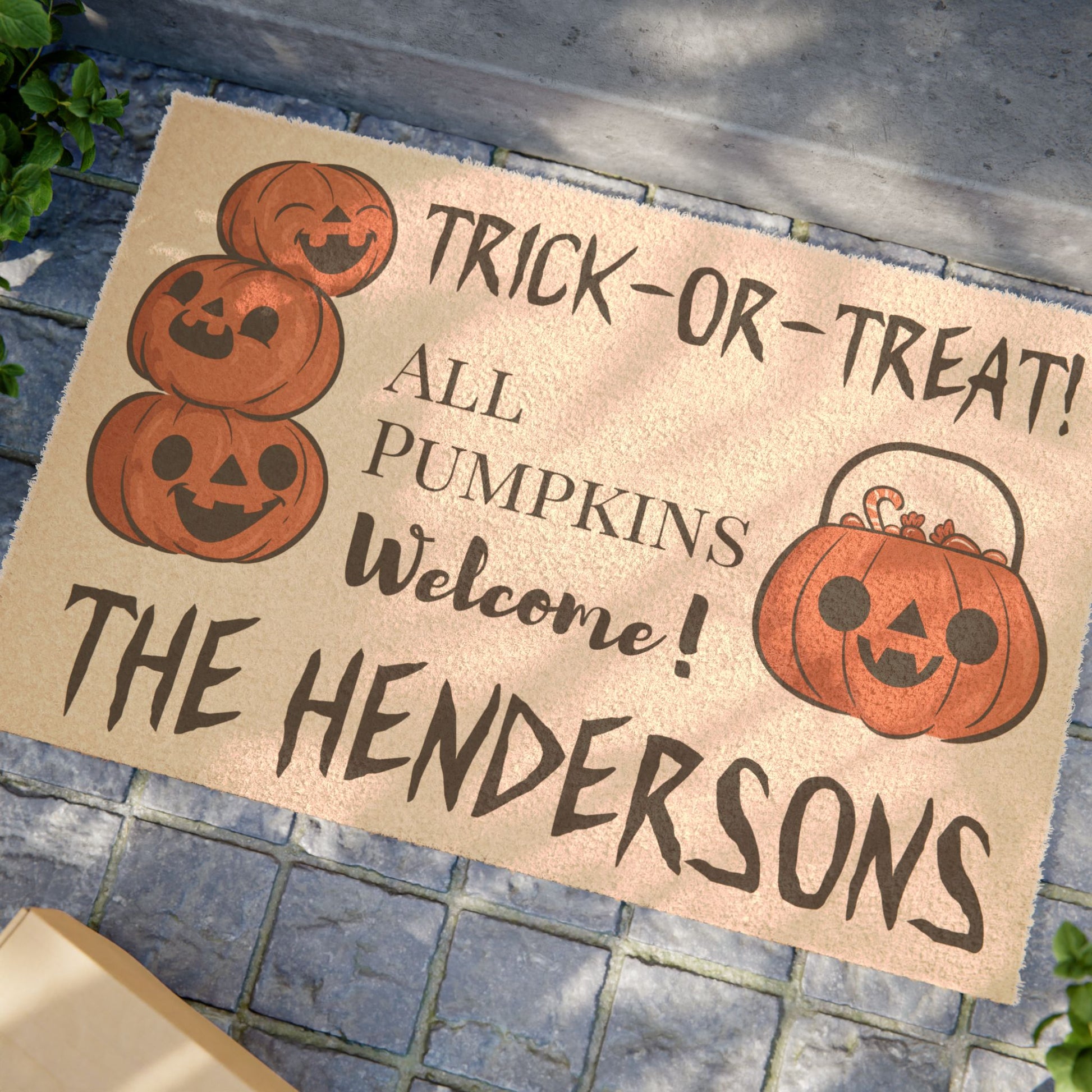 Get ready to greet the neighborhood pumpkins this Halloween with our customize Trick or Treat All Pumpkins Welcome door mat. This premium doormat is perfect for your Halloween party. Meet the perfect welcoming doormat that you can now fully personalize. Made from durable materials, this doormat can be customized using UV printing to add your family name.