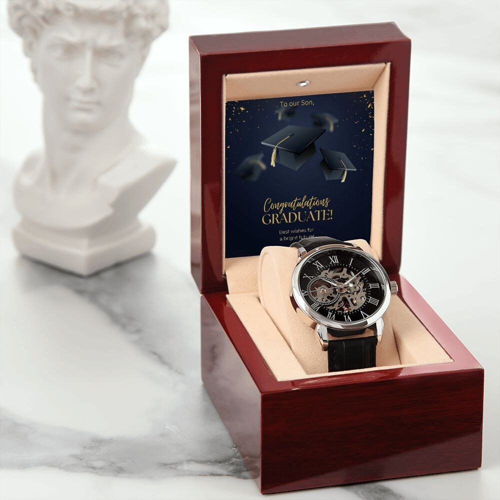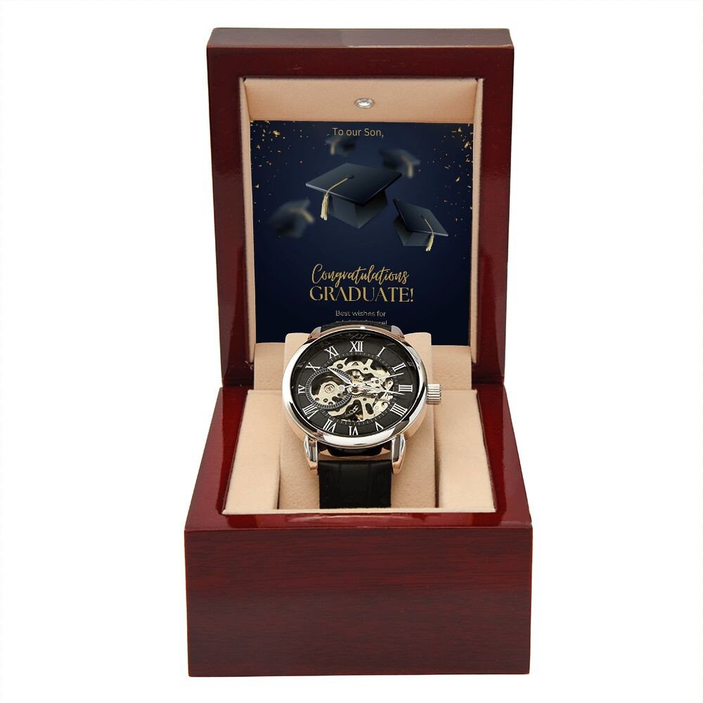 Give the gift of luxury with this handsome and daring timepiece. The Men's Openwork Watch is the perfect blend of classic design and modern styling, making it an essential accessory for your remarkable style. This watch sports a genuine leather strap, is splash resistant, and has increased durability thanks to hardened mineral glass. Our unique skeleton dial feature allows you to peer directly into the inner workings of your watch. Beautifully crafted to be automatic, this watch requires motion instead of batteries. You will keep precise time simply by wearing it, no winding necessary. This magnificent piece makes the perfect gift for yourself or any man in your life looking to add a tasteful element into his wardrobe. Your watch is lovingly packaged in our mahogany style luxury box for easy gifting.Product Specifications:Genuine Black Leather BandHardened Mineral Crystal Glass3 ATM Water ResistantMovement: AutomaticBand length: 200 mm (approximately 7.9")Adjustment length: 168 mm - 216 mm (6.6" - 8.5")