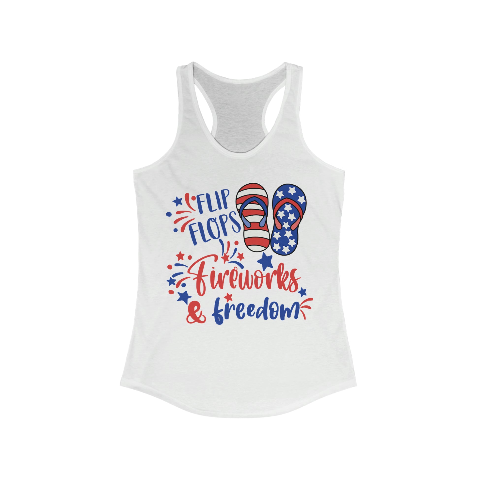 This Flip Flops Fireworks and Freedom shirt is the perfect summer look! It features a crisp white background, with bold blue lettering and colorful fireworks, to celebrate all that freedom stands for. This comfortable t-shirt looks great with shorts, sandals and sunnies, and dress it up with accessories for the nighttime. Fireworks, flip flops and freedom is a great way to show your independence and embrace the summer heat.